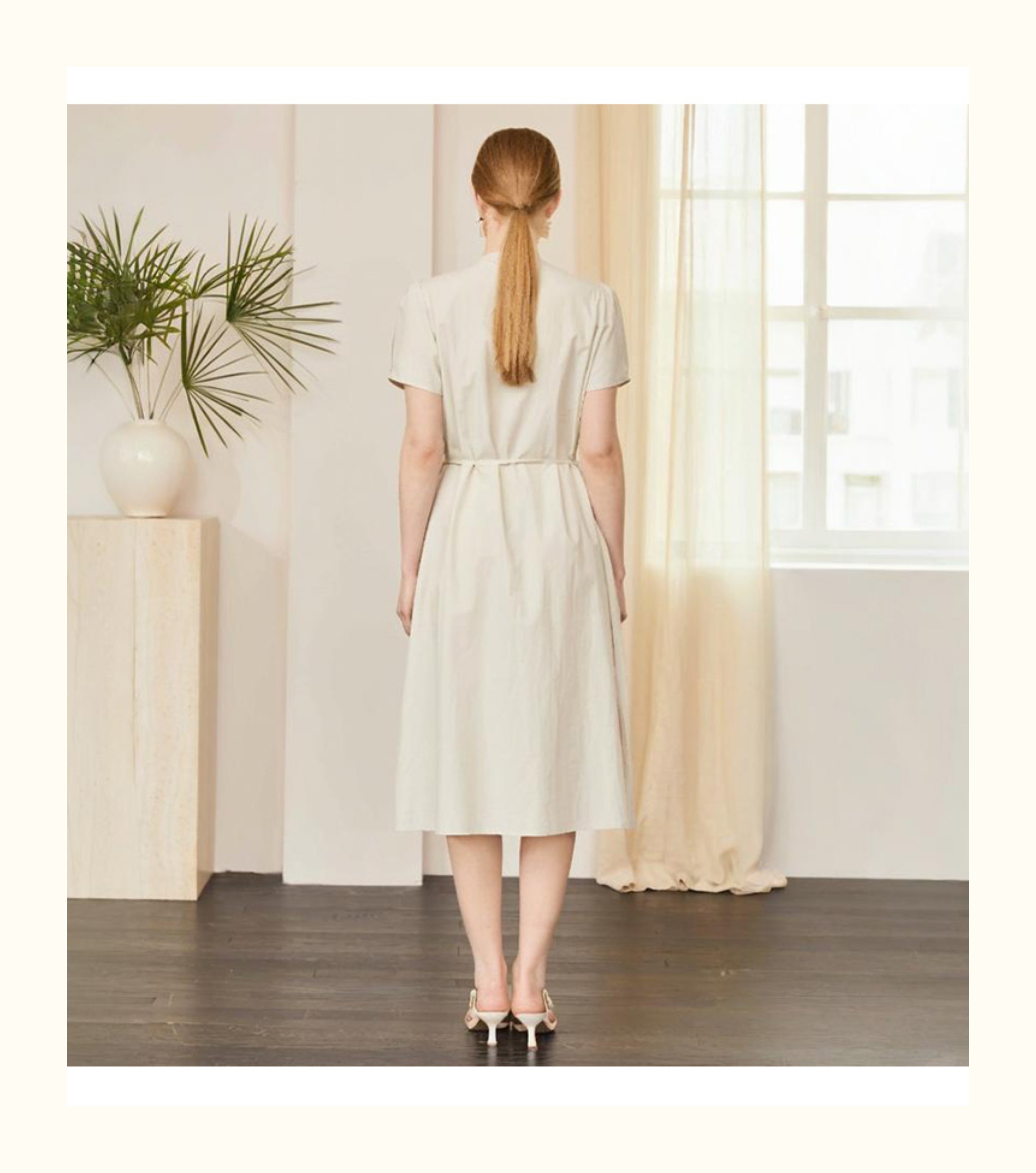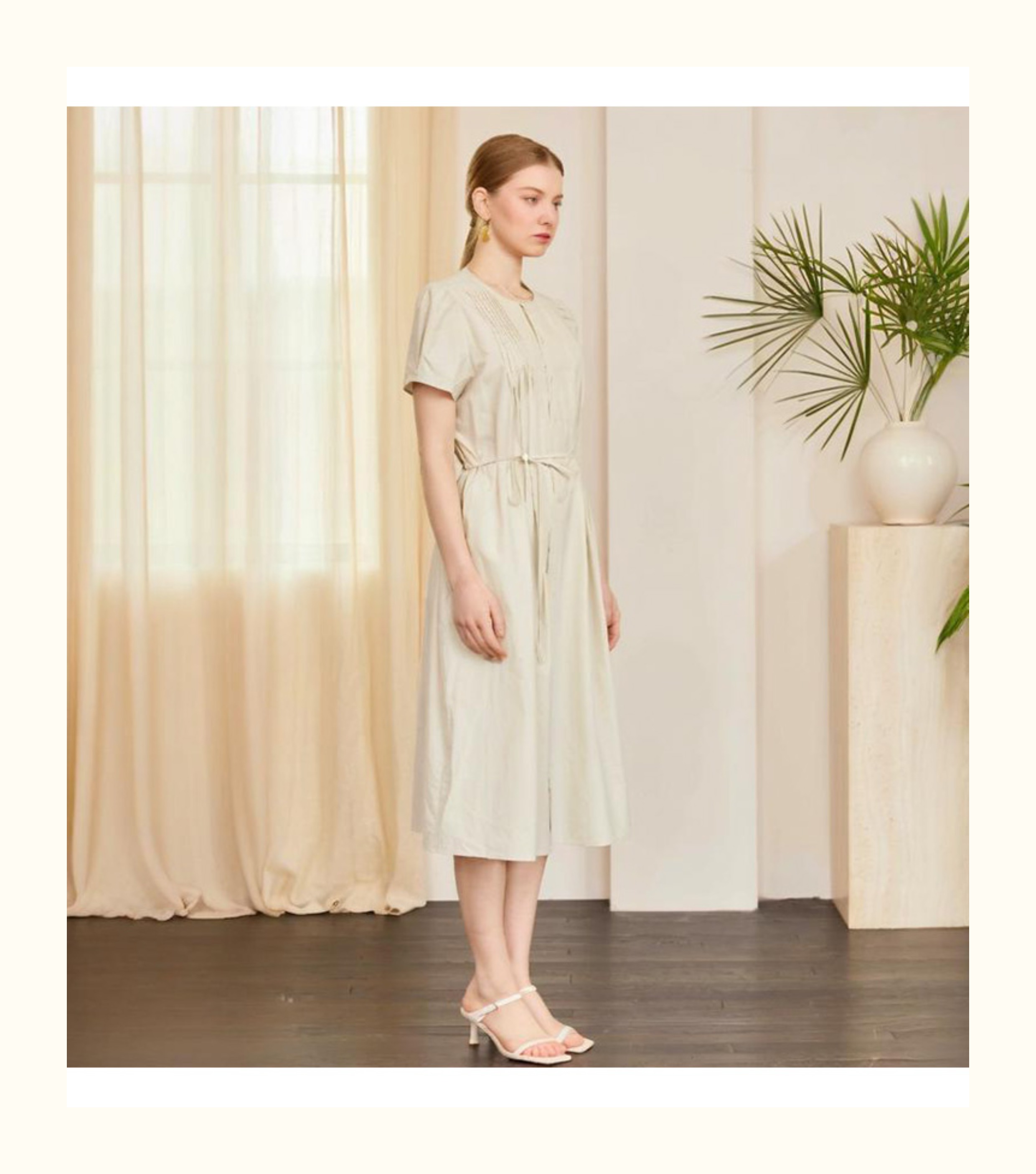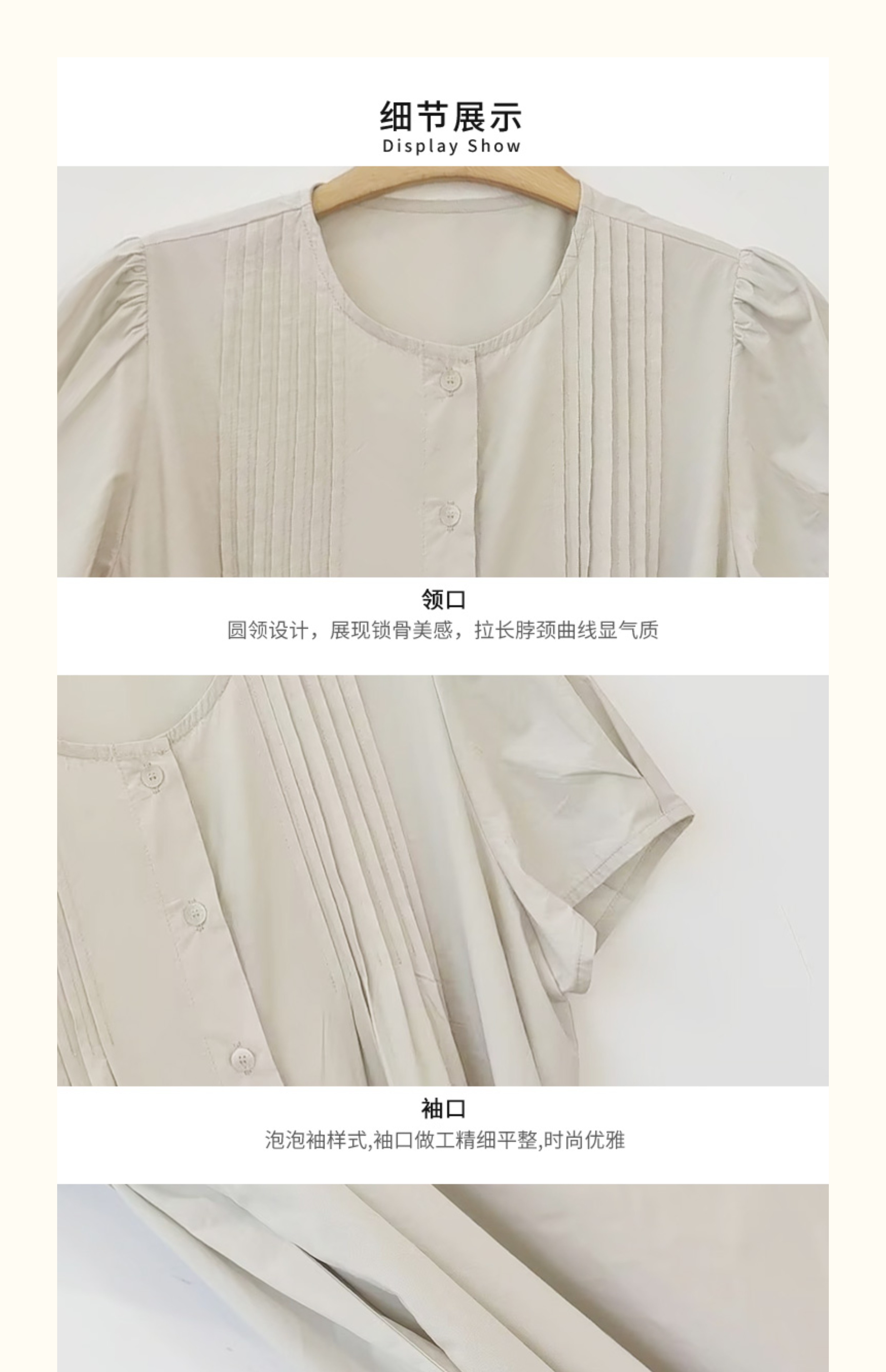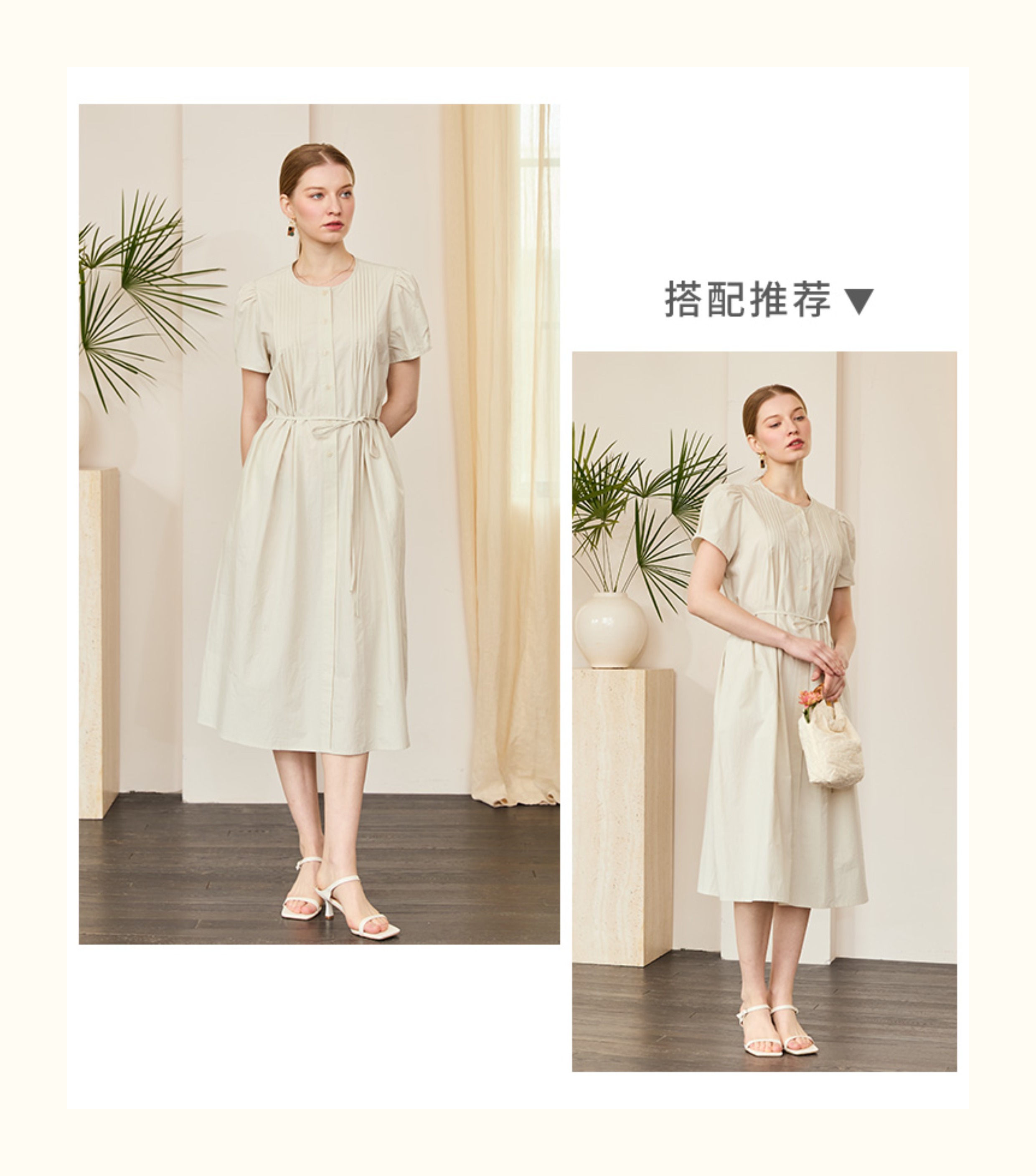 VIVIAN LIU V2534107 夏季女装圆领压褶系带系扣泡泡袖短袖连衣裙