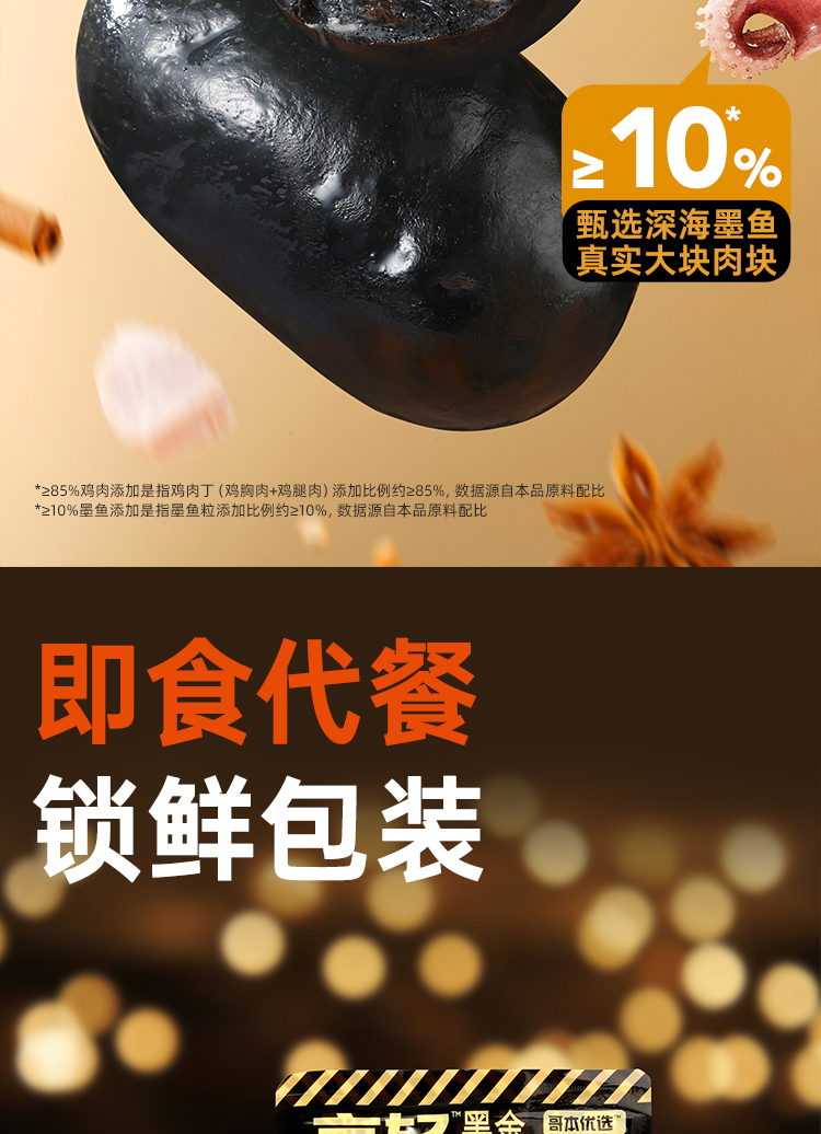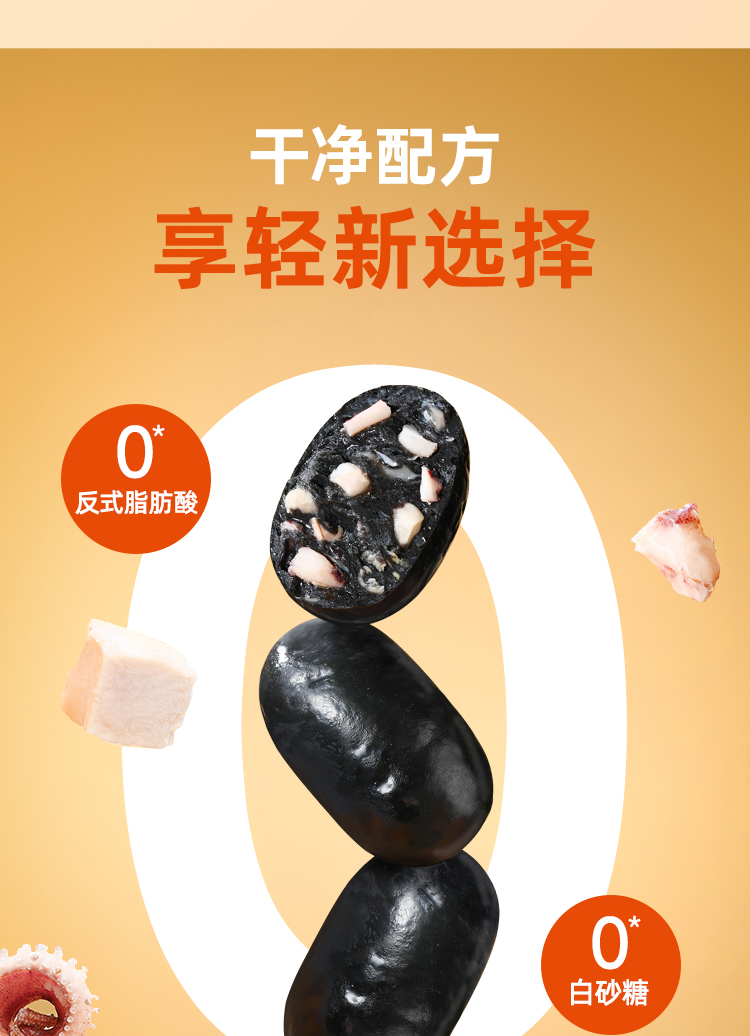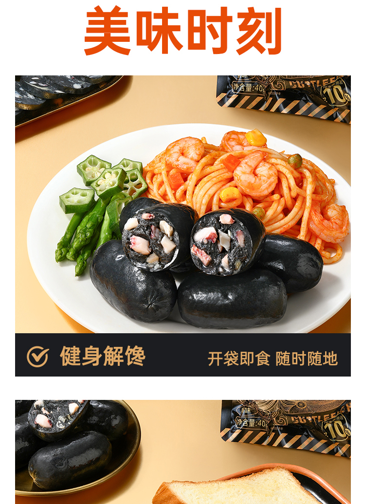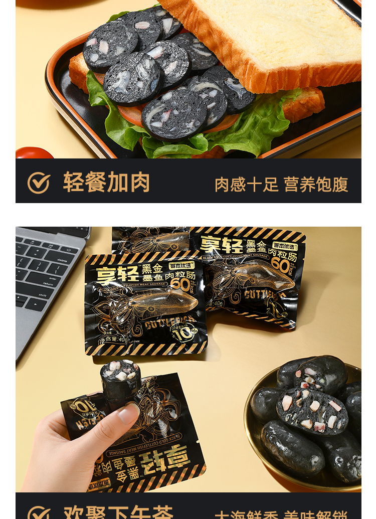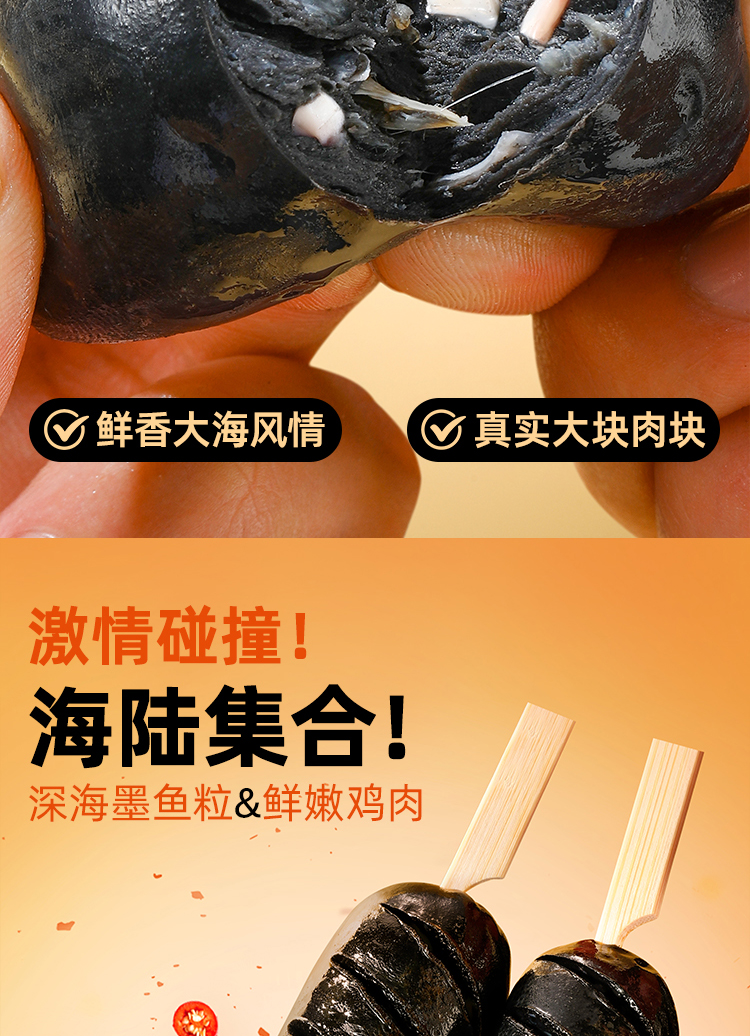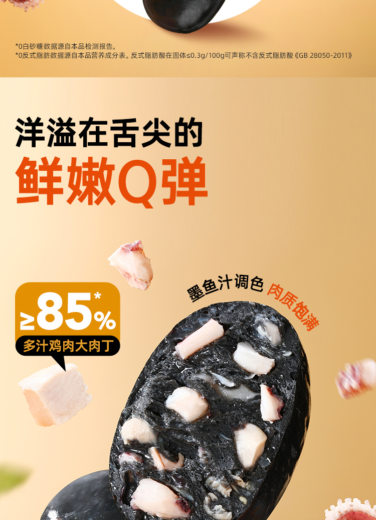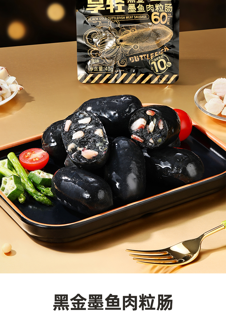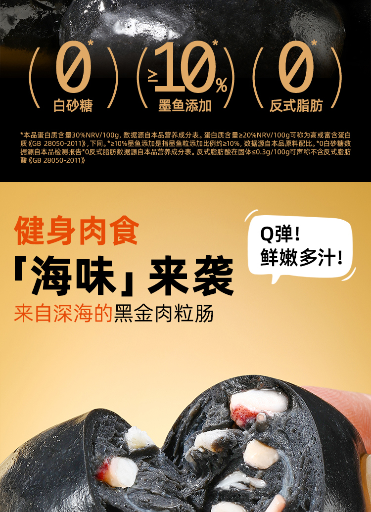 海上陆地双重鲜味·哥本黑金墨鱼肉粒肠 鸡胸肉含量约85% 墨鱼含量约10%肉味鲜香外脆里嫩