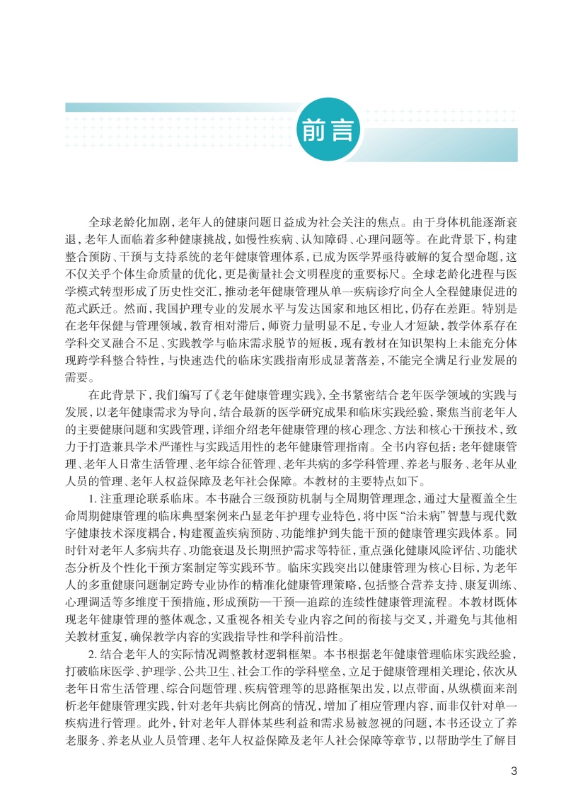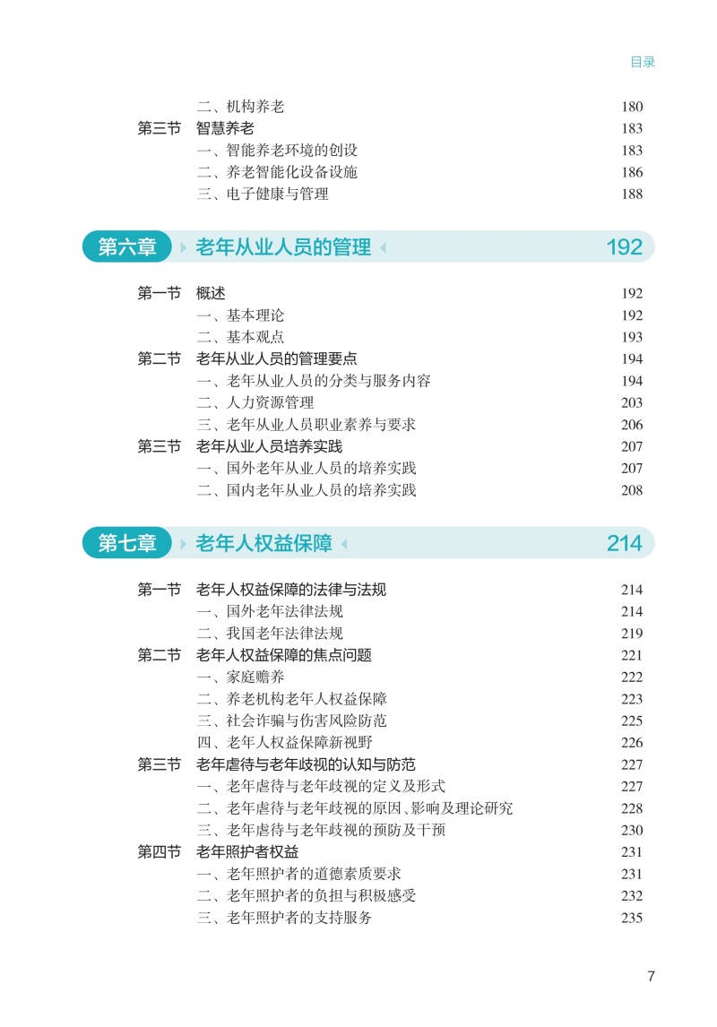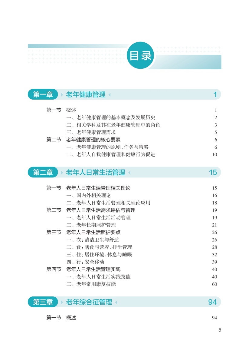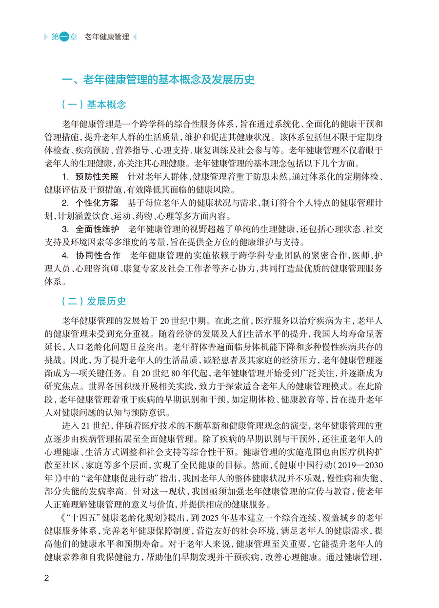 本书结合社会人口老龄化的特点以及现代信息技术在老年护理及养老行业的应用,紧密联系老年专科护士、养老行业管理人才、服务人才需求剧增却供给紧缺的社会背景,从高等院校对专业人才培养的角度出发,编写内容系统前沿、结构立体的实用新型教材。教材内容组织将从多学科合作的临床视角出发进行编写,即涵盖老年健康问题需要医康养护一体化解决的多学科合作特点。主要内容包括:健康老龄化、老年长期照护保障体系、老年长期照护实务、老年健康管理实务(包括老年护理与康复)、智慧养老实务、养老职业素养与人员培训、养老机构运营与管理实务、老年人的权益保障等。