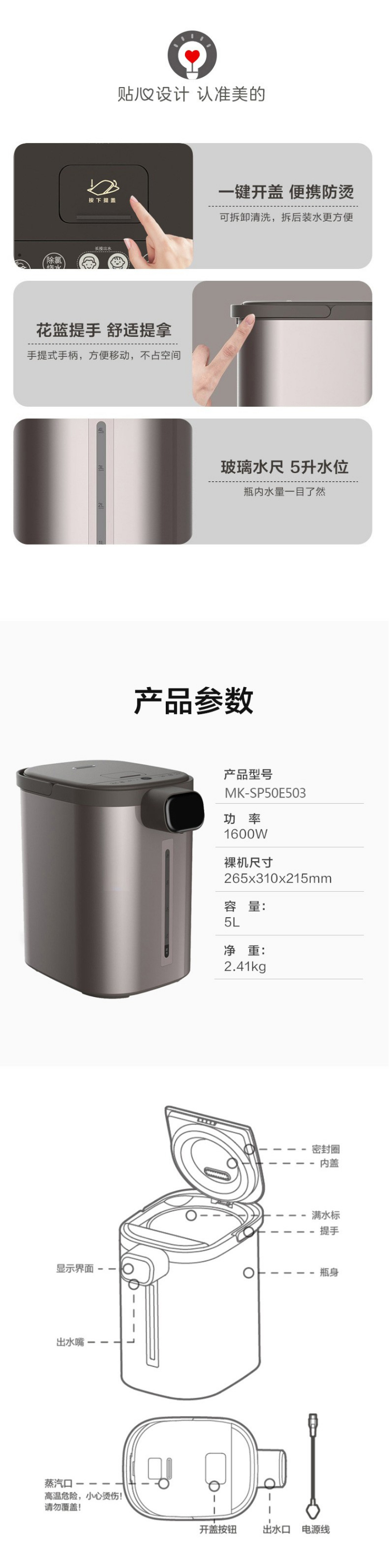 美的(509495)电热水瓶5L家用电热水壶一键除氯多段温控双层防烫食品级304不锈钢开水壶烧水壶 SP50E503