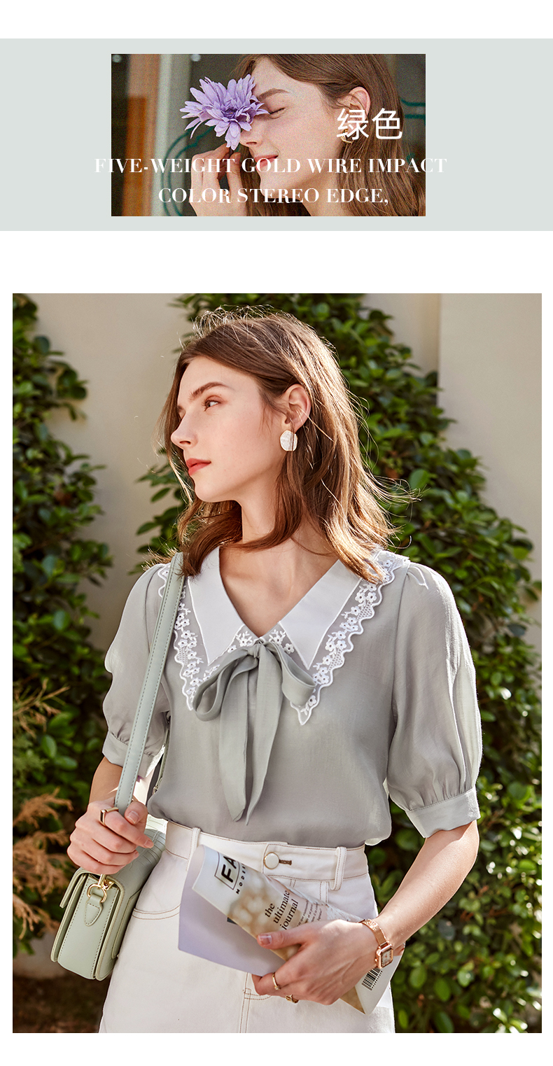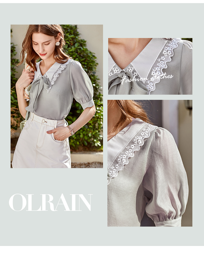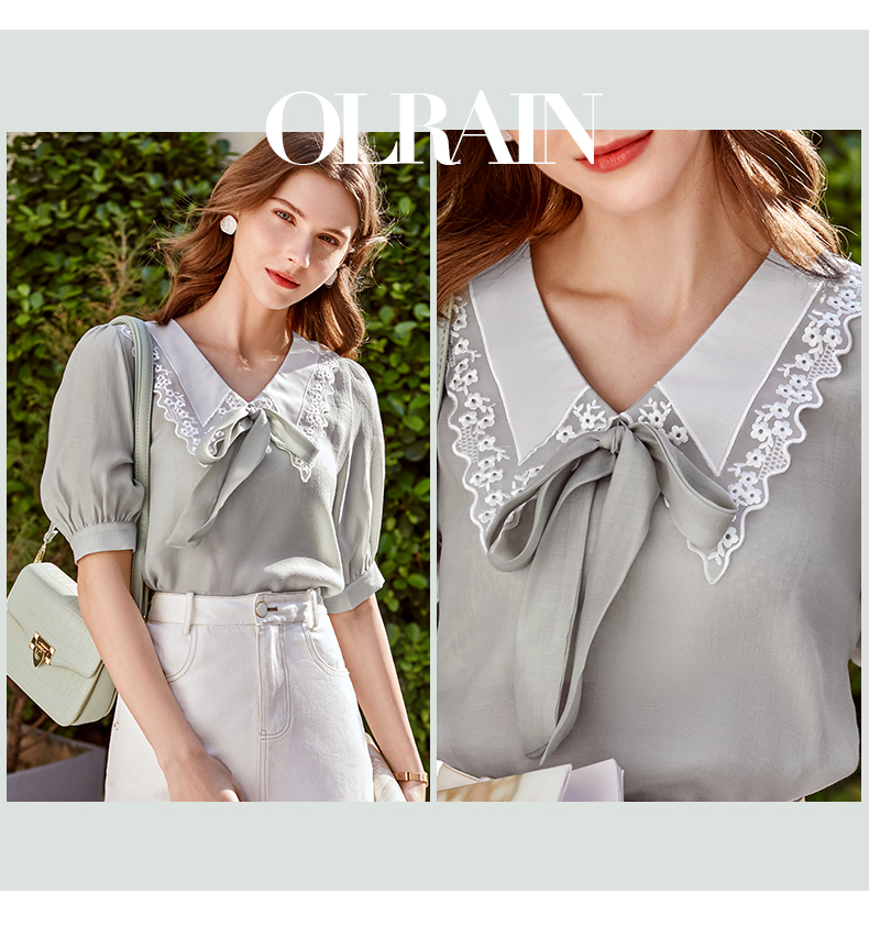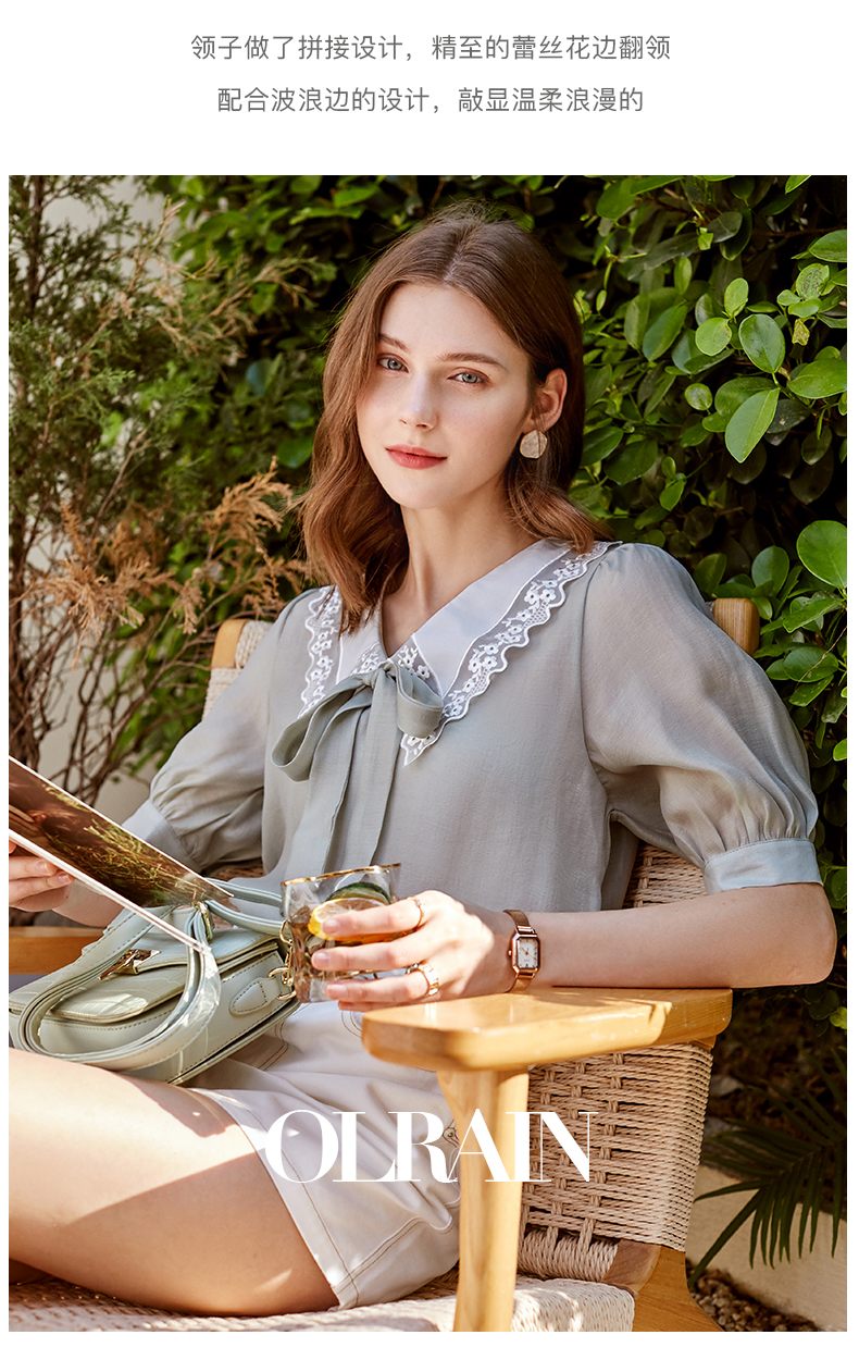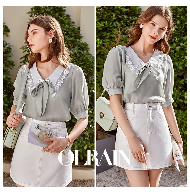 欧芮儿雪纺衬衫女2021春夏蕾丝花边绑带领气质时尚优雅年轻上衣