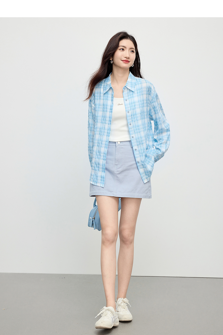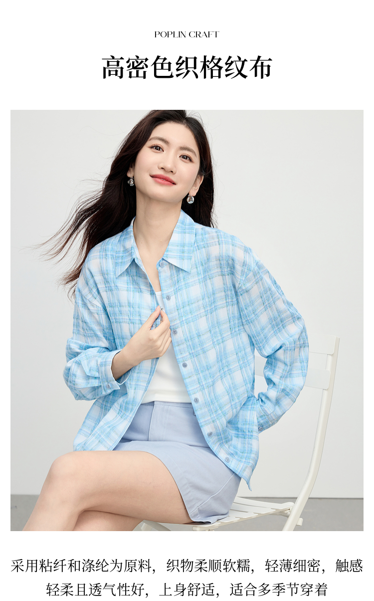 【专属特价】熙世界蓝白格纹防晒衬衫女夏日2025新款法式休闲宽松长袖薄款衬衣