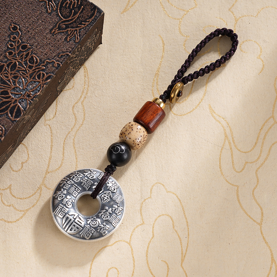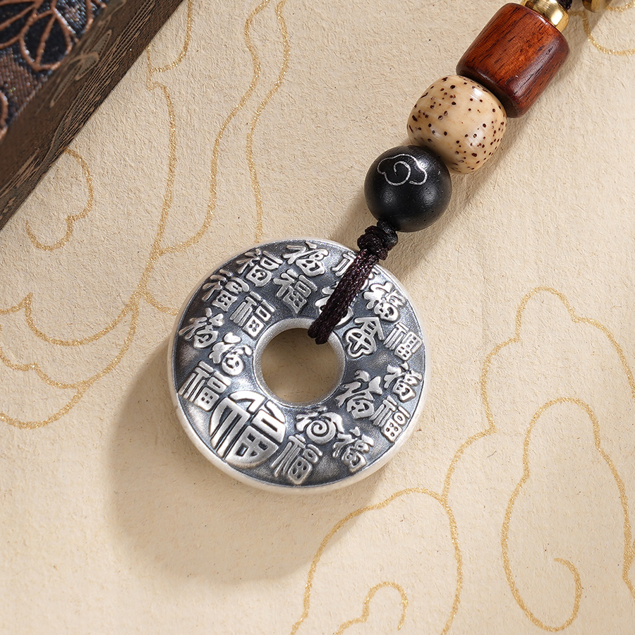 【寓意】:平安扣吊坠,錾刻“福”字图案,并采用仿古工艺塑造,明暗对比,深邃有质感。寓意扣住平安,迎接吉祥。