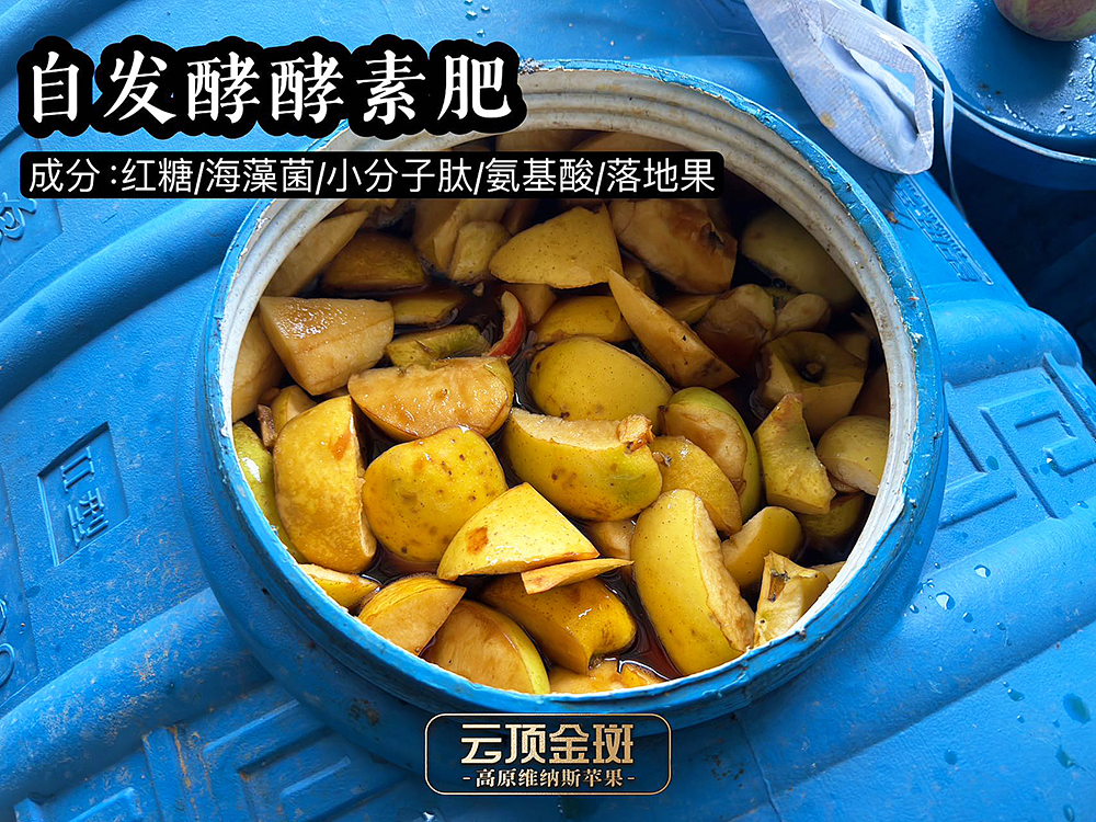 更为难得的是,云顶金斑苹果采用纯天然酵素肥种植。