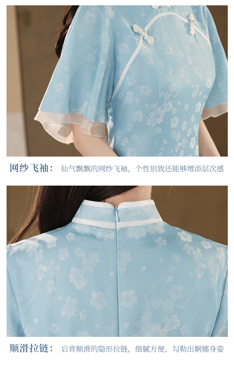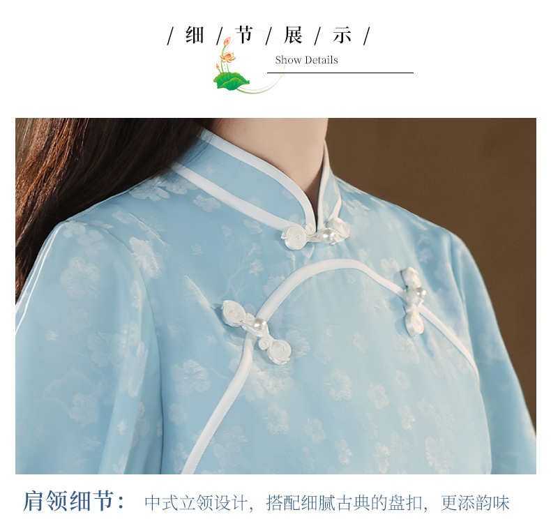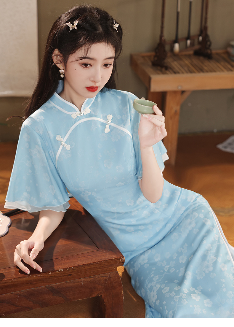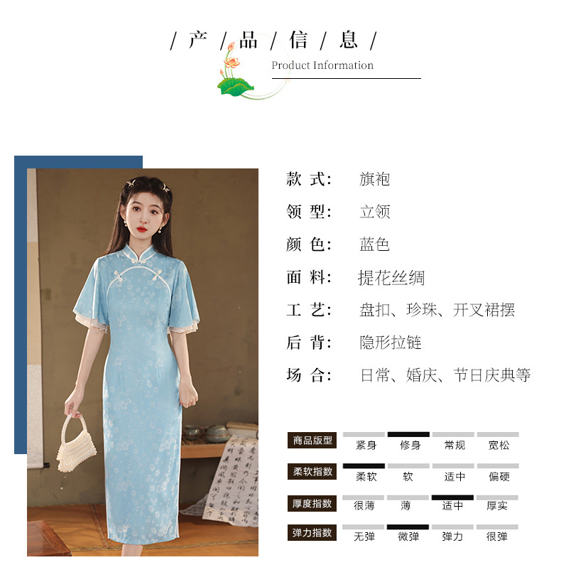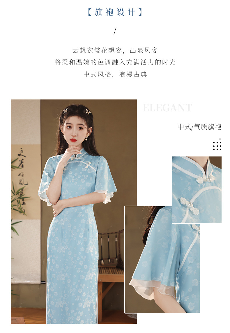 改良日常修身,年轻款水蓝长款气质旗袍XL-24170