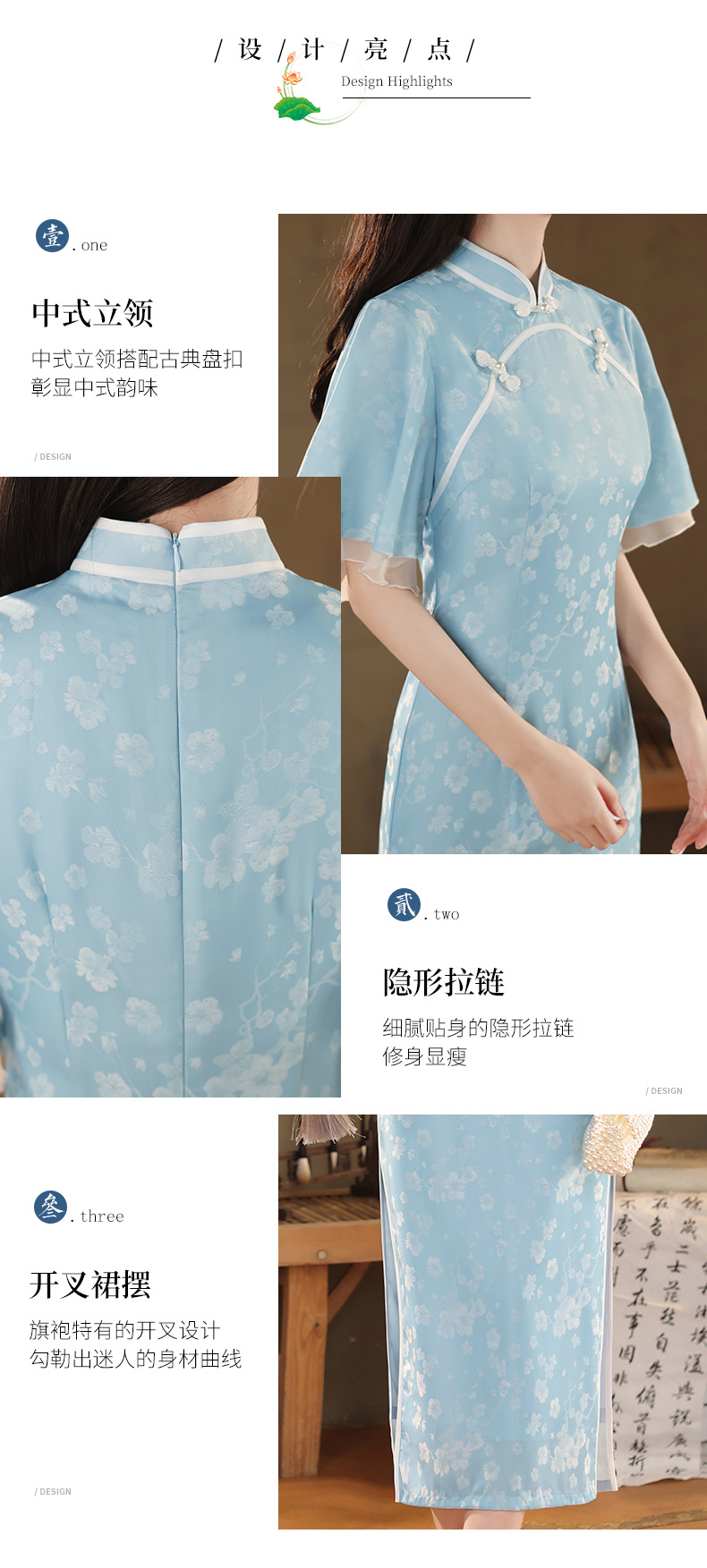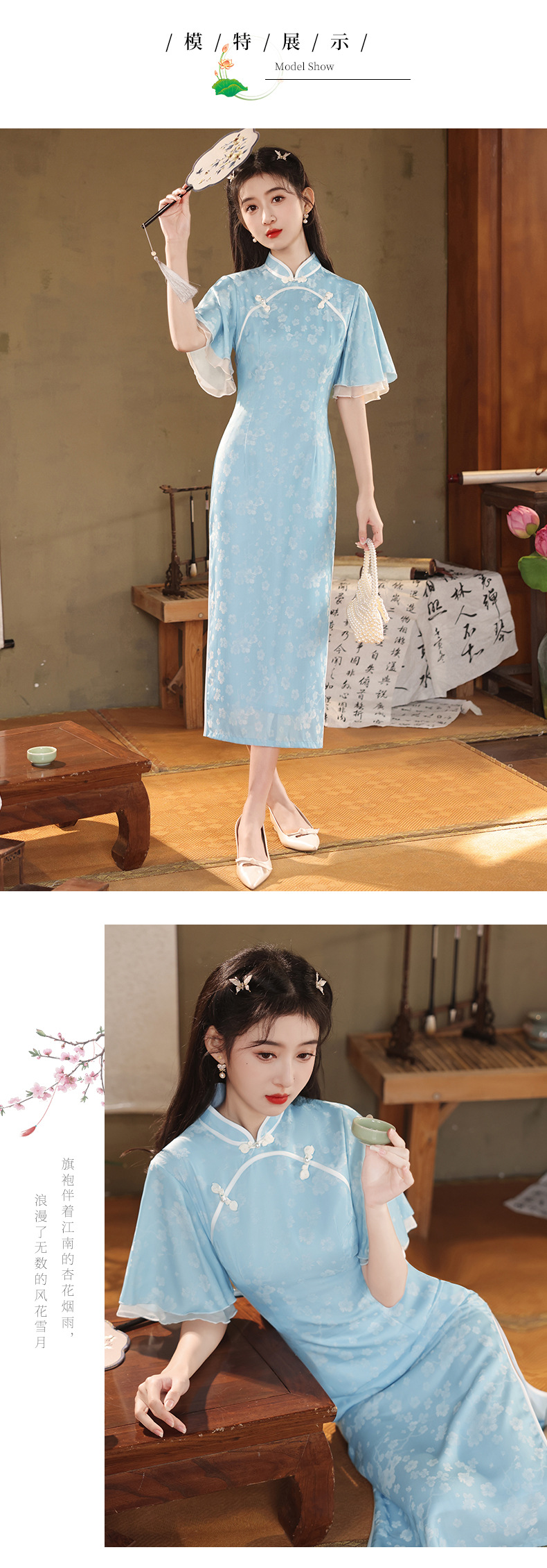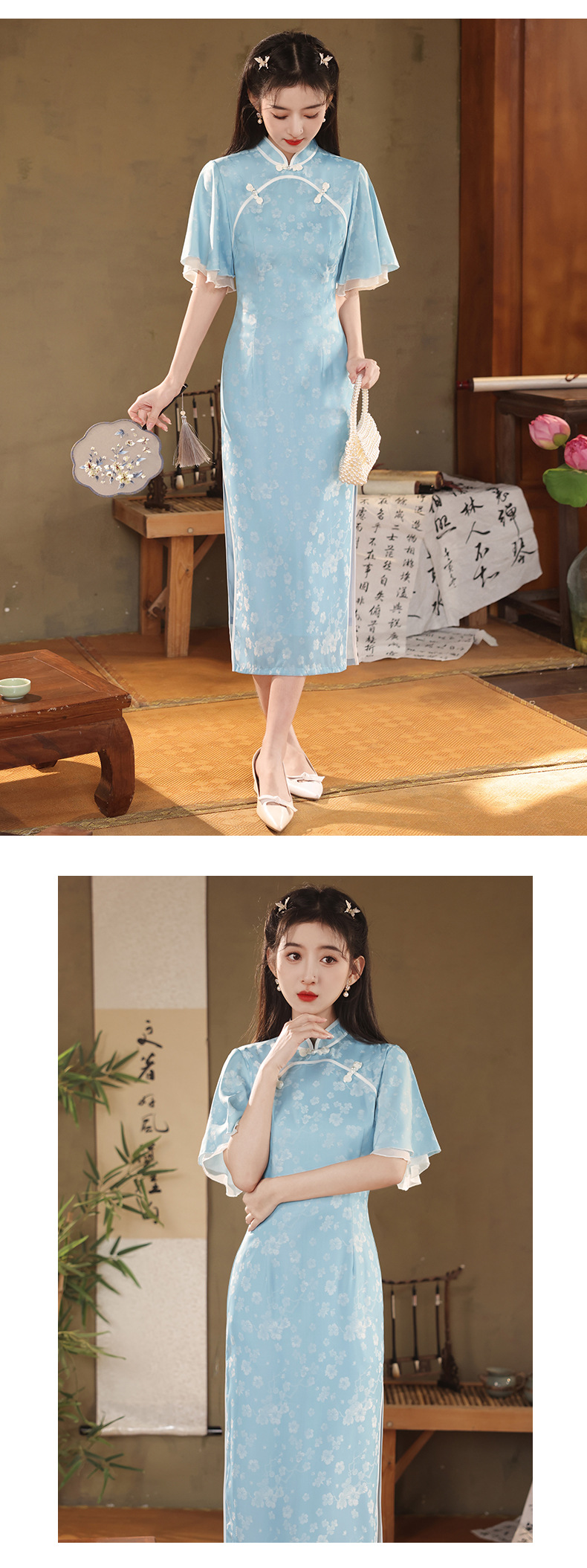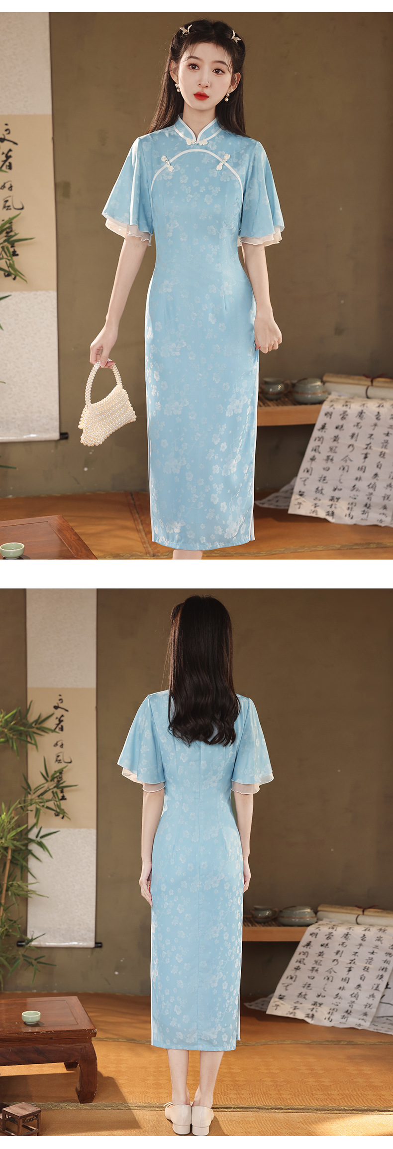改良日常修身,年轻款水蓝长款气质旗袍XL-24170