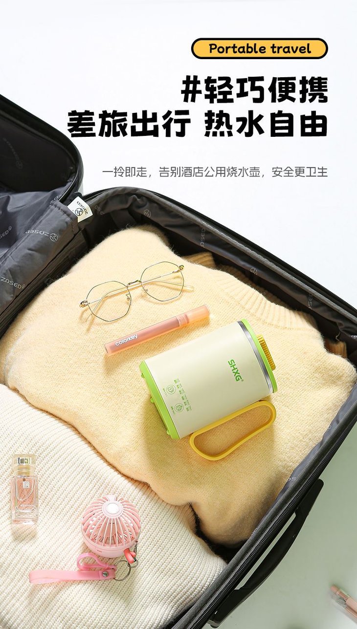便携轻量化,差旅必备 净重仅0.4kg,尺寸还小, 轻松塞进背包,出差旅行告别酒店脏水壶