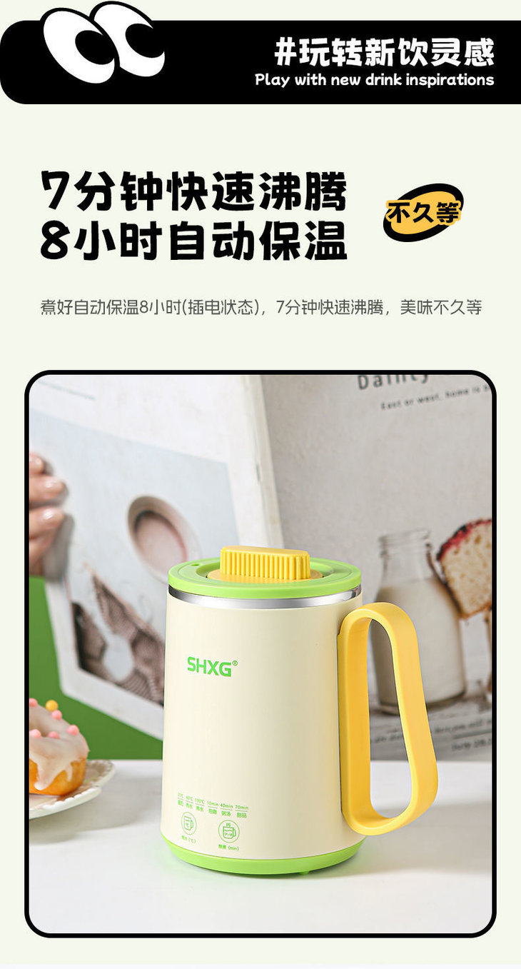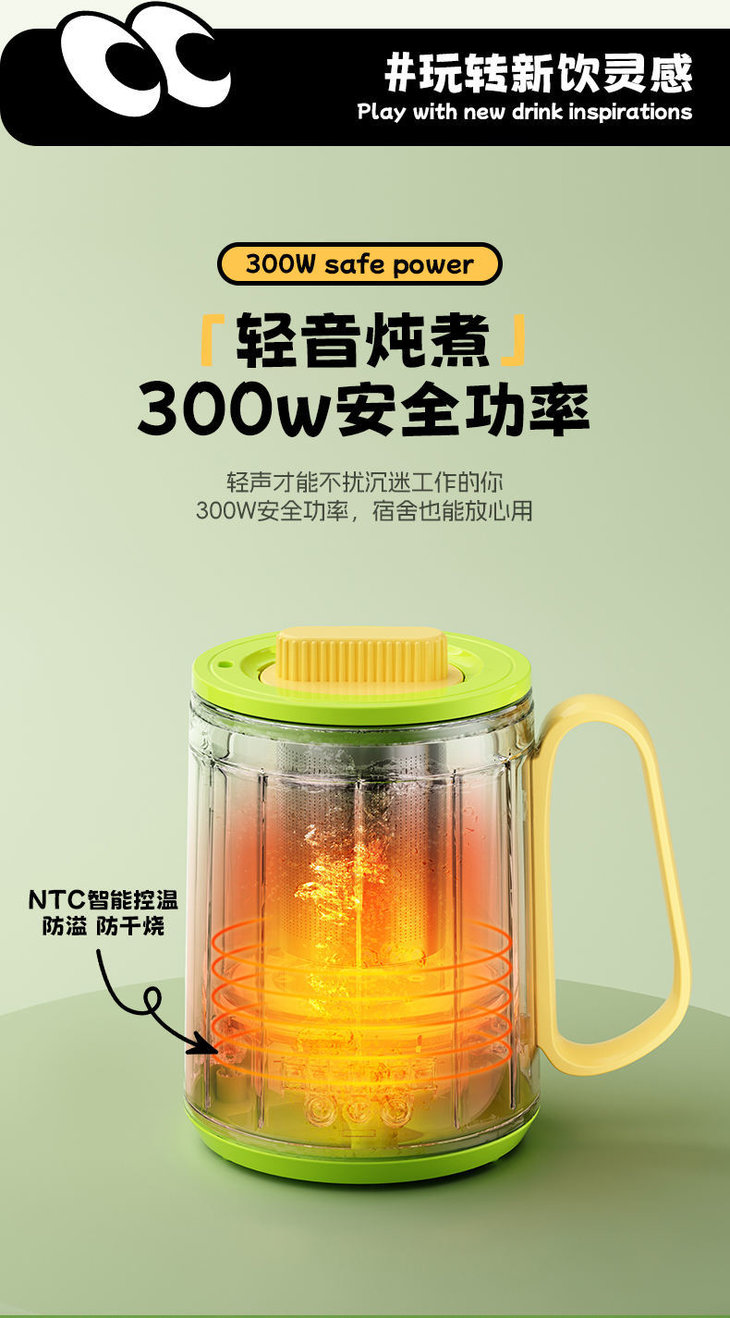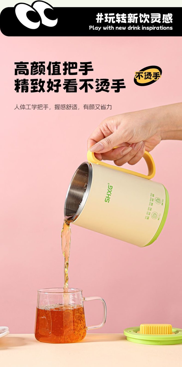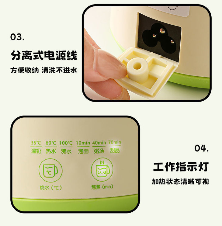 高颜值治愈系 粉/绿色,办公桌颜值担当,送礼自用两相宜。 宝妈带娃:手柄设计单手抱娃也能端 工作指示灯:加热状态清晰可视