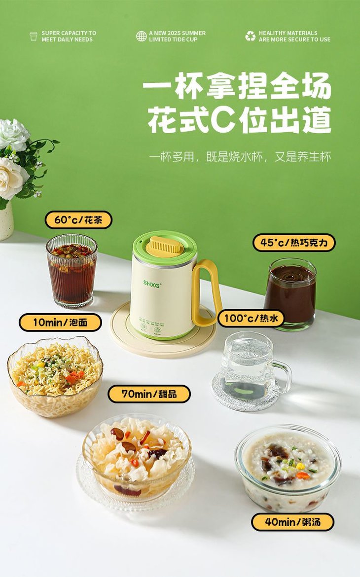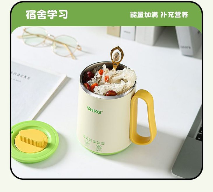 养生场景推荐 上班:保温养生茶,上班元气满满。 宿舍学习:深夜炖红枣银耳羹,静音不吵室友。 差旅:可拆卸电源线设计,行李箱随手塞,酒店泡茶更安心。