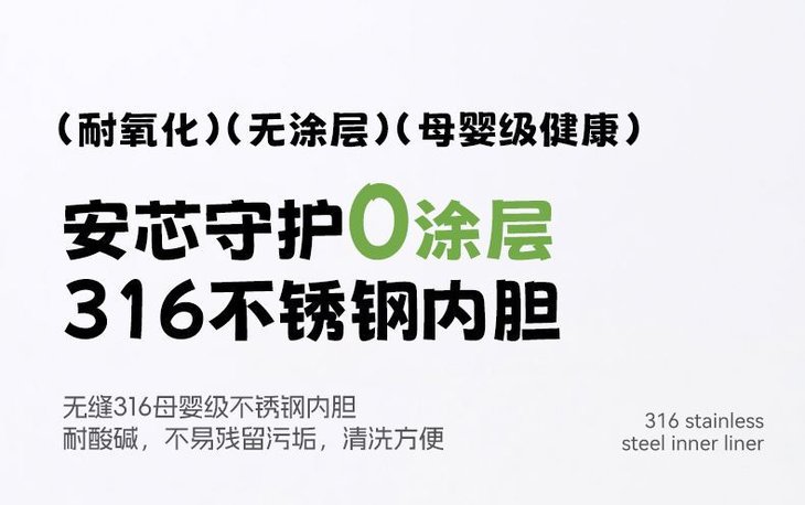 健康材质看得见,食品级材质 316不锈钢内胆:更耐腐蚀(尤其适合酸性食材如柠檬水、花果茶),使用起来超级安心