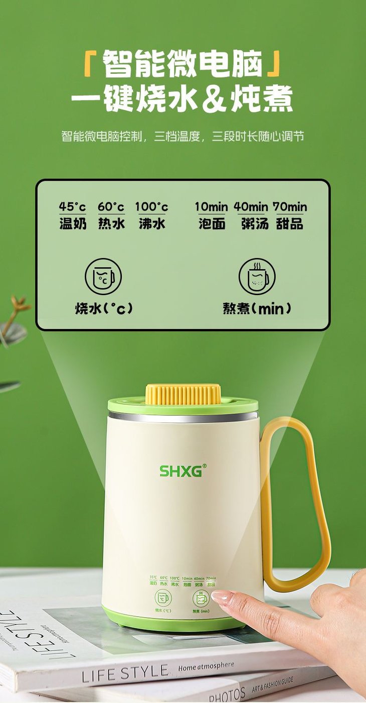 智能微电脑触控,一机多用,省钱省空间 集烧水壶、保温杯、炖盅等多种功能于一体,省下购买多个小电器的费用和收纳空间!!