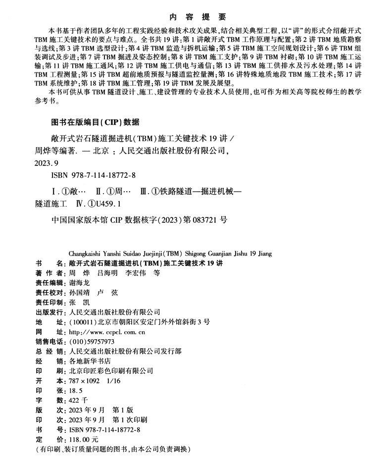 书名:敞开式岩石隧道掘进机(TBM)施工关键技术19讲
