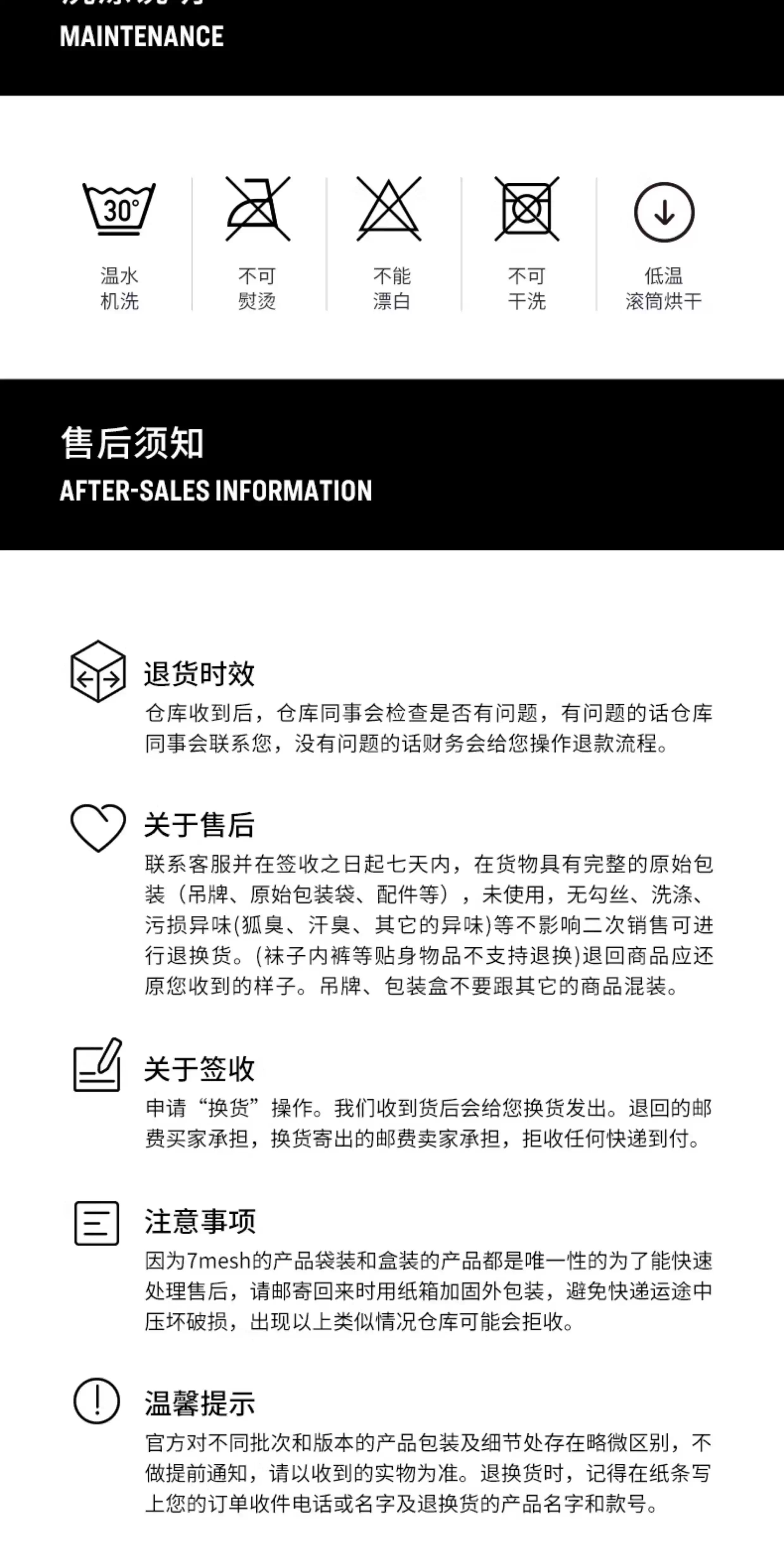 【售后政策】不影响二次销售7天无理由退换、运费自理