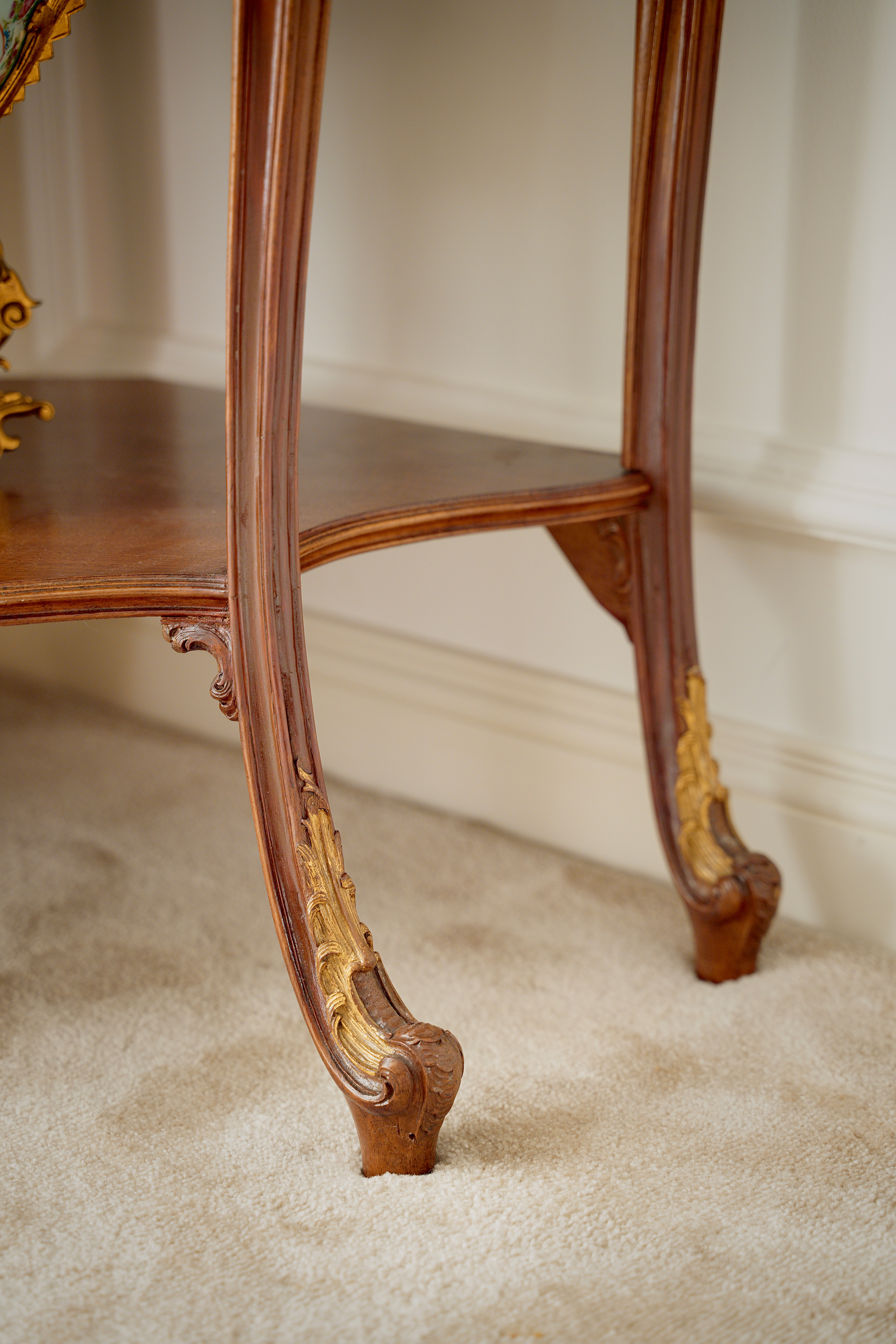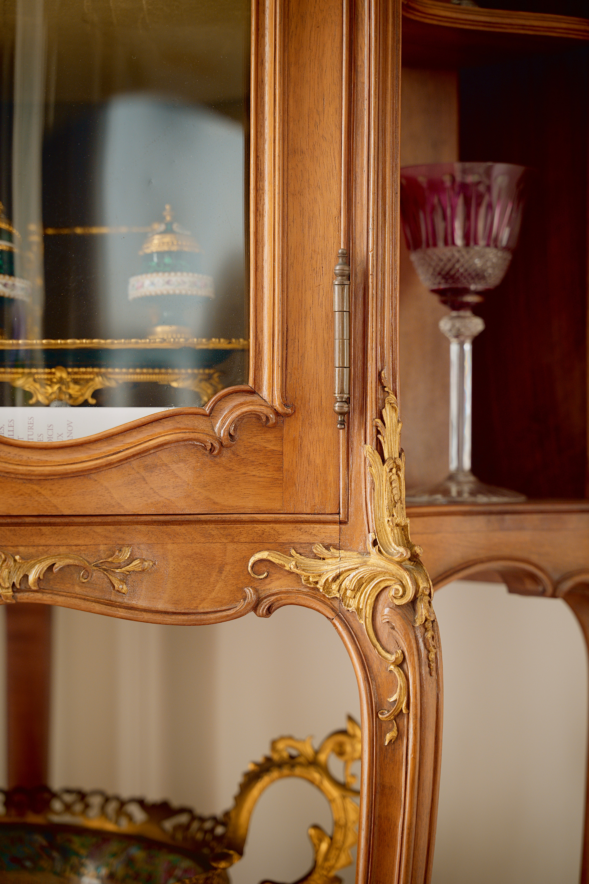 20世纪初法国出品路易十五风格繁花卷叶主题铜鎏金精雕装饰核桃木玻璃展柜