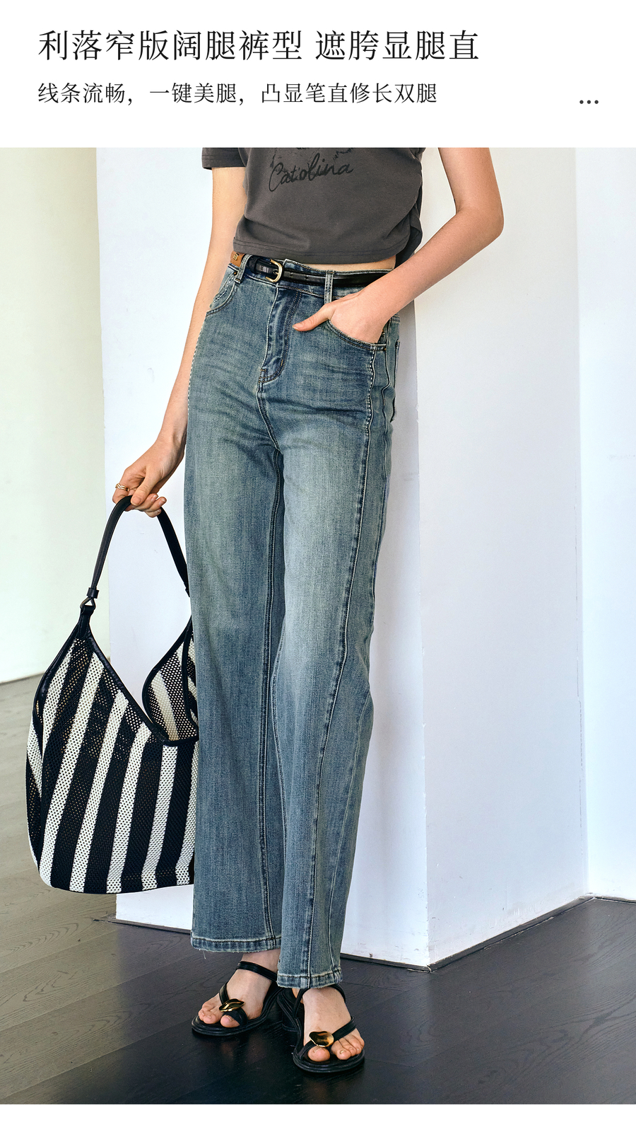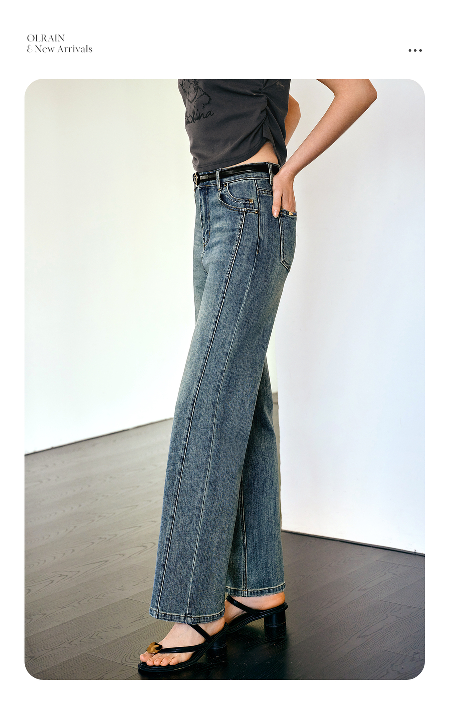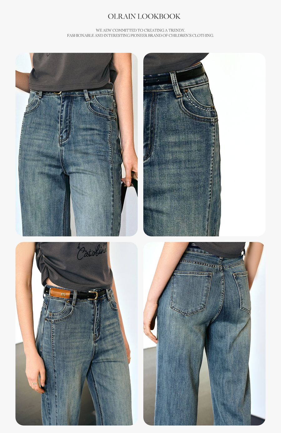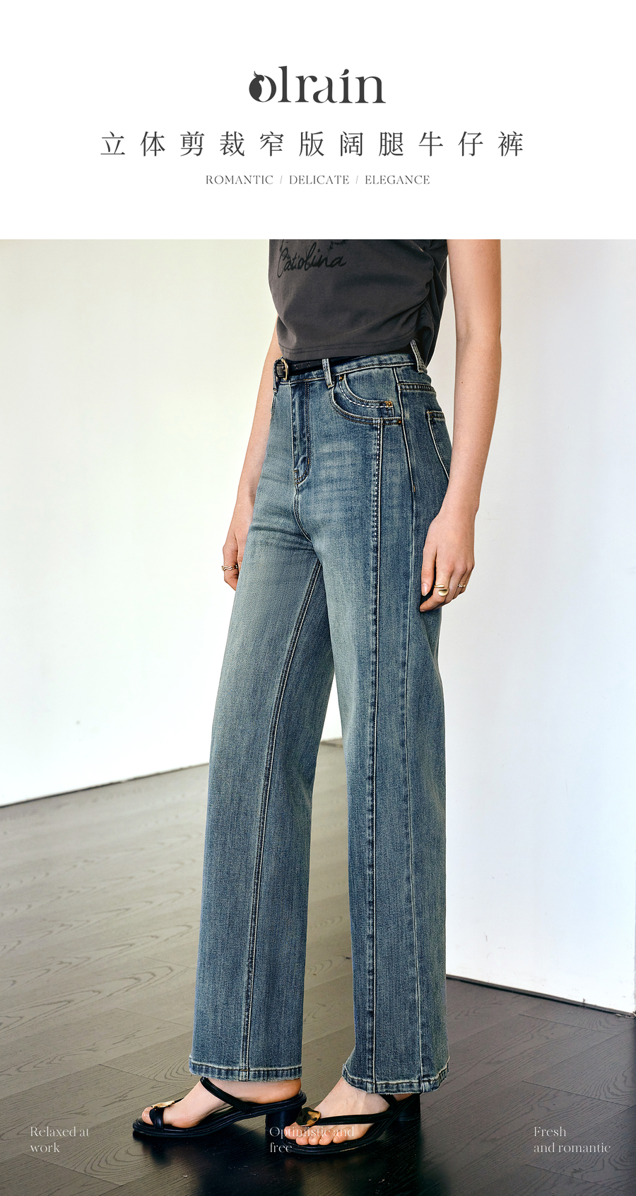 OLrain欧芮儿蓝色高腰牛仔裤女夏季2025新款设计感直筒窄版阔腿裤