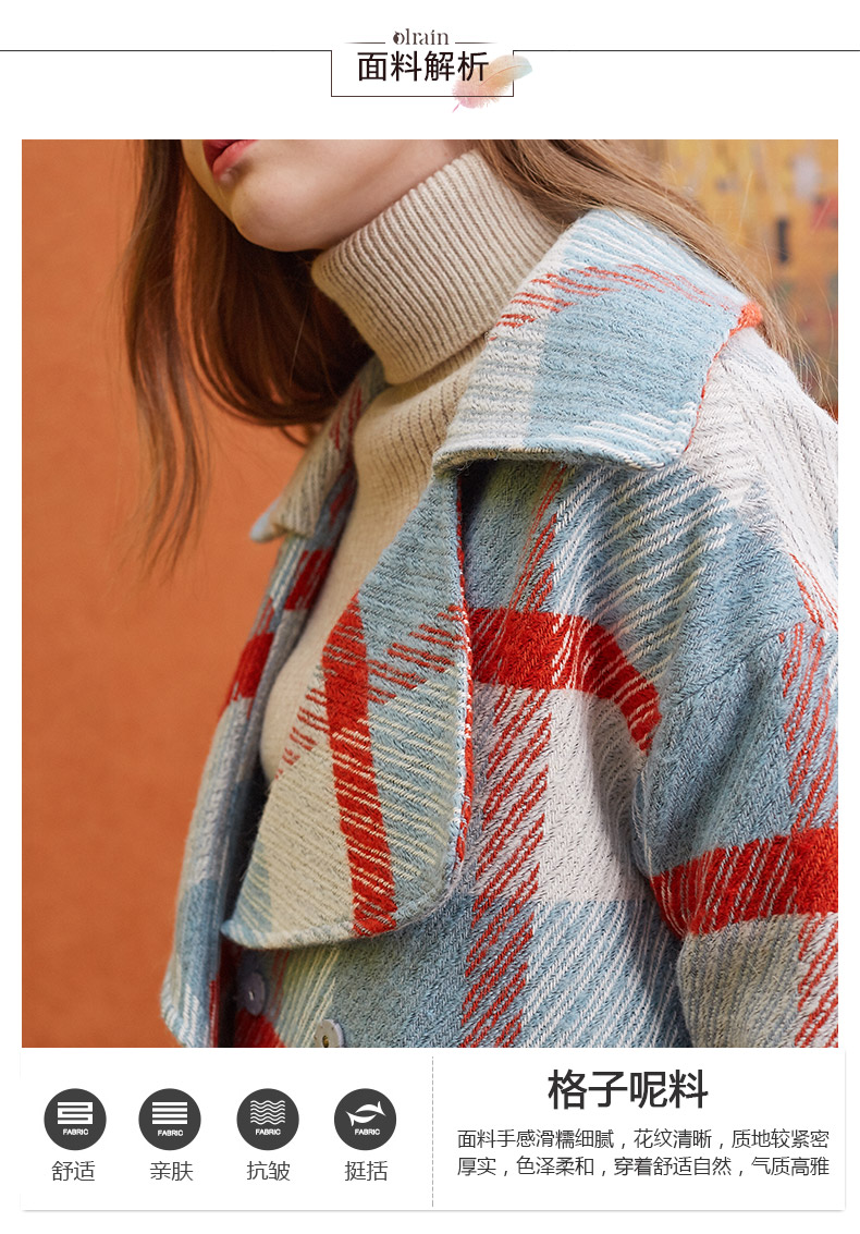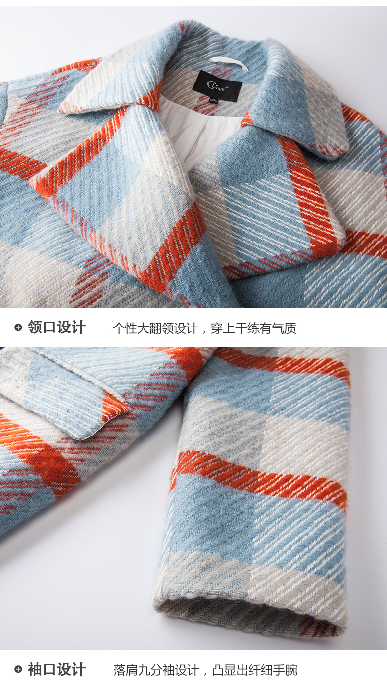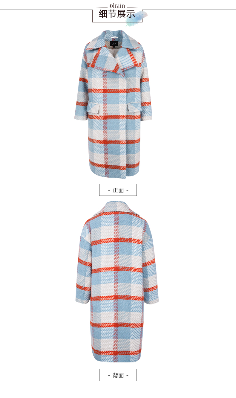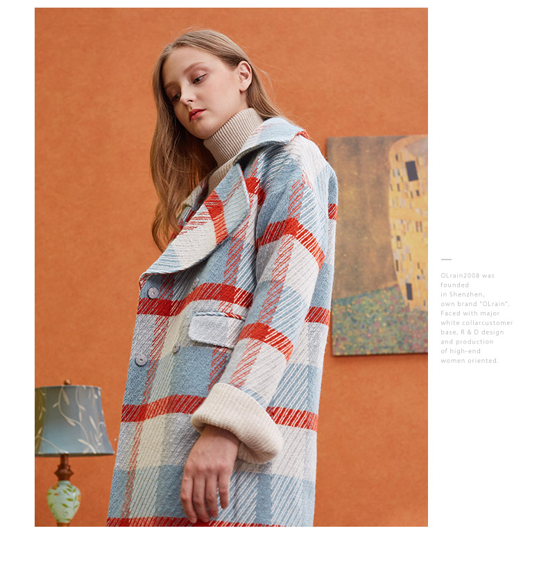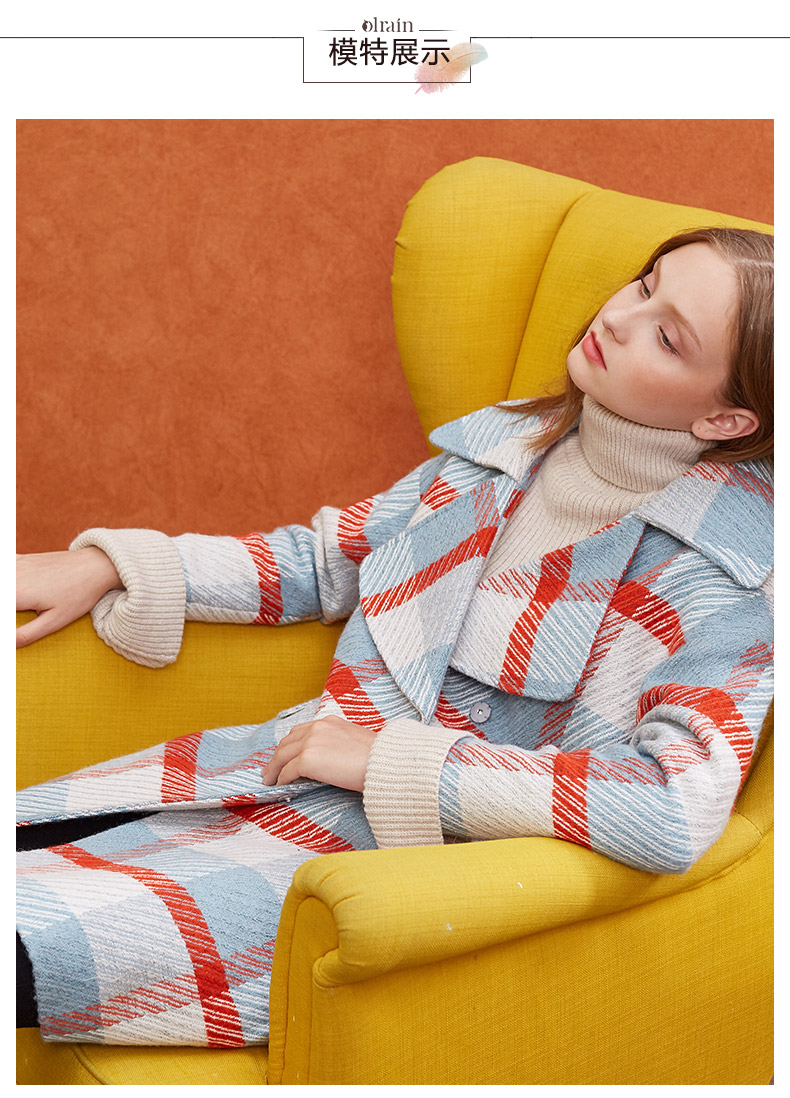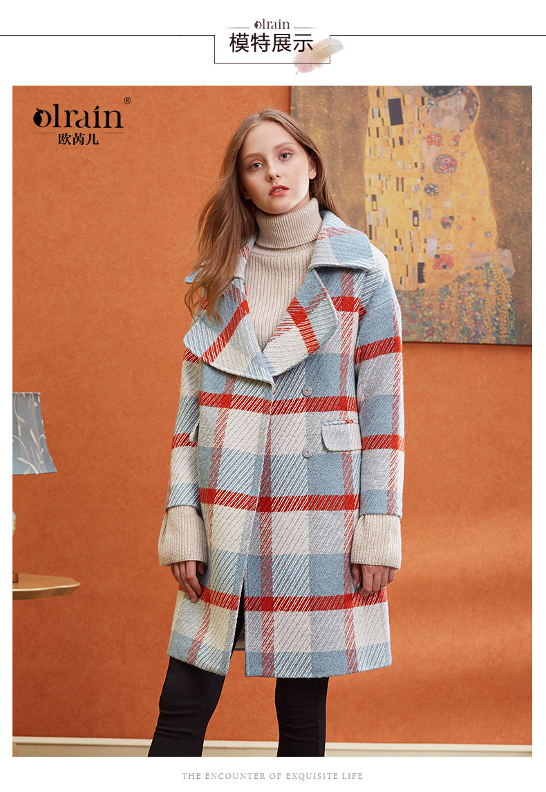 欧芮儿2019秋冬长袖翻领大衣百搭条纹格子毛呢外套女中长