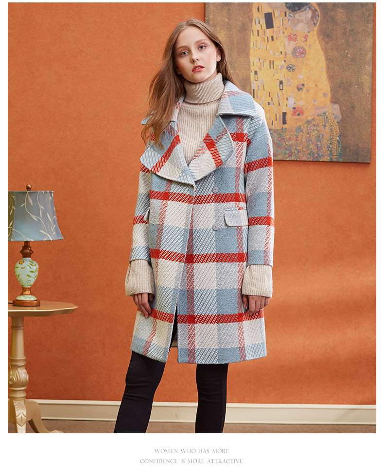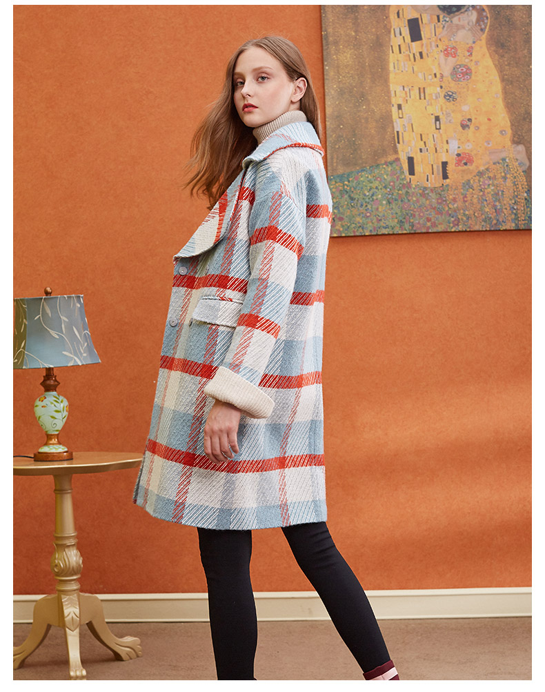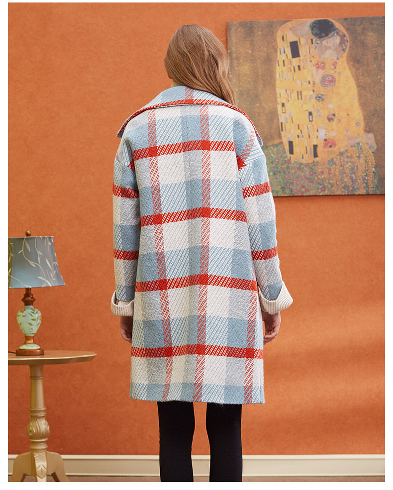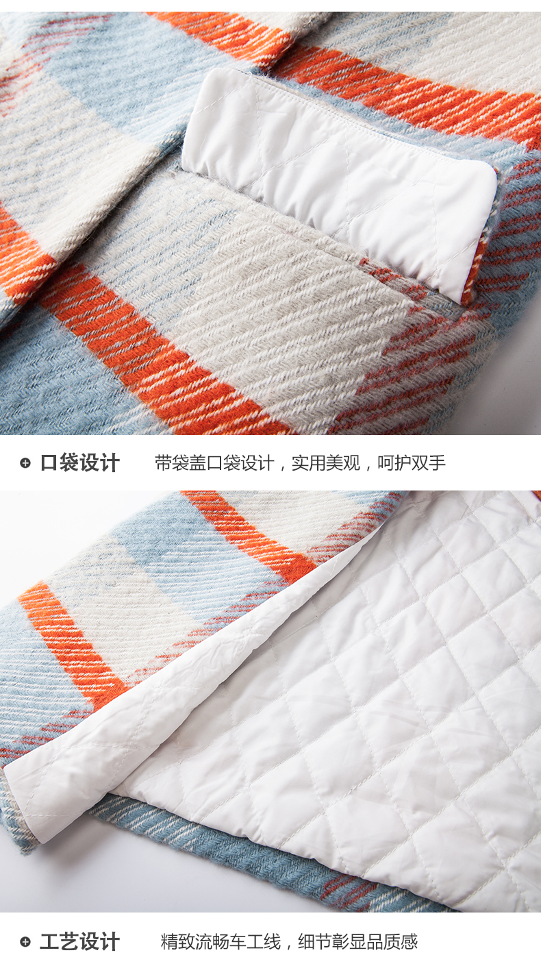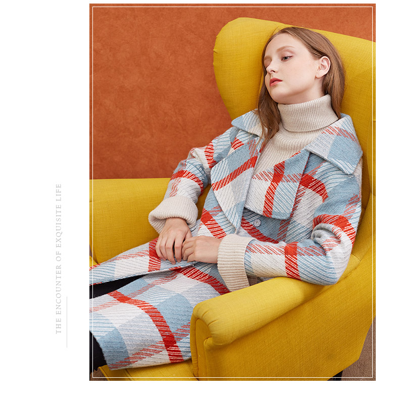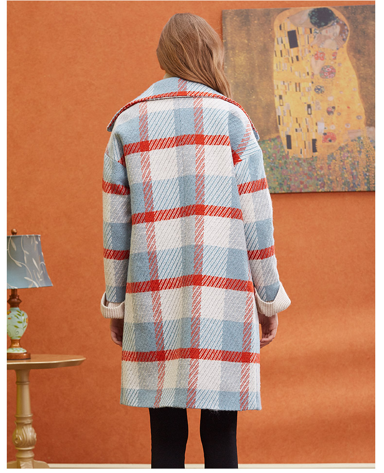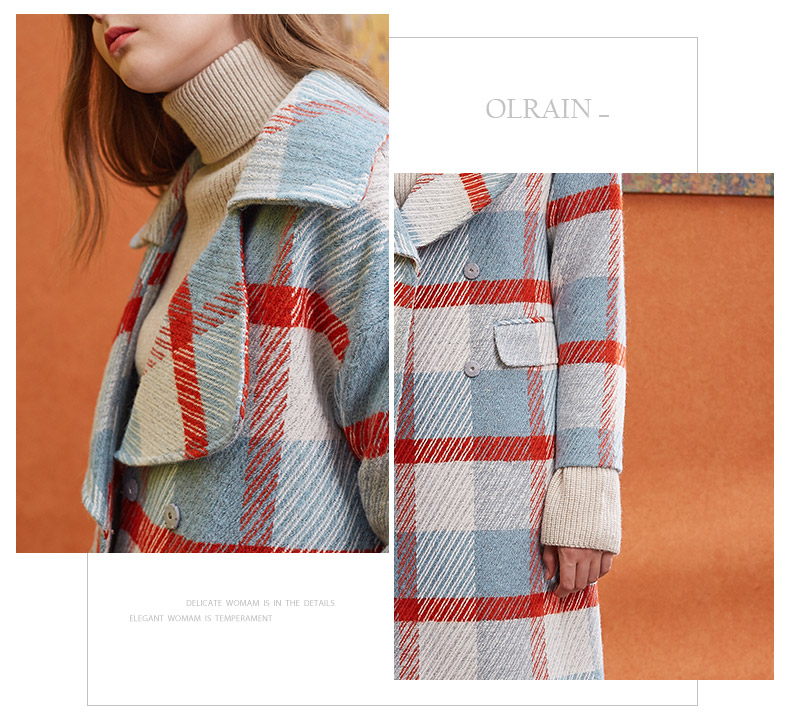 欧芮儿2019秋冬长袖翻领大衣百搭条纹格子毛呢外套女中长