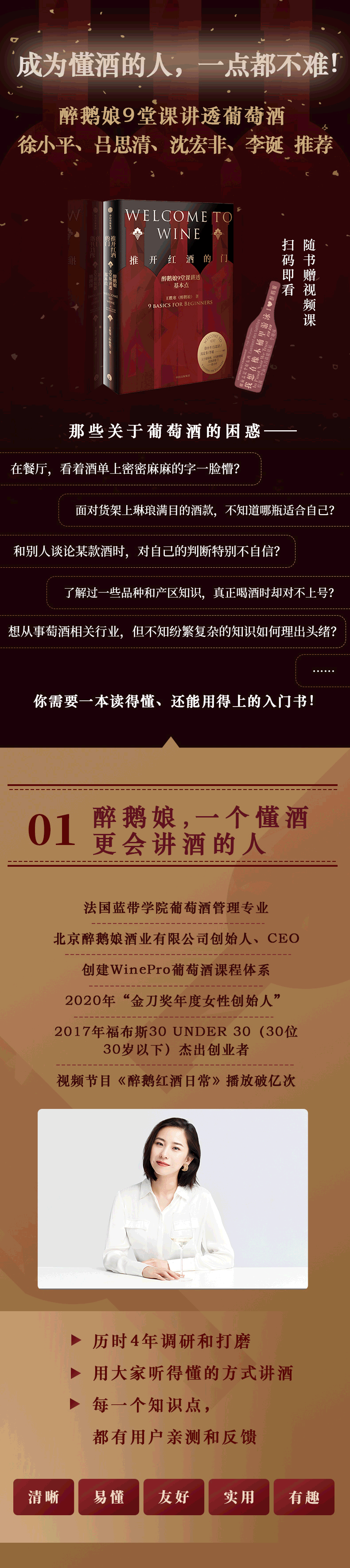 你好,我是“醉鹅娘”品牌的创始人王胜寒。 8 年前我刚开始学葡萄酒的时候,走过太多弯路。从请教身边的葡萄酒爱好者,到去纽约有名的葡萄酒学校上课;从在葡萄酒商店实习,到去米其林三星餐厅打工学酒……尽管做了种种努力,当时的我每每打开陌生酒单时,仍然一知半解。 假如你也曾试图了解葡萄酒,甚系统性地上过品鉴课,但还是没把葡萄酒弄明白,请不要气馁,因为曾经全身心学酒的我这样。后来我才意识到,之所以会出现那样的局面,是因为传统的葡萄酒教学存在弊端: 学习以后,面对酒单还是看不懂,点酒时依然手足无措—因为传统入门教学不关注场景实践。 当朋友问起某款酒如何时,不知如何回答,除了形容一下味道,好像也说不出更多门道—因为传统入门教学总是先教你如何当好品鉴者,教你“酸度中等偏上”这些浮于表面的碎片化知识,却不教你如何从生产者的角度去理解一款酒的味道。 当你想了解一款酒的时候,即便查阅一大堆资料,但好像还是无法理解到点子上—因为传统入门教学往往没有搭建好学习葡萄酒风格和质量因素的框架,没有给予你“问对问题”和“问好问题”的能力。 已经在书本上学习了那么多品种和产区,可真正喝起某瓶酒的时候,味道和书本上的对不上号—因为传统入门教学喜欢教人死记硬背产区或品种的标志性口味,但现今随着葡萄酒市场的快速变化,理论和现实有可能是脱节的。学会理解口味变化的规律,远比记住标志性口味更重要。 这种种情况,就跟几十年前中国人学习英语时所面临的困境一样—前有哑巴英语,今有哑巴红酒。可以说,现今的葡萄酒教学,不比之前的填鸭式英语教学好到哪里去。 如果你不希望受“哑巴红酒”之苦,那么要避免掉进下面三个“坑”: 个坑,死记硬背品种或产区的标志性香气。因为你后会发现,在实际品酒过程中,学到的这些标志性香气绝大部分对不上号。比如,传统的葡萄酒教学一开始便会教的几个葡萄品种的香气,其中对于赤霞珠香气的描述是“带着鲜明的黑醋栗、雪松和烟草气息”。但为什么你体会不到?因为也许你喝的是未经陈年的易饮风格的赤霞珠,烟草和雪松这种味道往往需要经过过桶(酒放入橡木桶中熟化)和陈年,再加上风土的加持才会出现。在现实生活中,平价年轻的赤霞珠和精品陈年的赤霞珠,味道可以说大相径庭。 第二个坑,对所有产区和品种一视同仁。很多葡萄酒教材身负“公允公正”的使命,因而“关爱”所有产区和品种,否则就会被批评不全面,但这样会让入门者抓不住重点。一些教材里反复提及的某些产区的酒,甚还没进口,记住这些产区只会占用宝贵的记忆力和注意力,搞错轻重缓急。此外,葡萄酒教材往往在评论产区和品种时束手束脚,说很多客套话,谁也不得罪。然而,葡萄酒的世界是平等的世界,说好听点儿是有差序格局,说不好听就是“鄙视链”严重。我认为,初学者要先学习那些生产“贵的酒”的产区和品种。这一原则不仅适用于入门者,也适用于进阶者。 第三个坑,“碎片化”品酒。刚开始的时候,是需要详细了解葡萄酒在色、香、味方面带来的细致感官体验的。我们在不断实践品酒的时候,要学会“抓大放小”,比如不要纠结是闻到了黑莓还是李子的香气,酸度是高还是中高,因为初学者会很容易迷失在细节里,导致把握不准酒的整体风格。 相信看完这本书,你再也不会碰到下面这些困惑: 在餐厅,看着酒单上密密麻麻的字一脸懵; 看着货架上琳琅满目的酒款,不知道选哪瓶适合自己; 和别人谈论品尝到的葡萄酒时,对自己的判断特别不自信;想从事葡萄酒相关行业,但不知纷繁复杂的知识如何理出头绪; …… 我希望这本书帮你推开红酒的大门,看见门内的大千世界。
