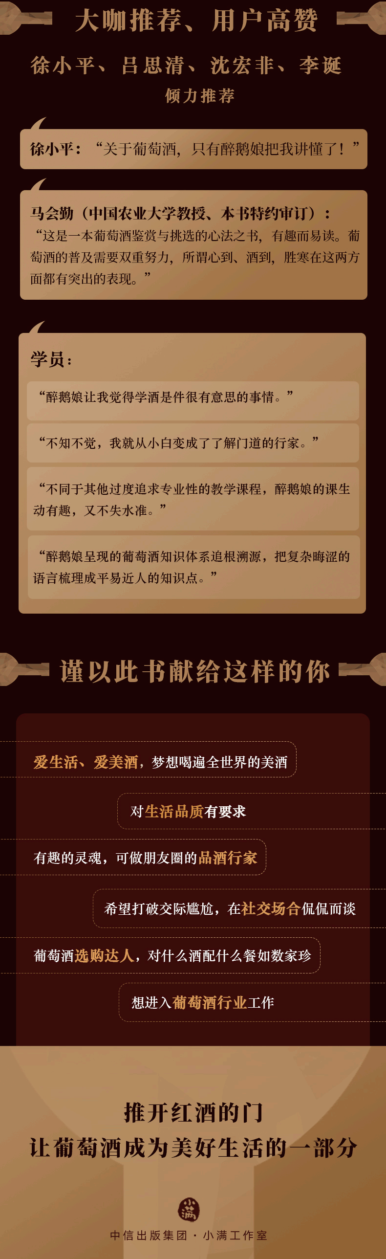 5.徐小平、吕思清、沈宏非、李诞推荐。徐小平评价本书:“关于葡萄酒,只有醉鹅娘把我讲懂了!”