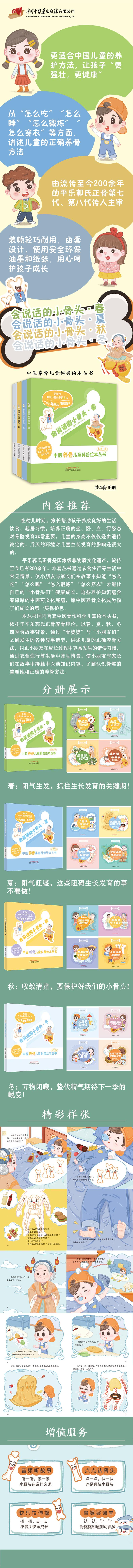 本丛书国内首套中医骨伤科学儿童绘本丛书,依托于平乐郭氏正骨养骨理论,以春、夏、秋、冬四季为故事背景,通过“骨婆婆”与“小朋友们”之间发生的各种故事情节,讲述儿童的正确养骨方法,纠正小朋友在成长过程中容易发生的错误习惯,通过衣食住行等生活中常见情景,使小朋友与家长们在故事中接触中医药知识内容,了解认识骨骼的重要性和正确的养骨方法。本套书为“夏”系列,分为四本,分别是:小骨头爱游泳、骨婆婆神奇的院子、衣服好重呀、航航被怪物吃掉了。