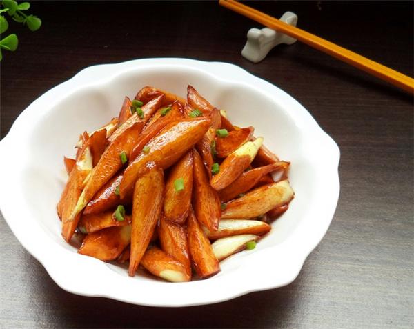 热锅,锅里放油,加入茭白,小火煸炒,慢慢的煸上色