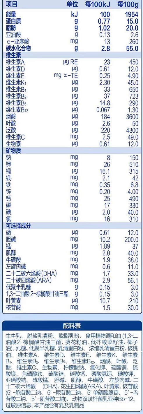 2.配料表中,第3位是“脱脂奶粉”,国家明确鼓励多用“生牛乳”“生羊乳”“生驼乳”等新鲜奶源;本品非全生牛乳原料制造;