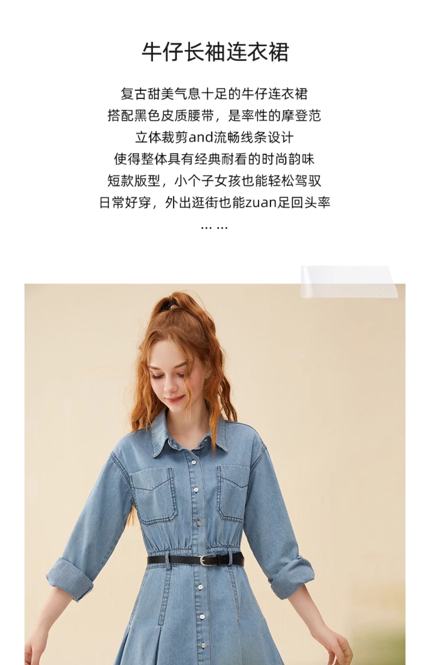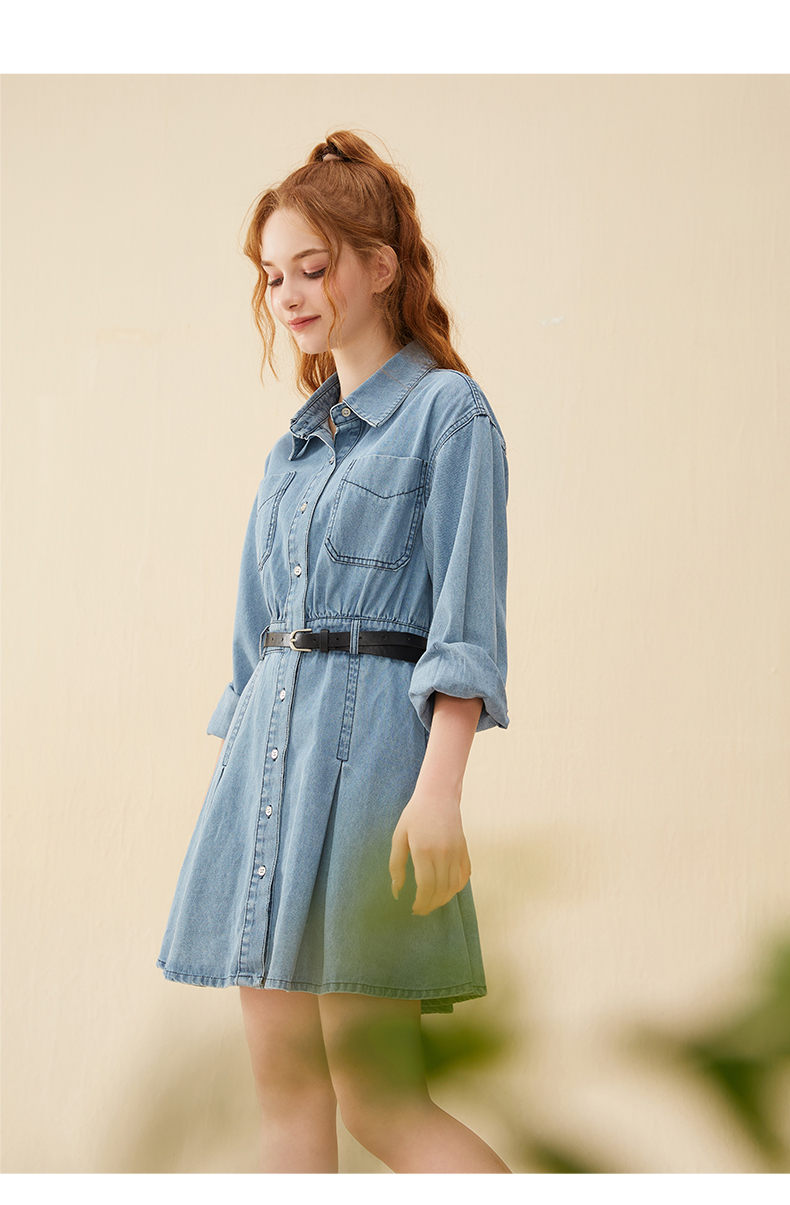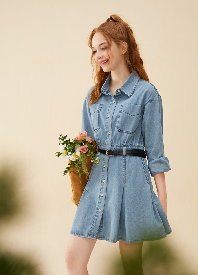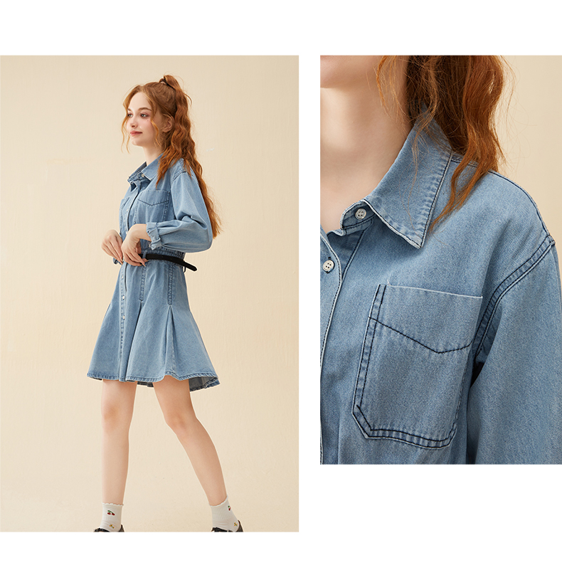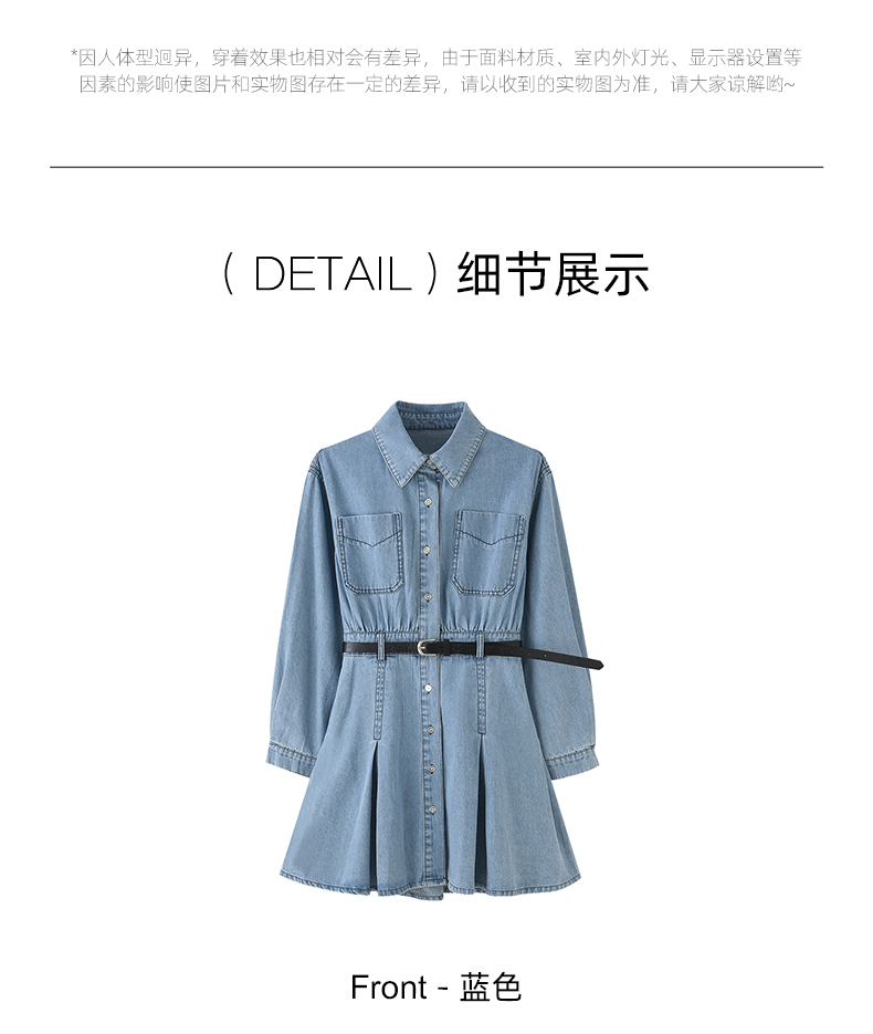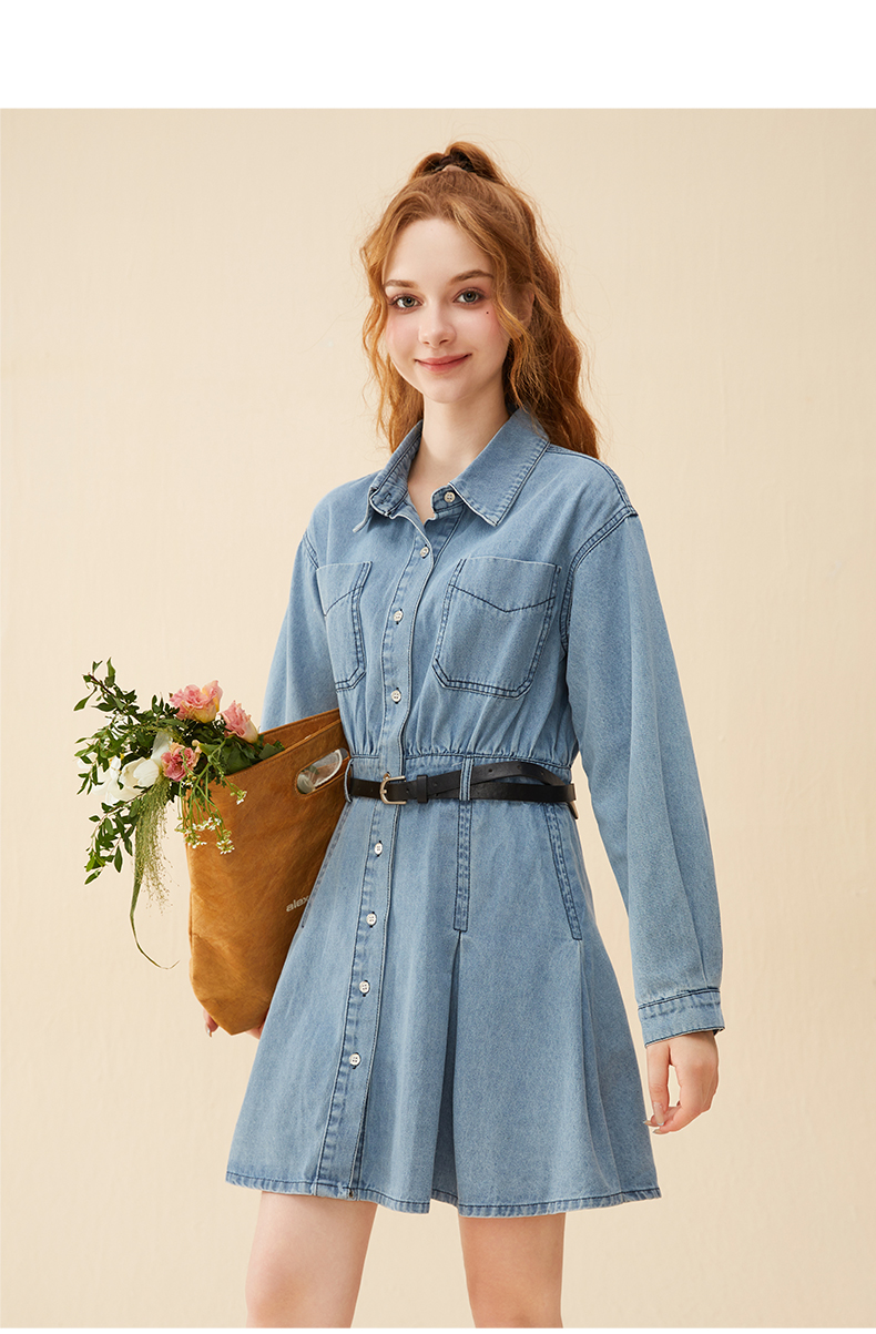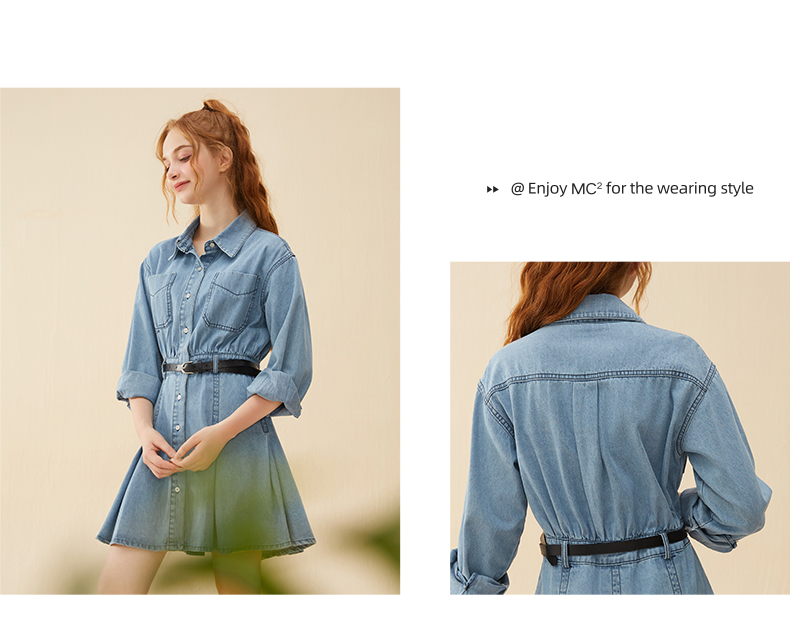 mc2蓝色牛仔连衣裙女2024春秋款复古风收腰显瘦长袖牛仔裙小个子