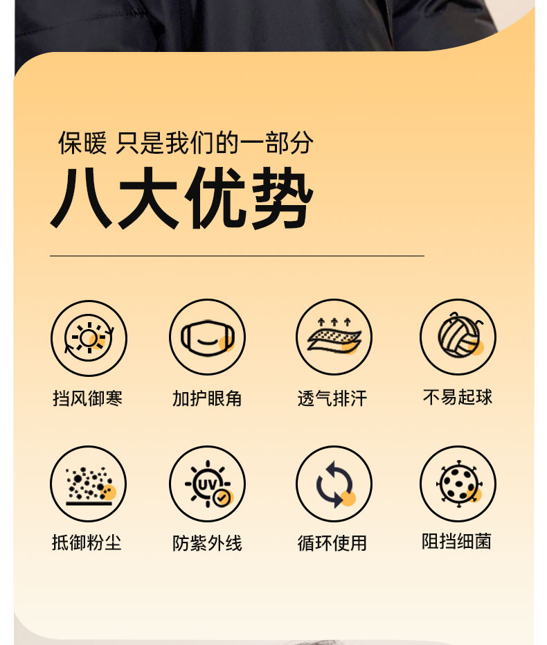 保暖防尘,隔绝空气粉尘杂志、减少空气中微生物刺激呼吸道