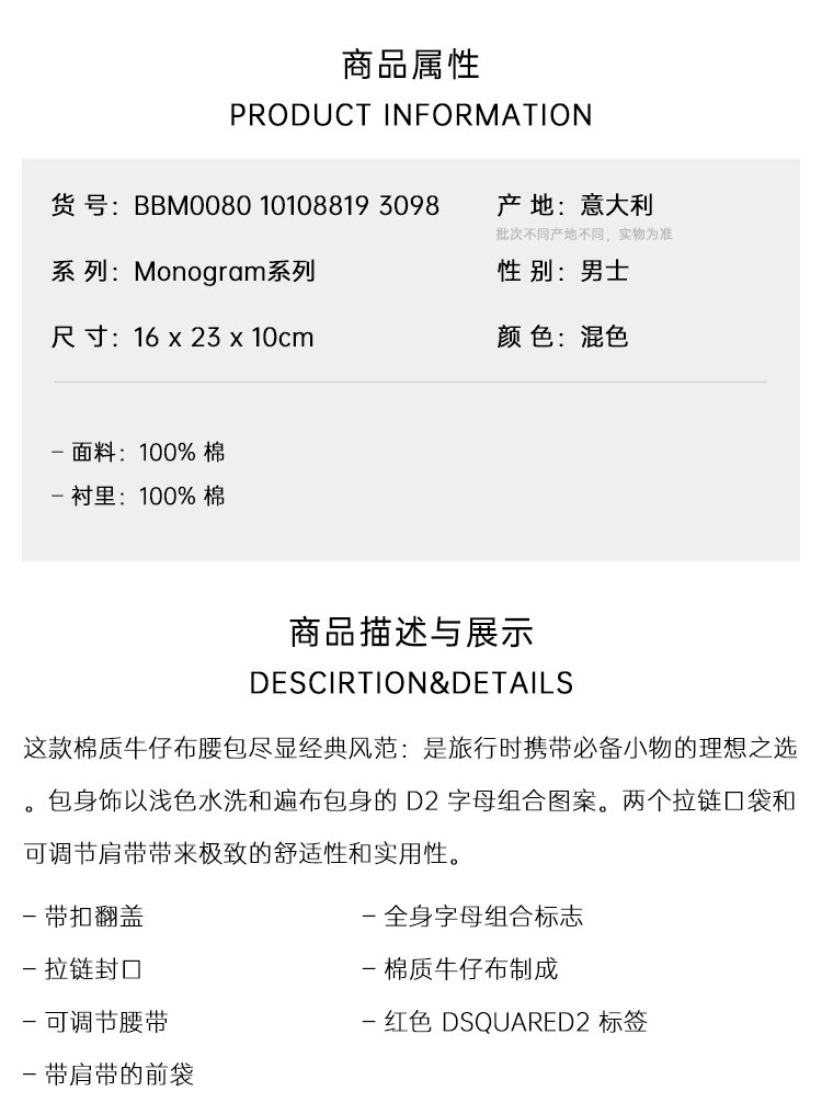 DSQUARED2 男士牛仔布全身字母徽标 Monogram 腰包 混色 BBM0080 10108819 3098