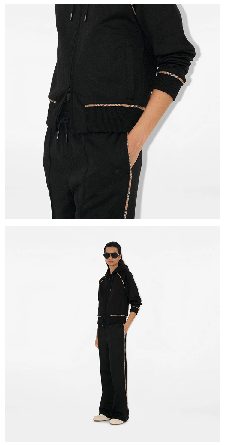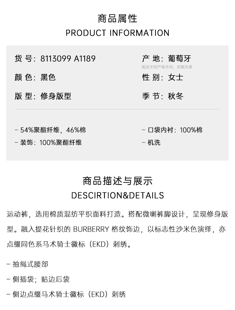 BURBERRY 巴宝莉 女士马术骑士徽标刺绣格纹装饰棉质混纺运动裤 黑色 8113099 A1189