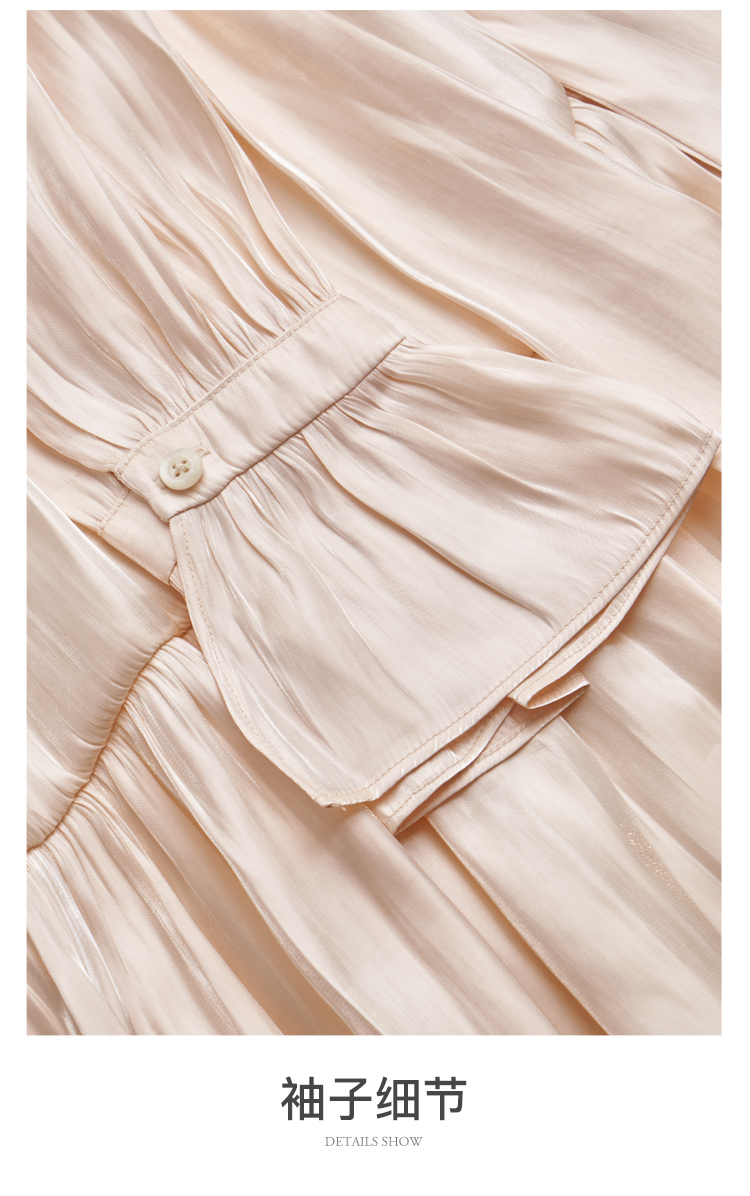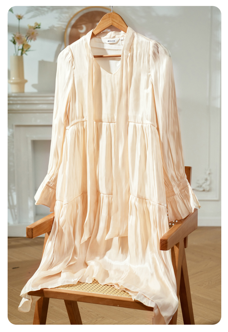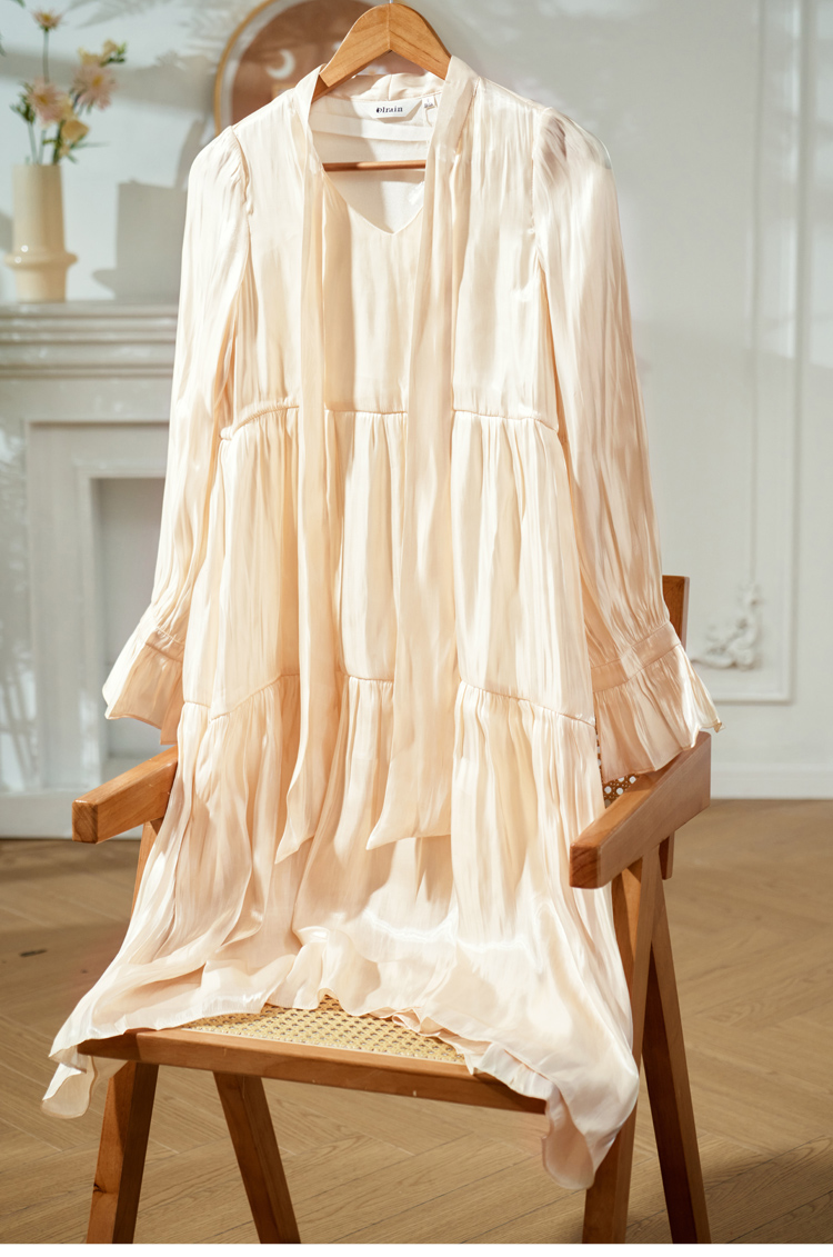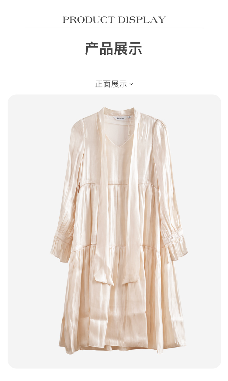 欧芮儿春新款长袖蝴蝶结V领连衣裙女中长款气质显瘦A字裙