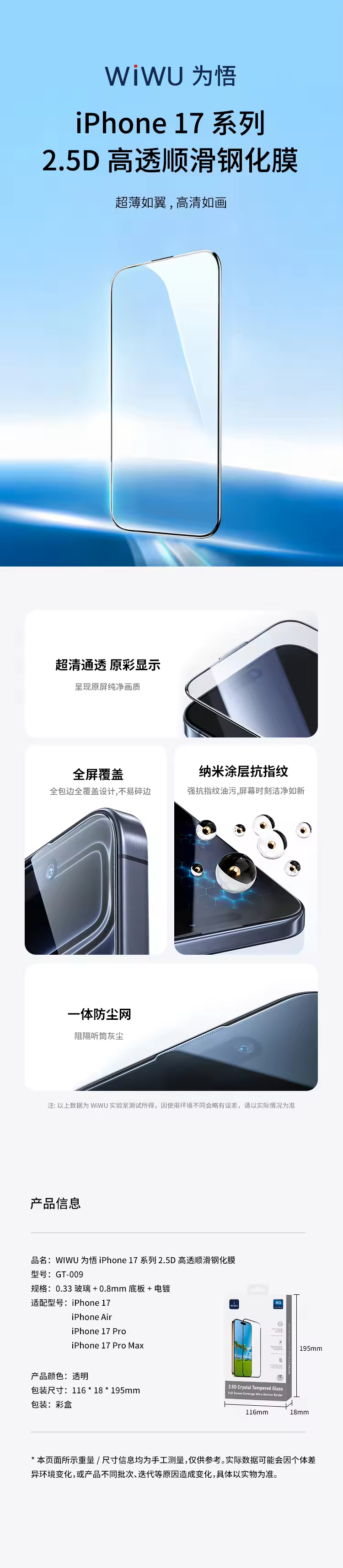 WIWU为悟 iPhone 17 系列 2.5D 高透顺滑钢化膜