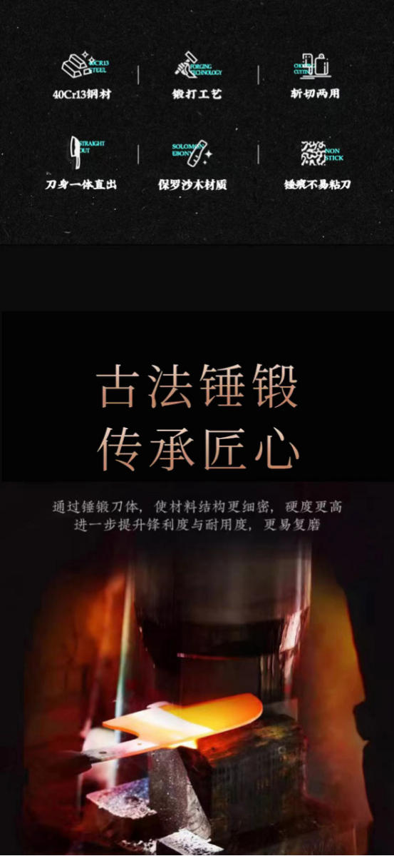 产品优势: 🔺选用南美好木【进口保罗沙木】制成刀柄,密度高硬度好,握感舒适,抗真菌不变形 🔺刀身一体成形,40Cr13优选好钢,斩切两用,手工研磨开刃,古法锤锻刀体不易粘刀 🔺易复磨,采用三重铆钉加固,锋利度超国家标准50%,耐用度远超国家标准108% 🔺黄金比例设计,刀身造型拥有黄金切割点,砍斩两用,厨房一步到位。