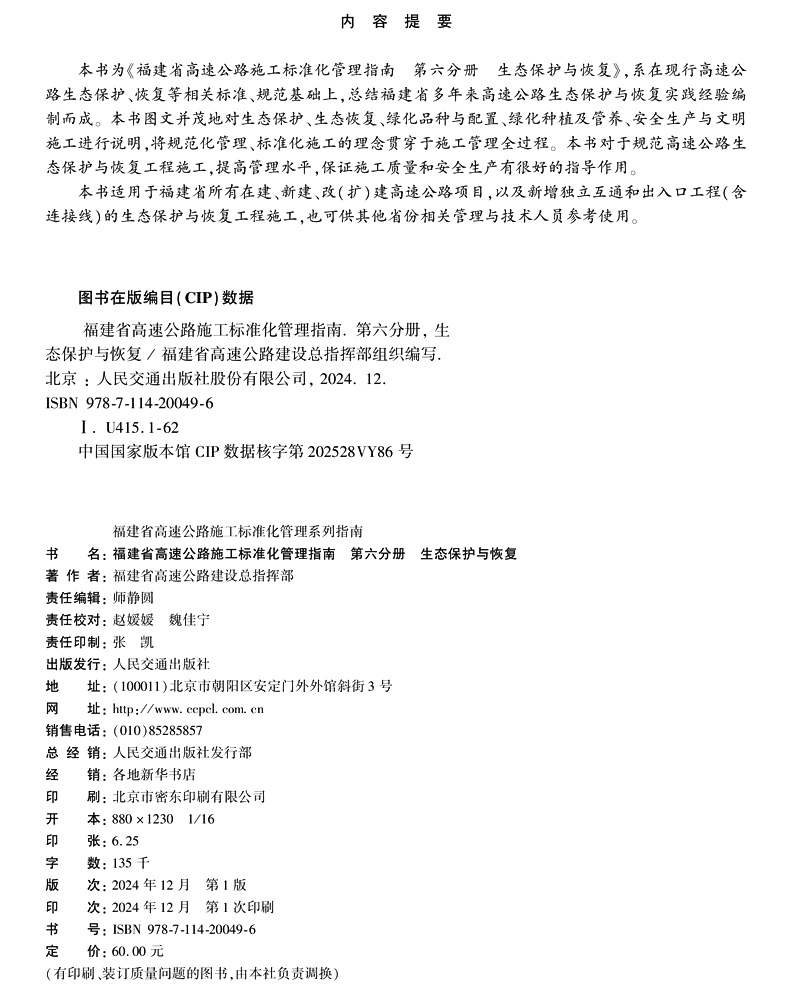 书名:福建省高速公路施工标准化管理指南 第六分册 生态保护与恢复