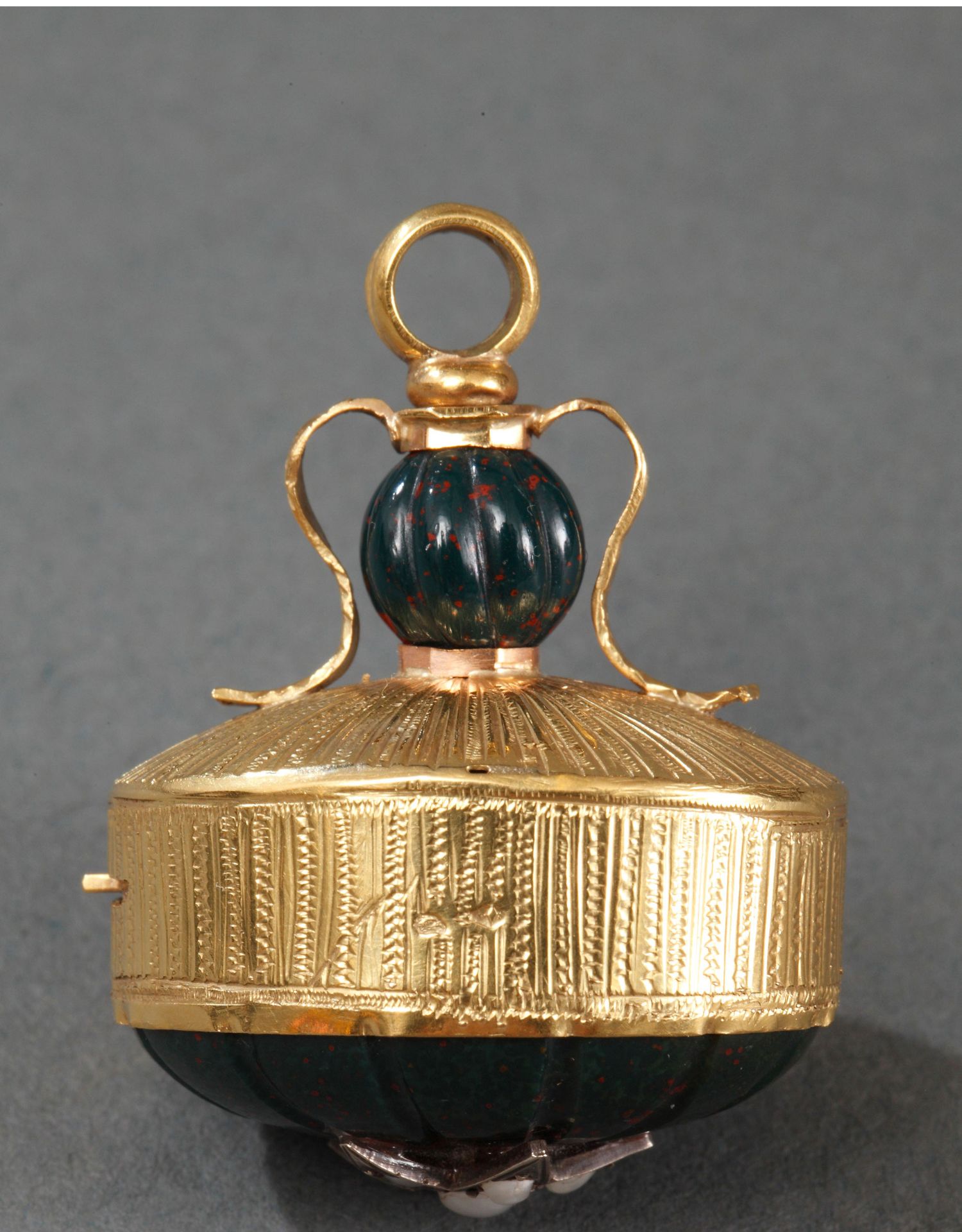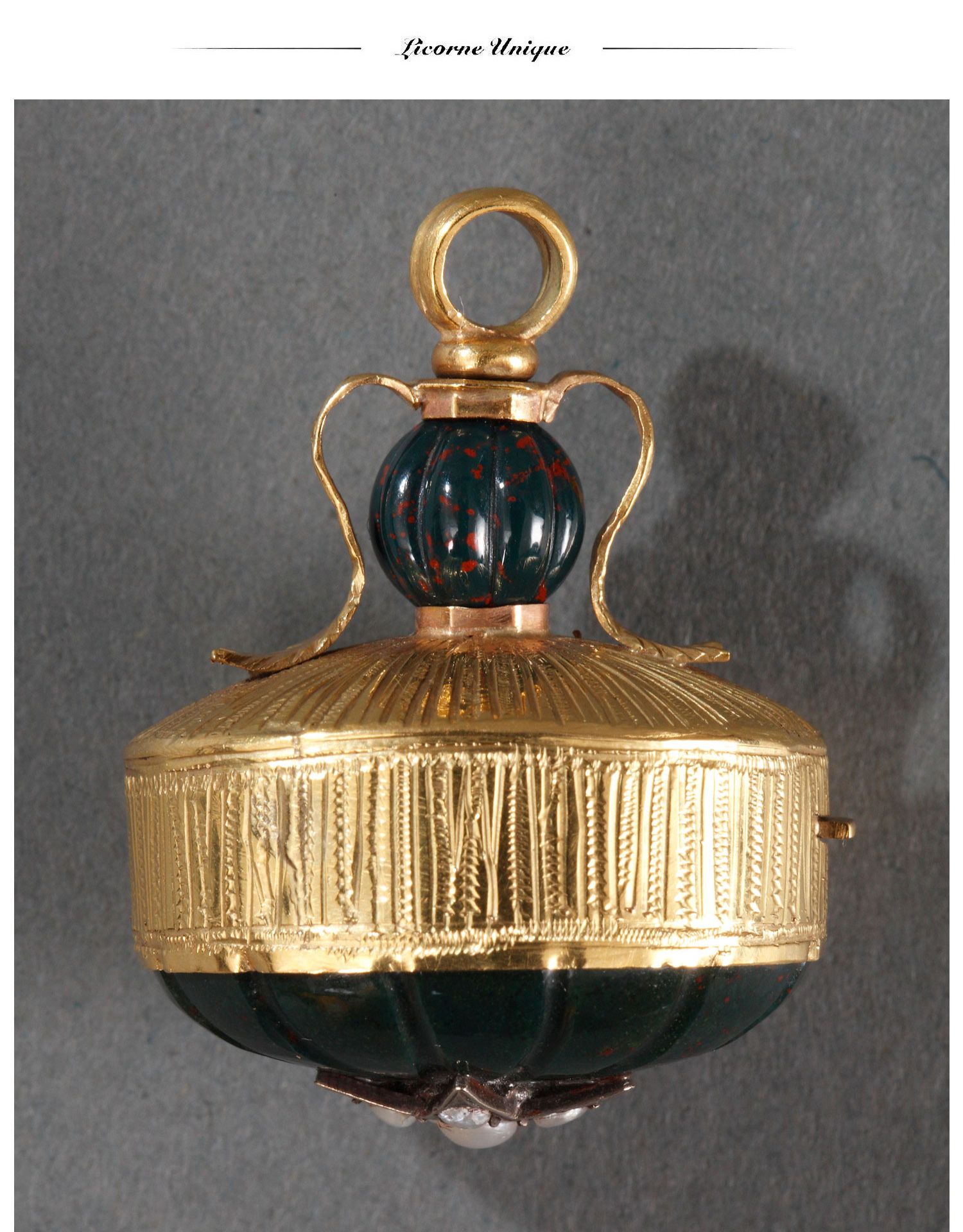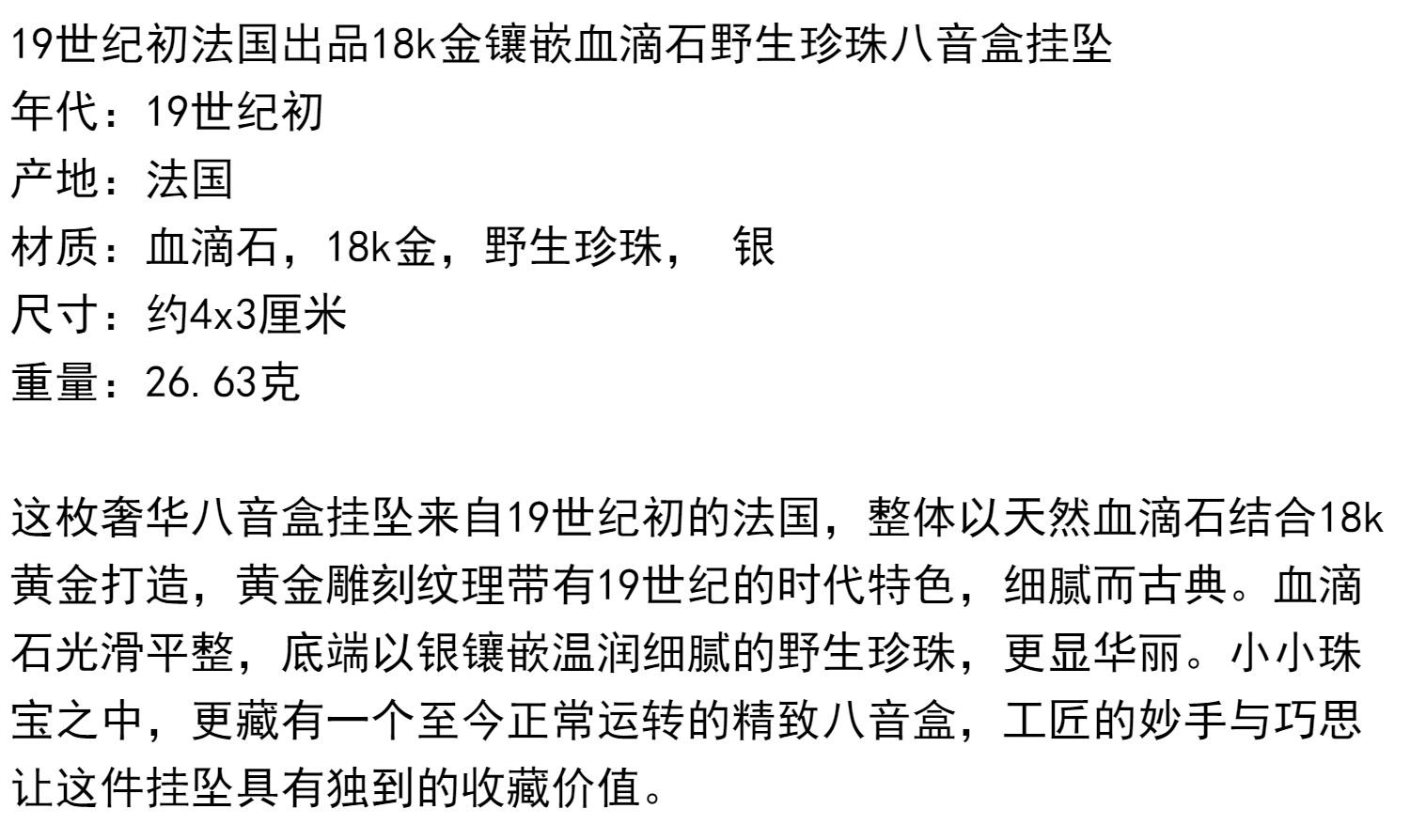独角鹿西洋古董法国18K金镶嵌血滴石野生珍珠八音盒挂坠