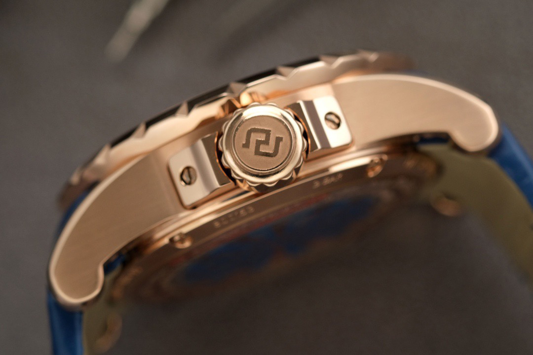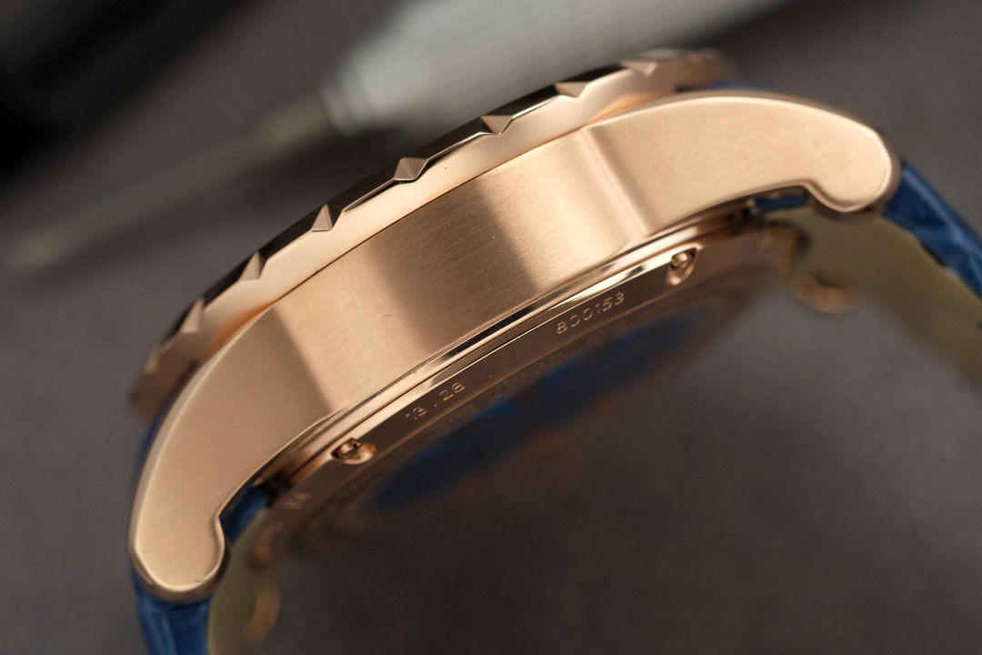 2.【壳套】整个表壳圆润适手,看似笨拙实则蕴含无数心血,圈口的三角坑纹需经大量CNC处理,在由资历老练的制表师一一修润。