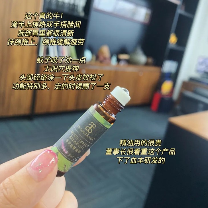还可以在头皮上沿着穴位滚,整个头皮都无比轻松;如果你颈椎不舒服,双手精油搓热后按压在颈椎,很快颈椎就能舒缓;当然,你还可以给孩子蚊虫叮咬后使用;戴着口罩容易有异味,把精油滴在口罩上,保证你三天,口罩都很清香,这个我亲测过,三天还留有清香;肚子和胃不舒服,搓热后在肚脐一圈涂三圈,分子很小,能进入身体排气。这就是纯正高级原液精油所带来的持久效果。
