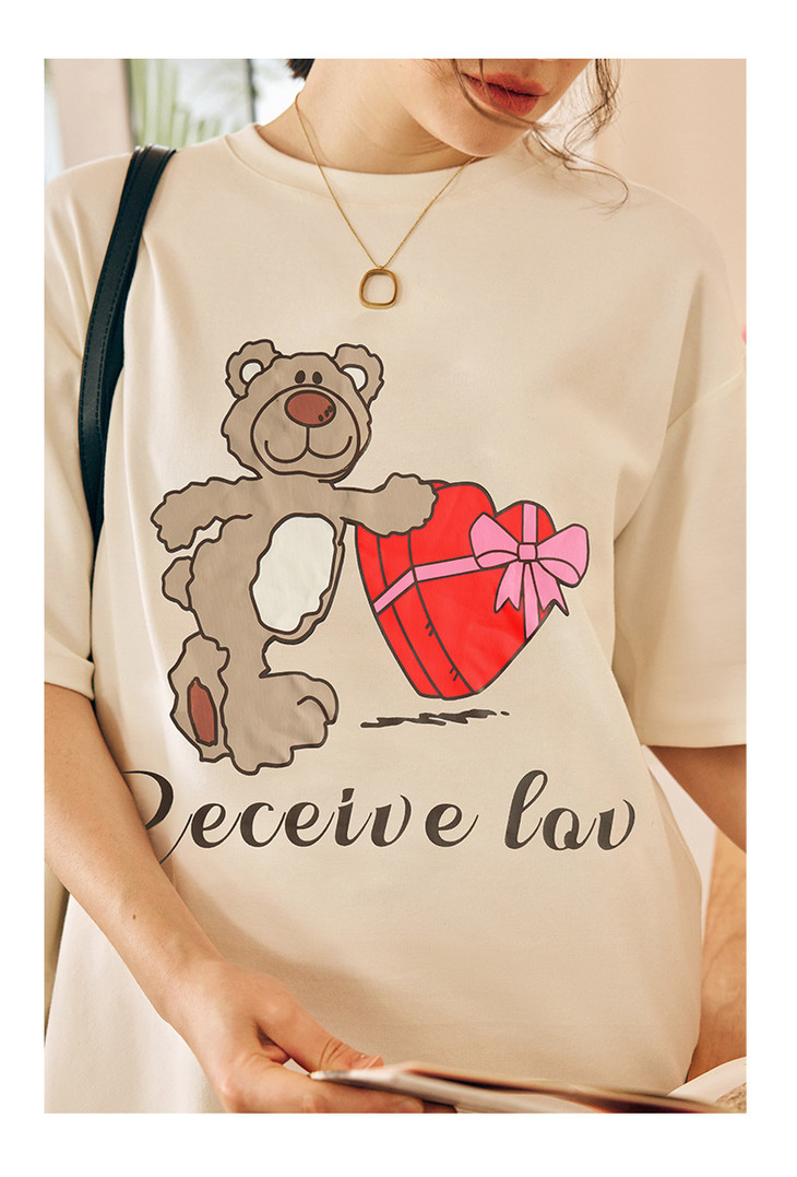 OLrain欧芮儿法式米白色短袖T恤女春季2023新款宽松小熊卡通上衣