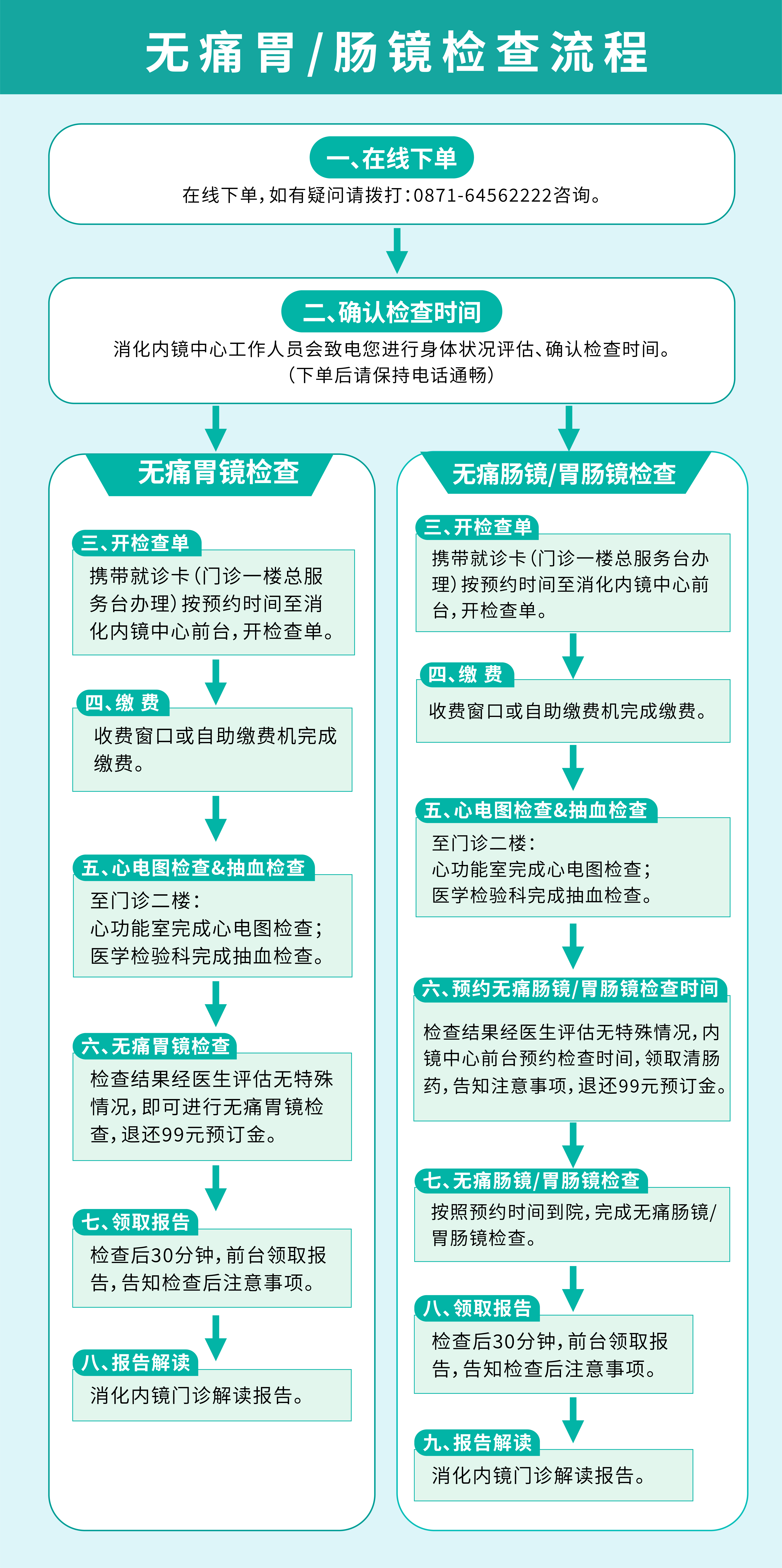 2、购买无痛胃/肠镜检查预订金后,无需到体检中心,需先进行预约(预约电话:0871-64562222),预约后按约定时间到门诊一楼内镜中心即可。