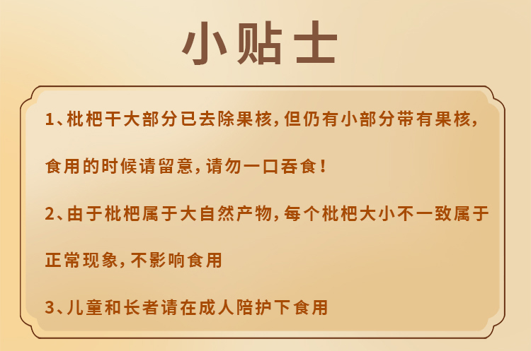 4.虽然枇杷干大部分已去核,但小部分带有小核,食用时请留意,介意者慎拍
