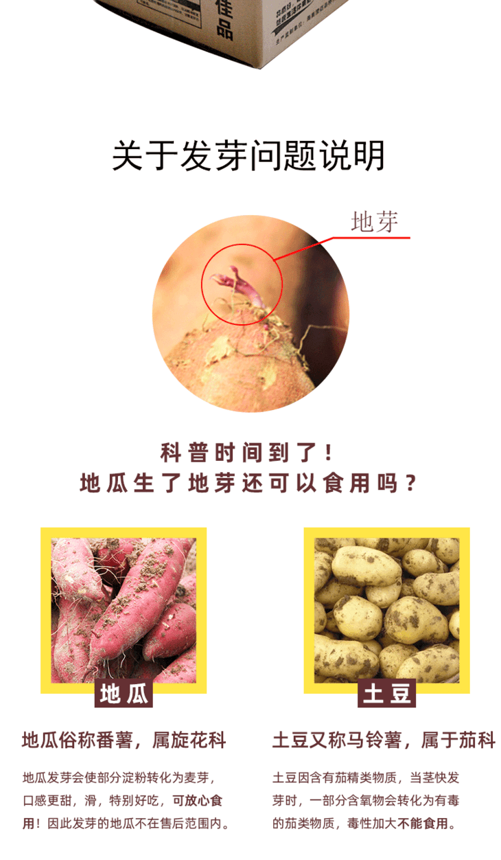 【产品产地】海南(地瓜属于番薯,属旋花科,随着温度升高,只要外界条件适宜的情况下,就会有发芽的可能,地瓜和土豆不一样,发芽的地瓜不会产生有害成分,不影响食用,介意谨慎下单。)