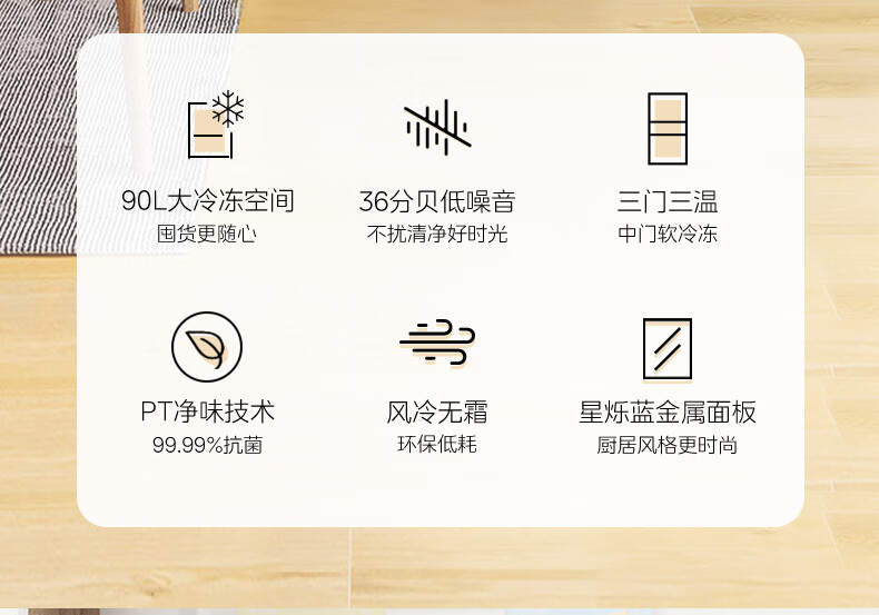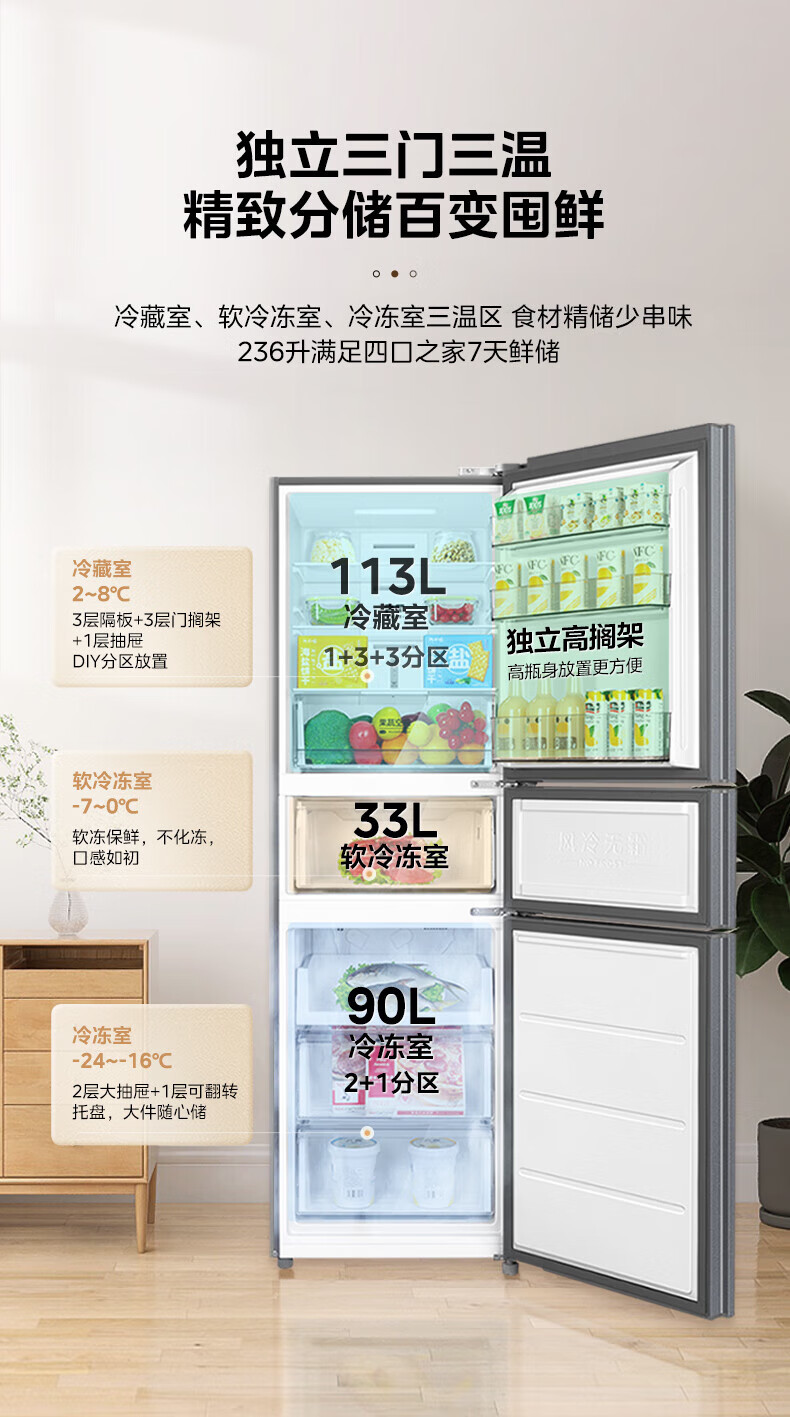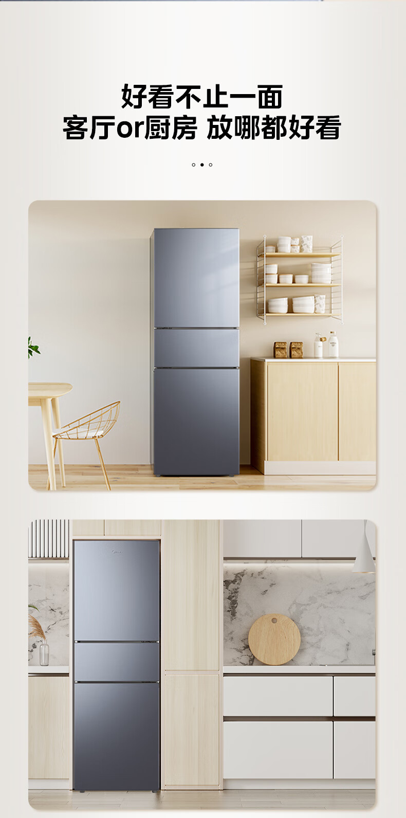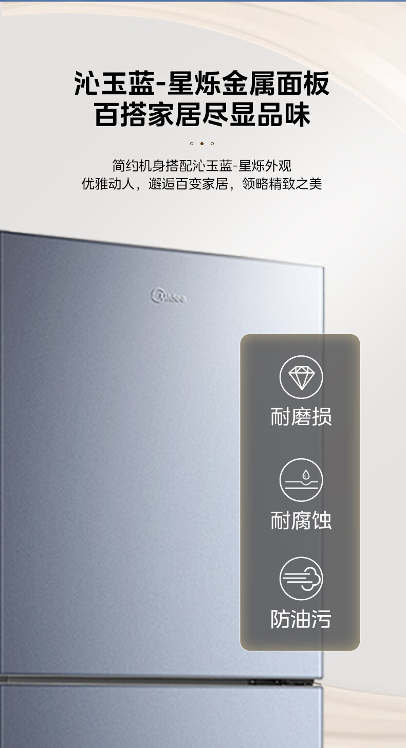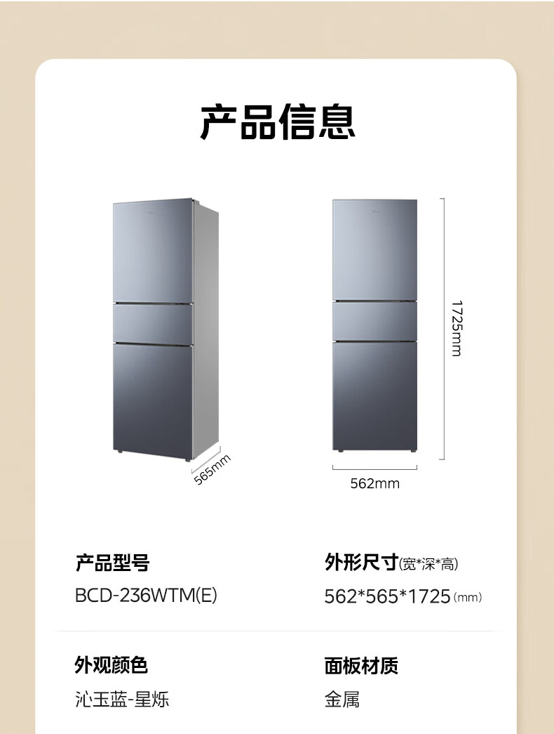 美的(Midea)236升三门家用电冰箱三开门小型冰箱风冷无霜节能省电净味保鲜租房小冰箱BCD-236WTM(E)沁玉蓝-星烁中门软冷冻