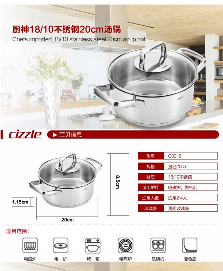 cizzle喜时【厨神】20CM不锈钢双耳汤锅 C0216