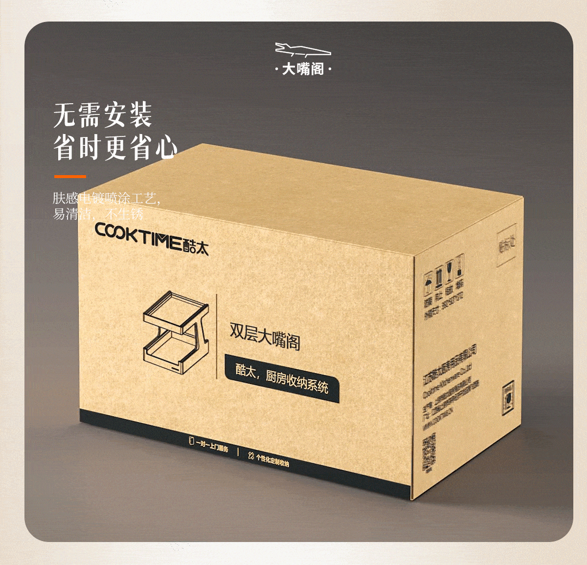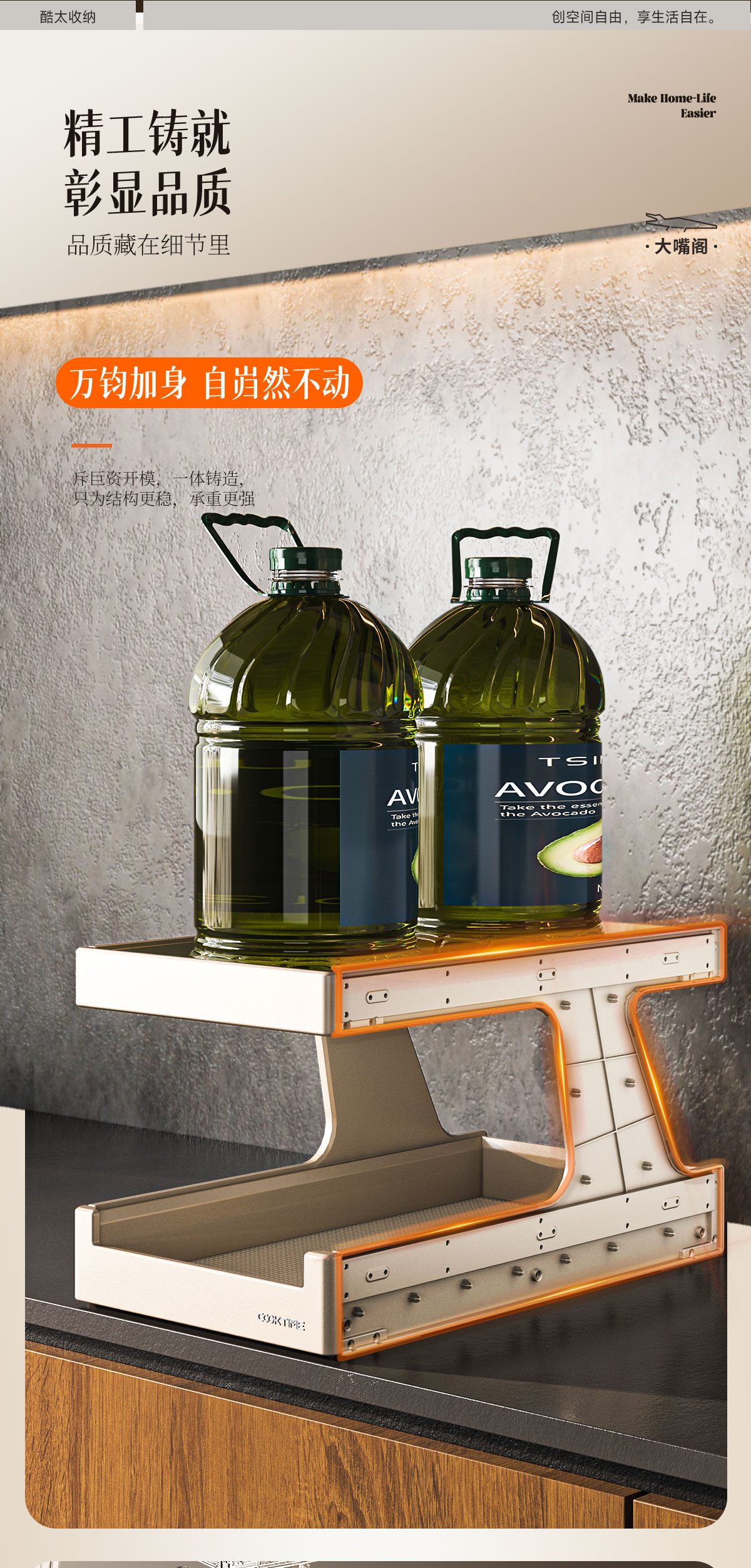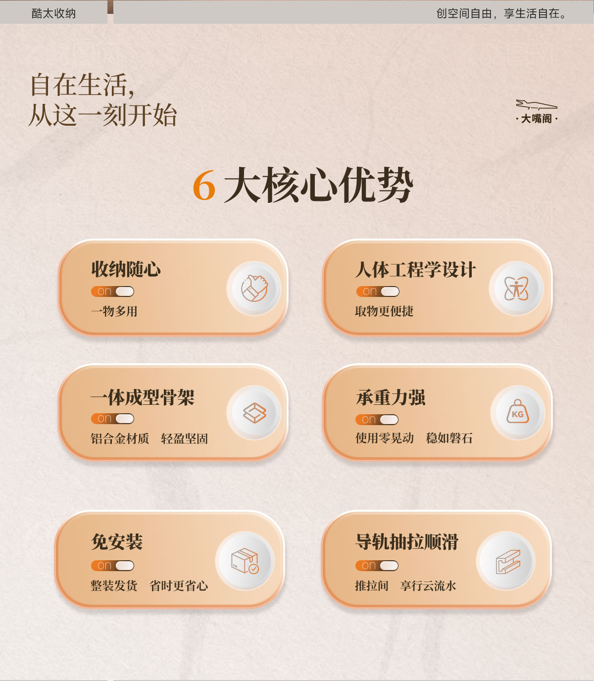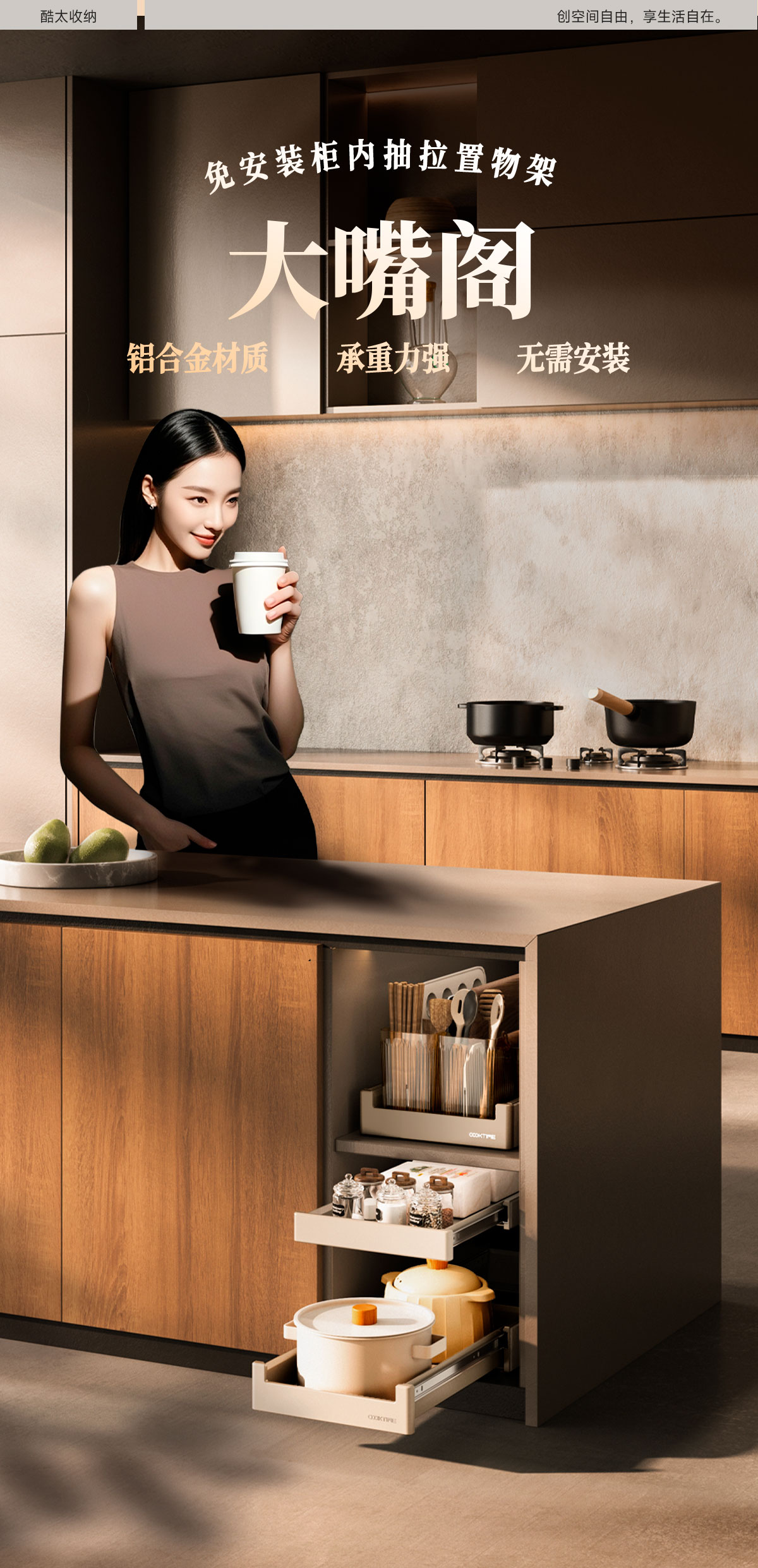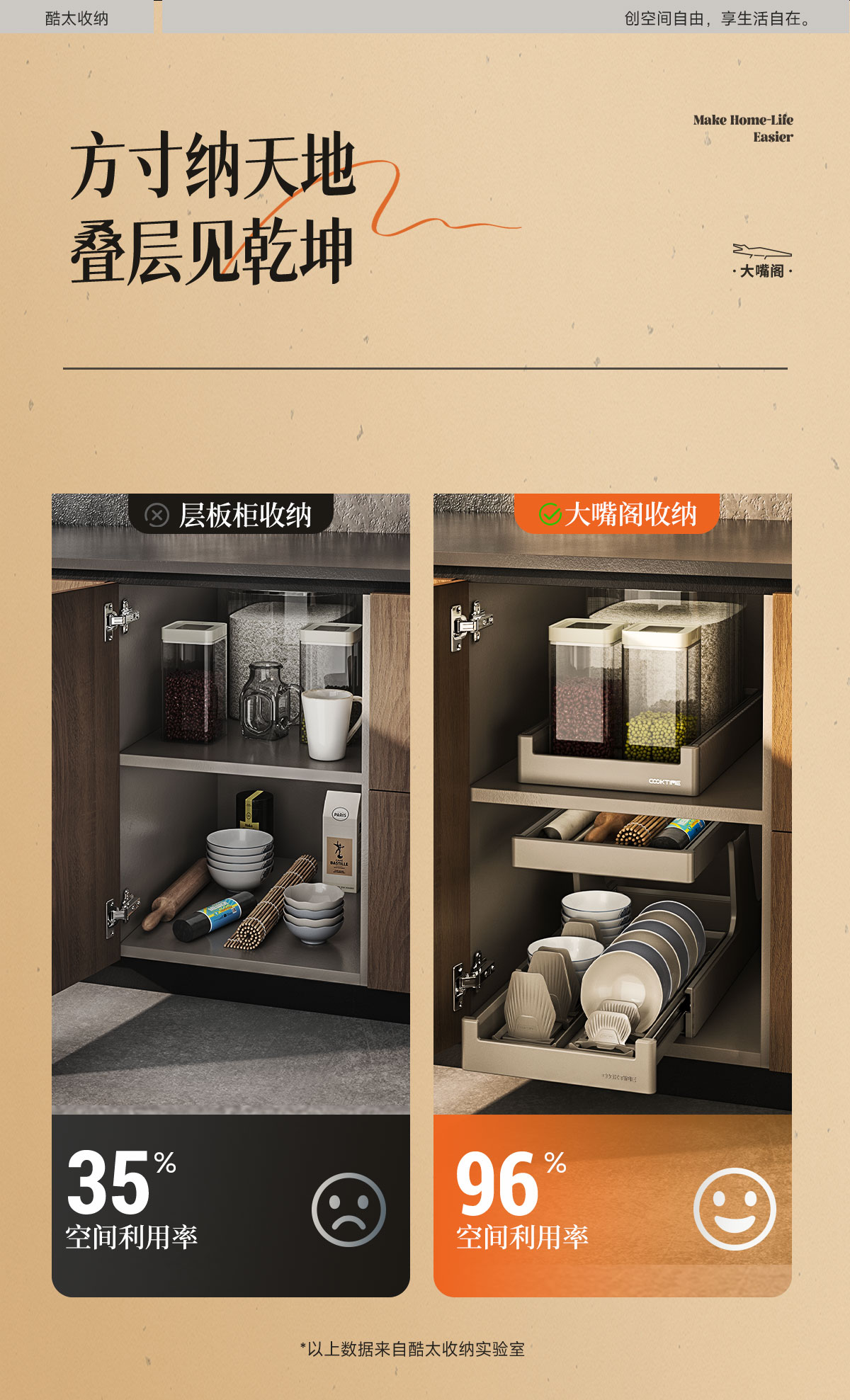 - 酷太坚持8年自主研发,已获得专利证书130项,拥有一套领先市场的厨房收纳系统,为千万中国家庭解决厨房脏乱差,缔造厨房新生活。