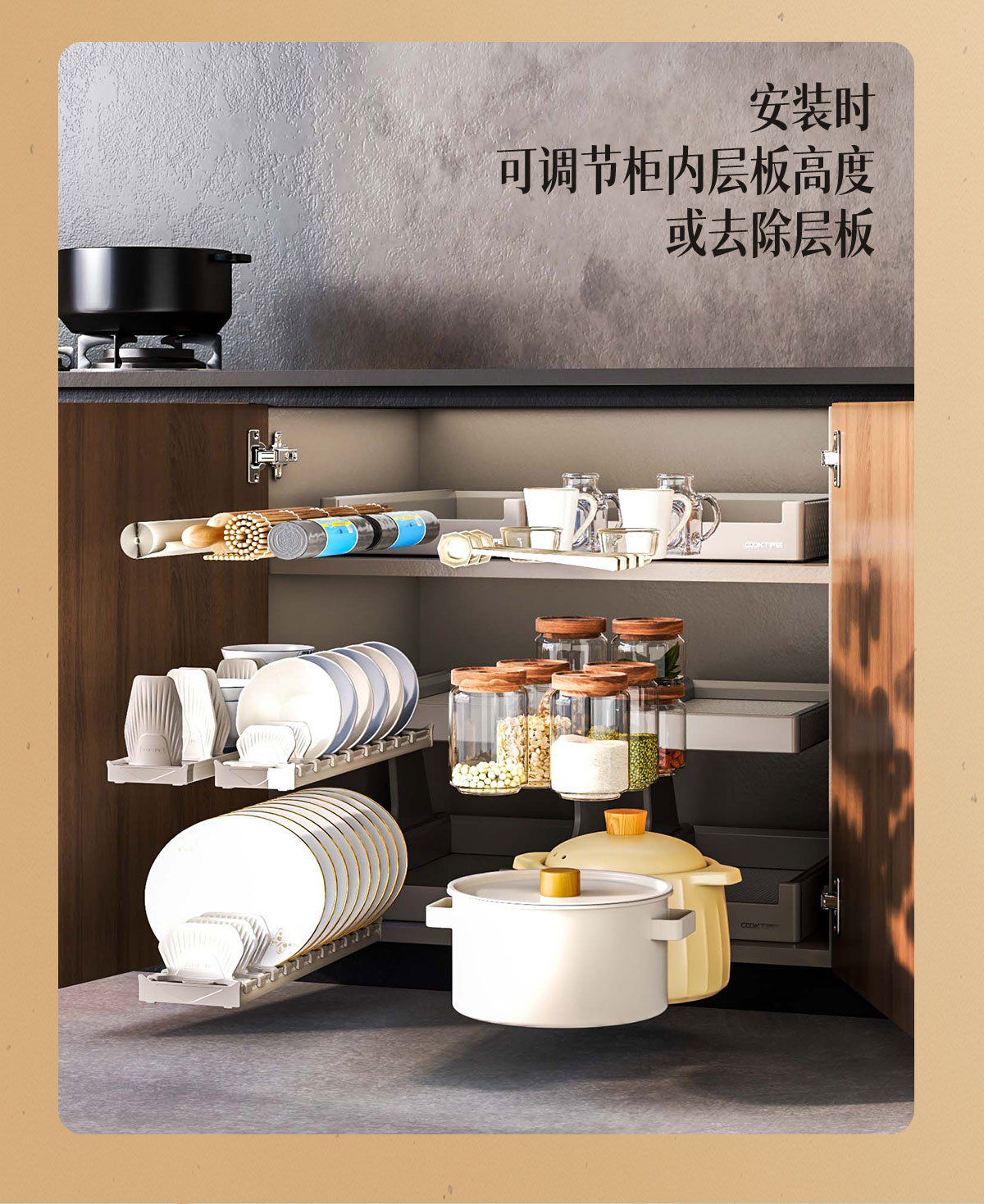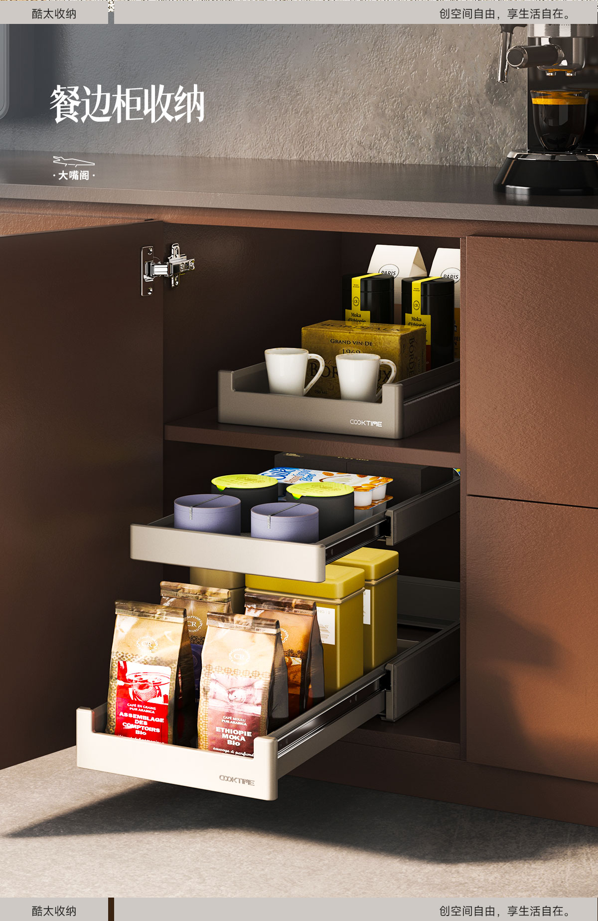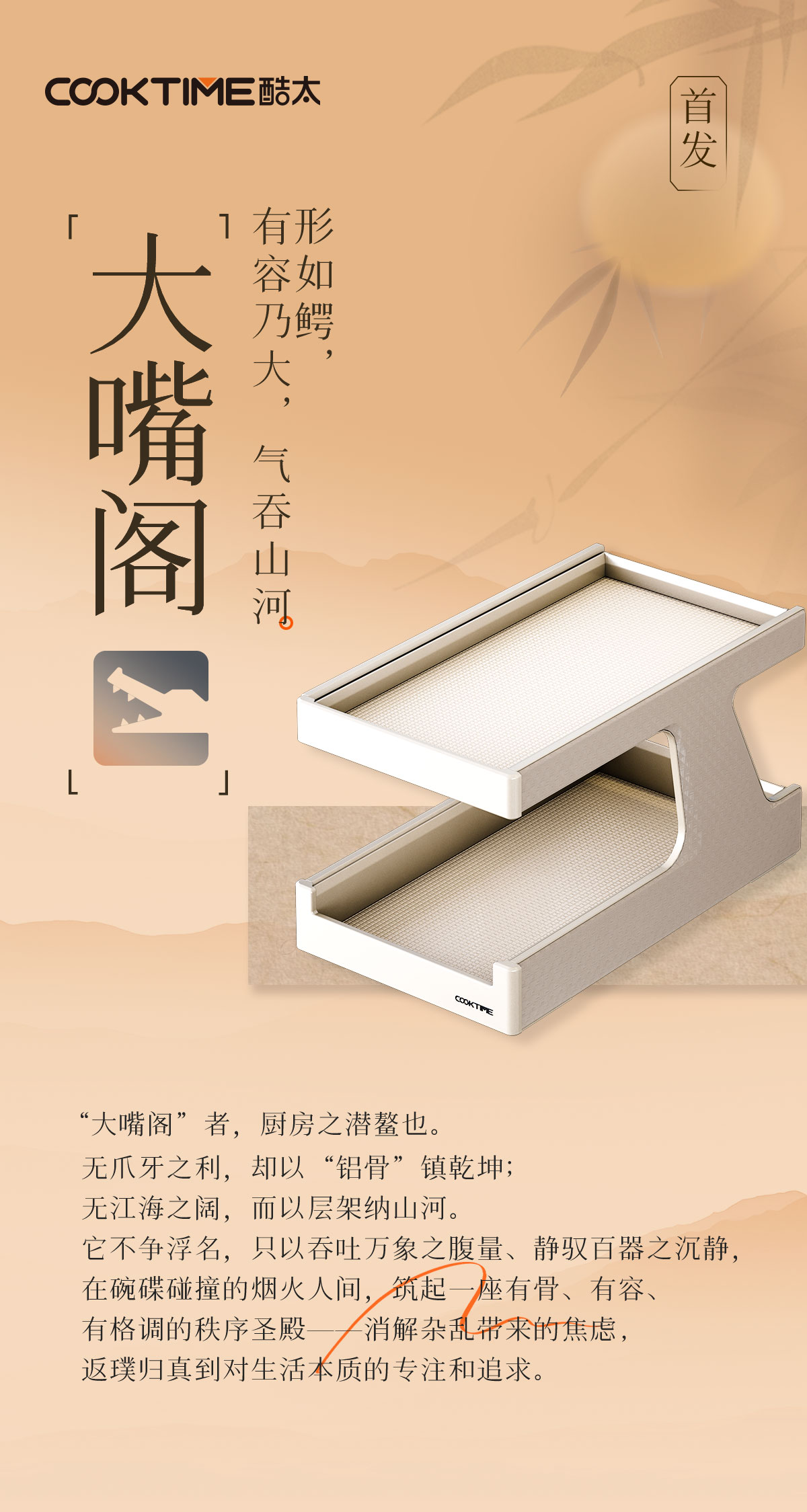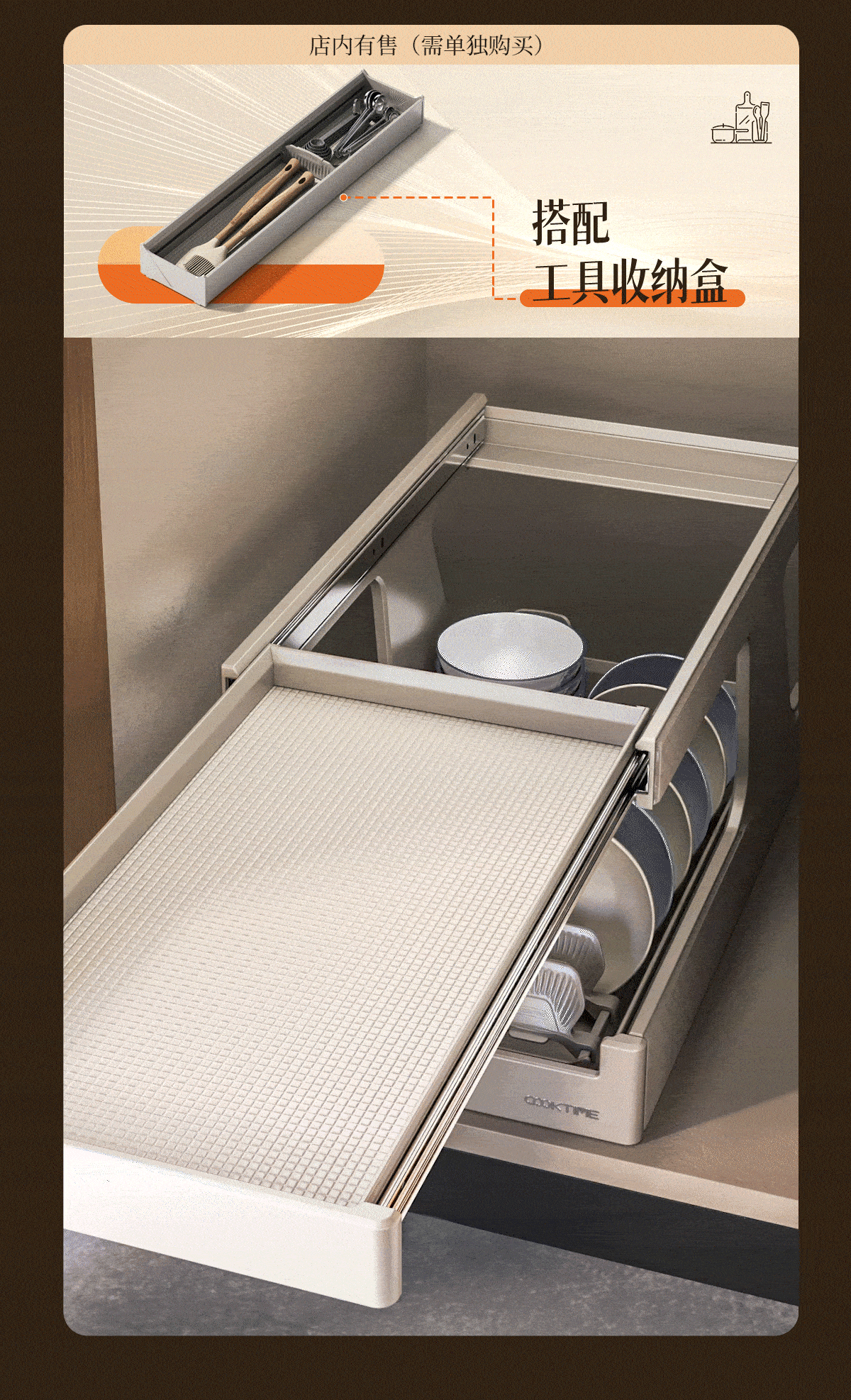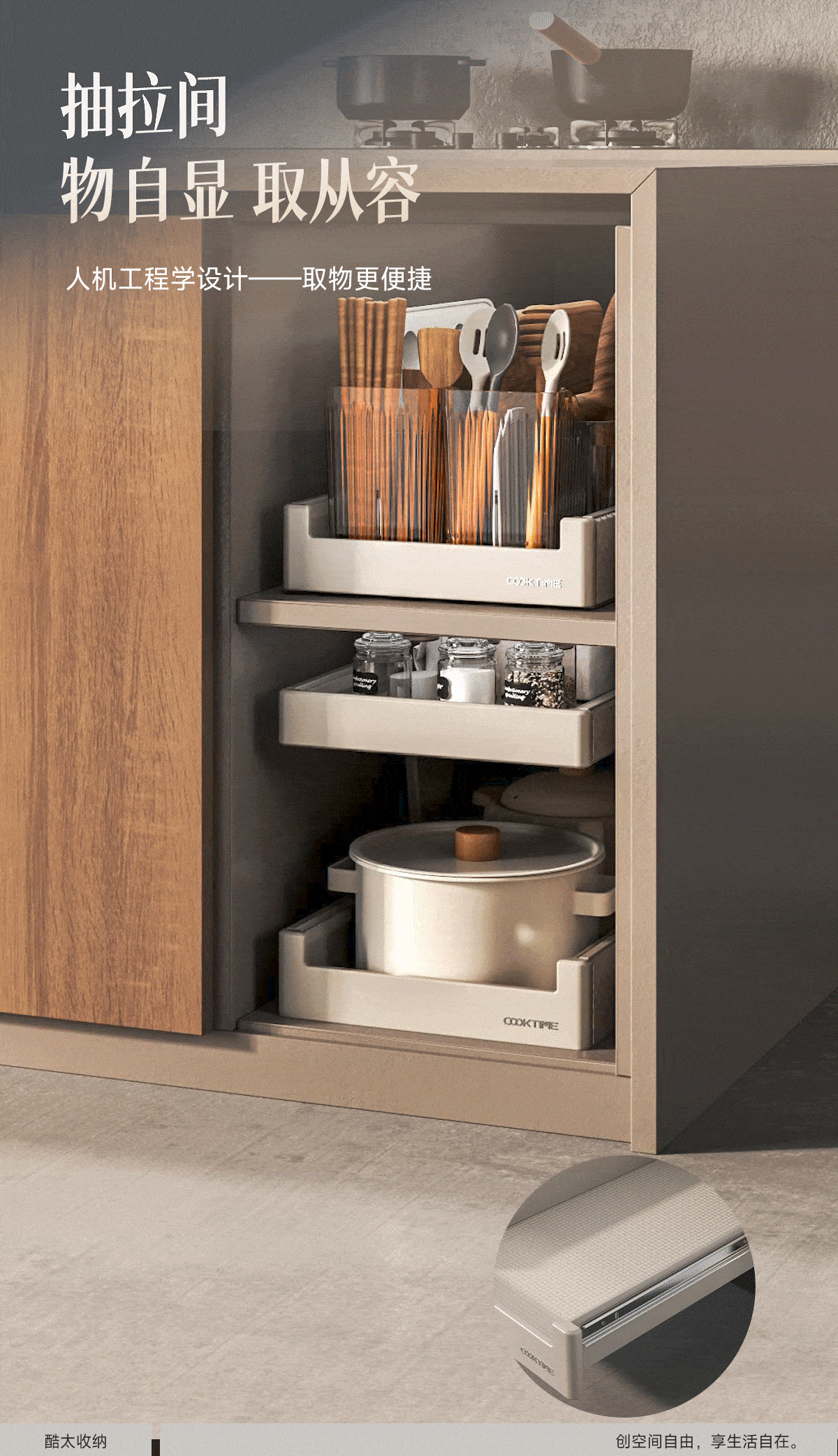 - 酷太坚持8年自主研发,已获得专利证书130项,拥有一套领先市场的厨房收纳系统,为千万中国家庭解决厨房脏乱差,缔造厨房新生活。