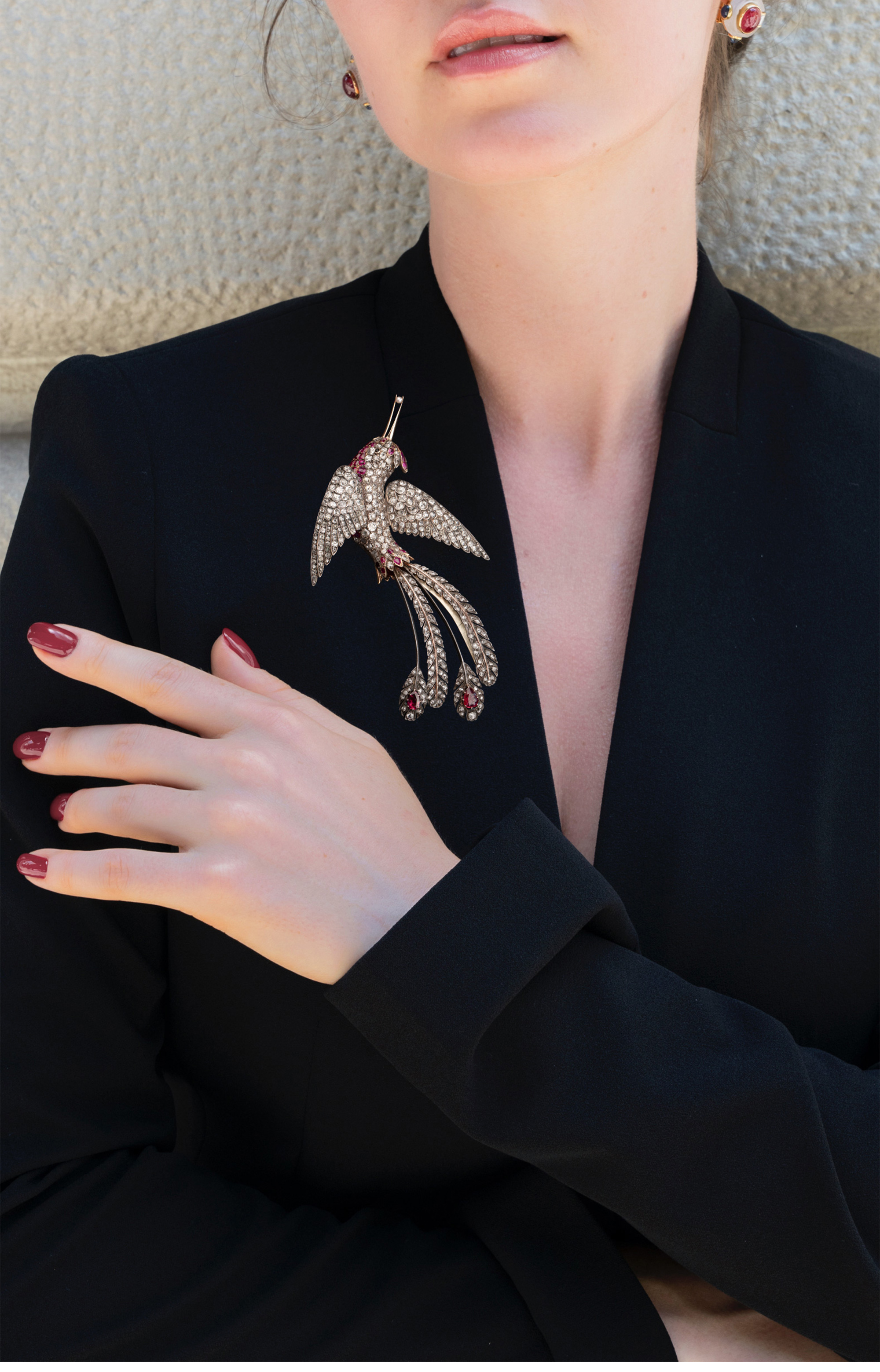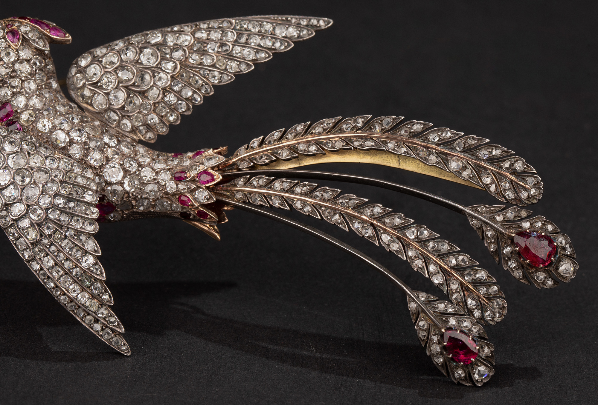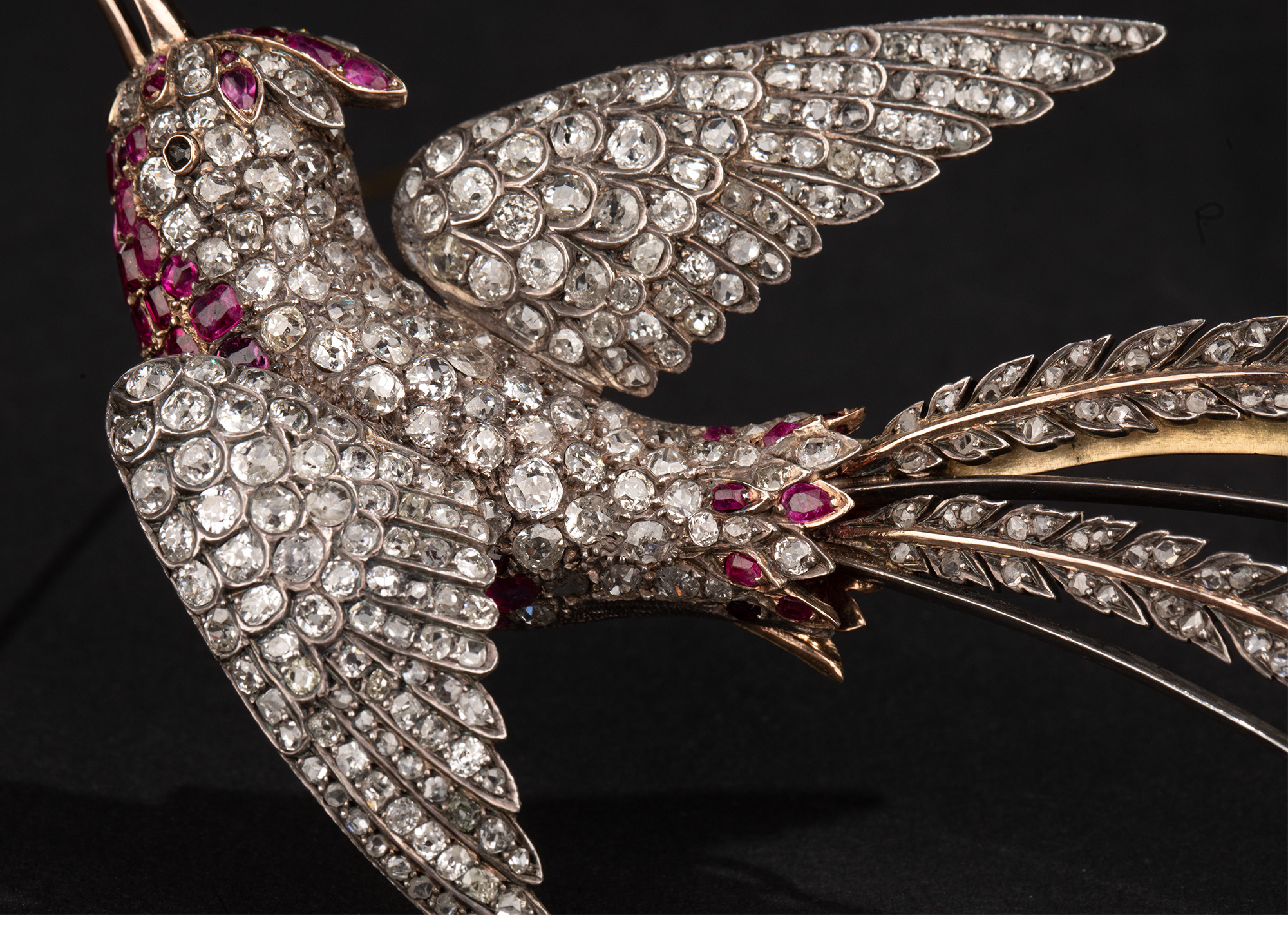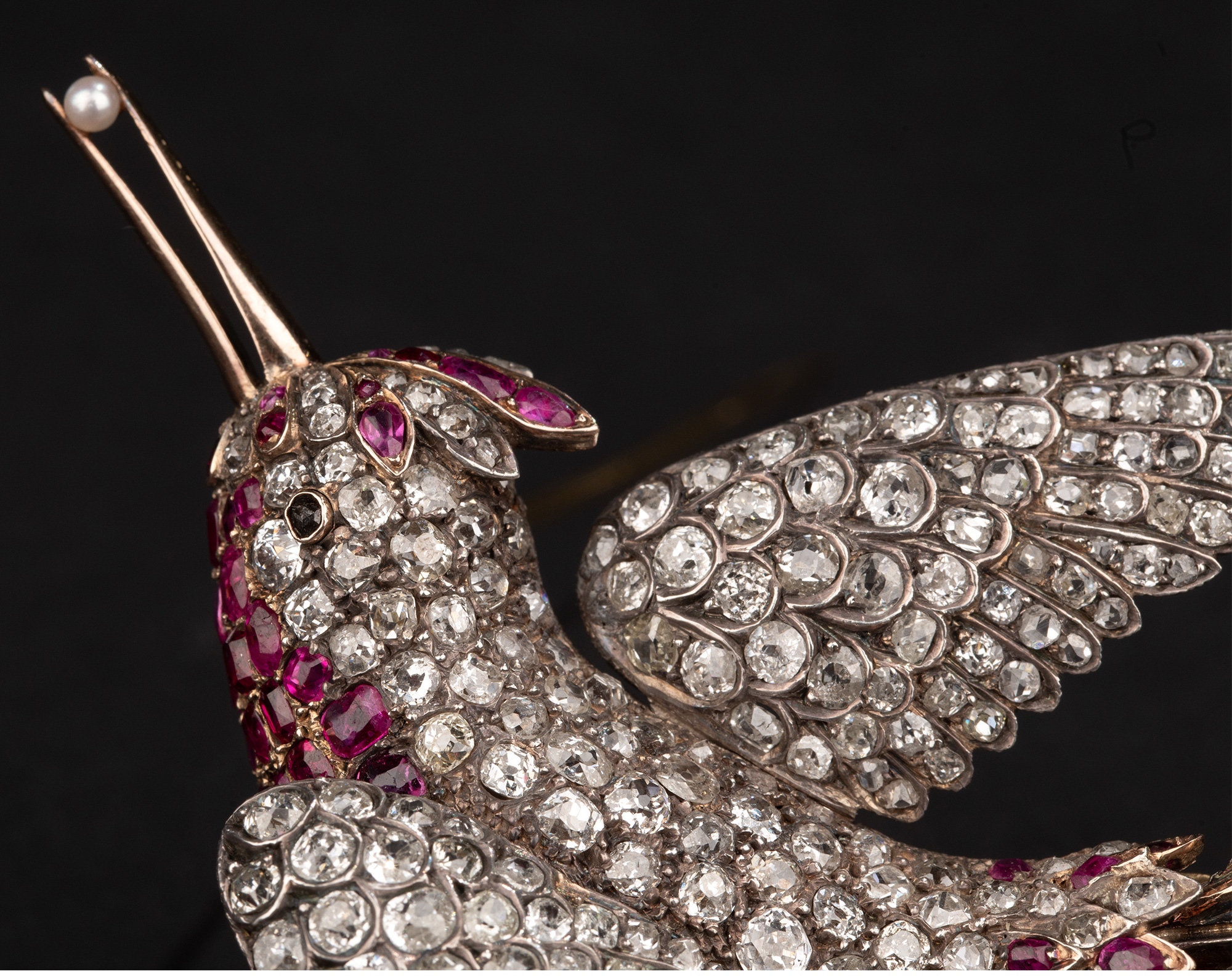 19世纪晚期法国出品「天堂鸟」造型金银叠打镶嵌老切钻石及红宝石珍珠胸针