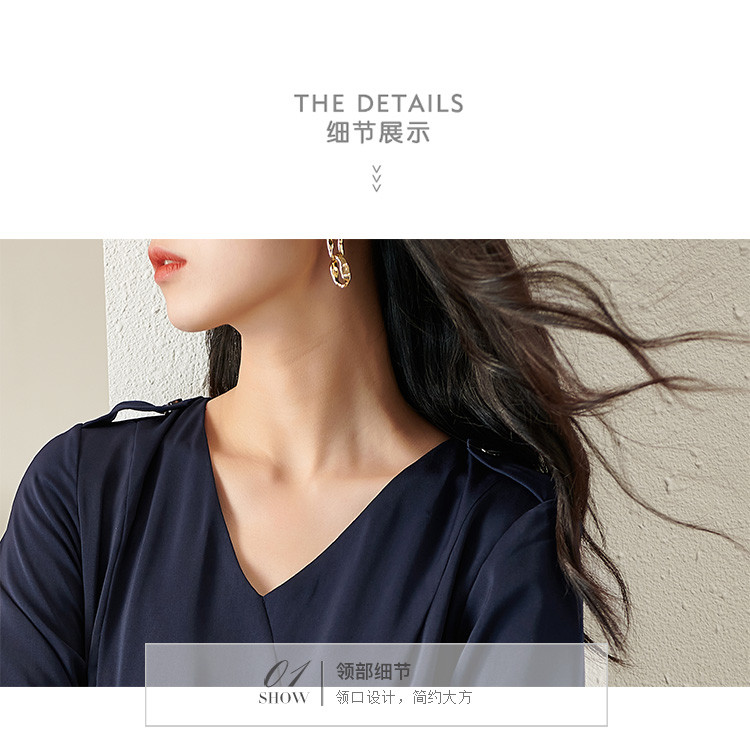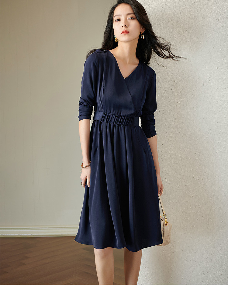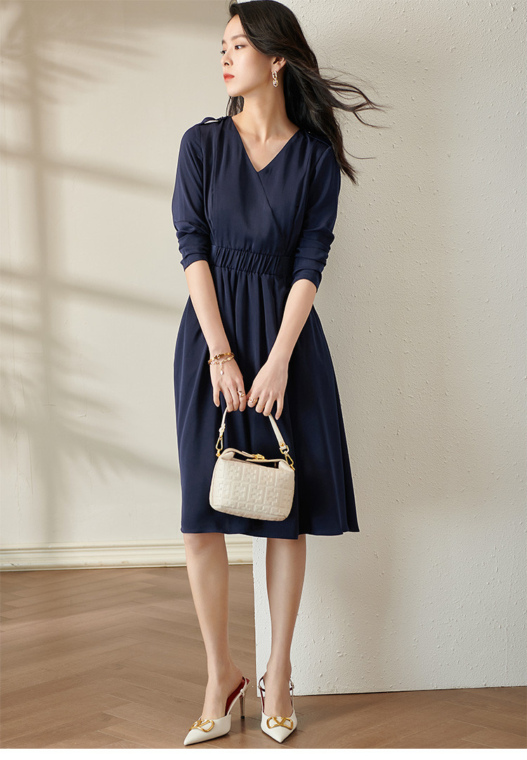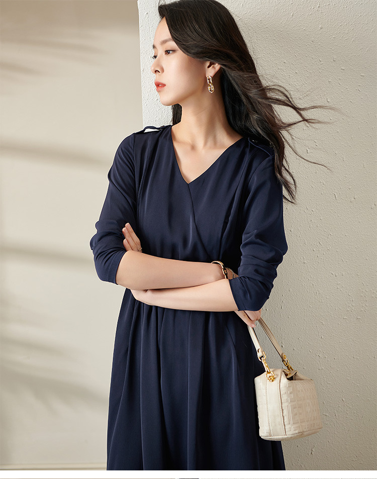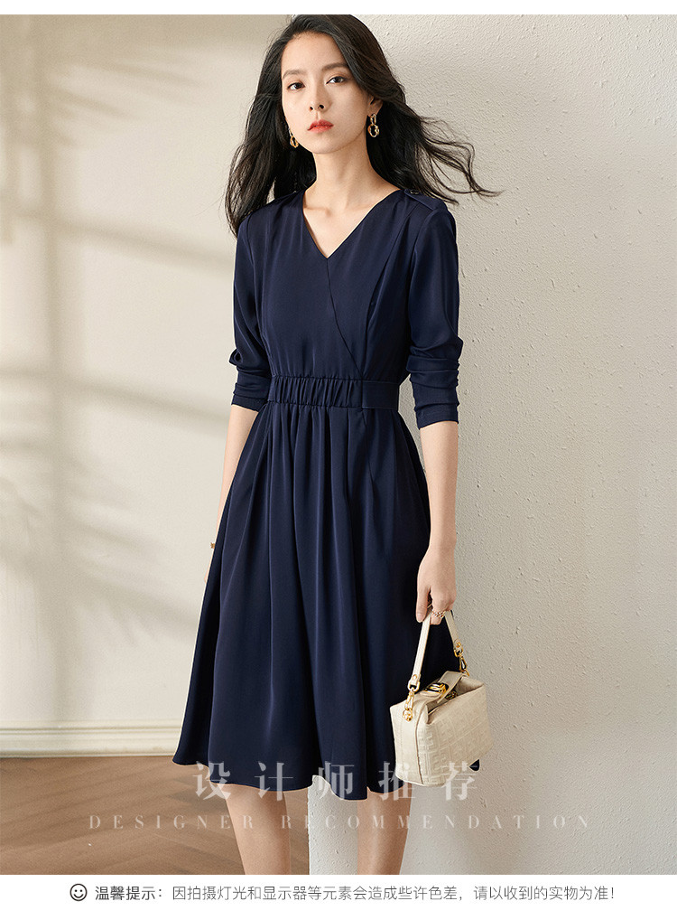 剩S/XL 芳外V领收腰裙2022新款秋季气质中长裙V领显瘦长袖连衣裙