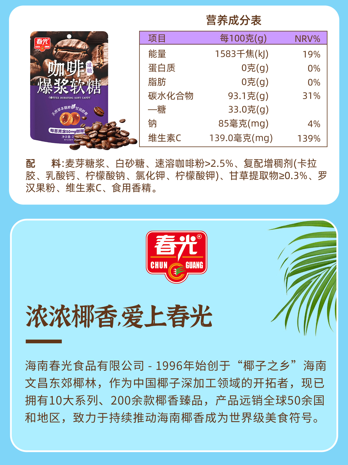 - 海南“著名手信品牌”春光食品,取材于海南椰子故乡,锁住北纬18°的新鲜美味。在这里,您能了解到春光食品旗舰店的最新优惠,享受优惠到不能说的价格。浓浓椰香,爱上春光!