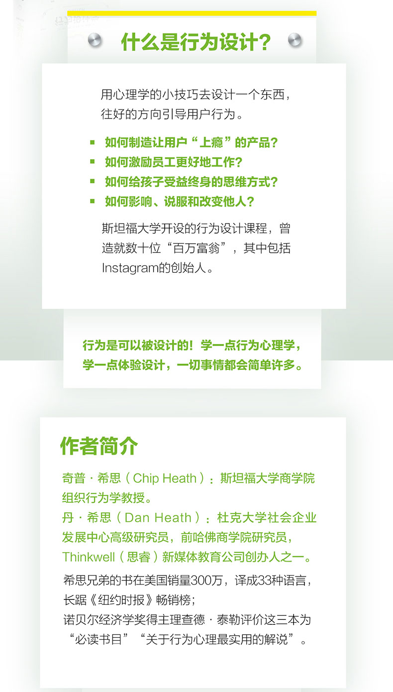 这是一本套路满满的书,里面有很多有趣、真实的故事。要知道,希思兄弟逻辑严密,技术含量和思维密集度非常高。如果他们两个研究“体验设计”,那基本上目前学术界所知道的,你能知道的,在这里了。
