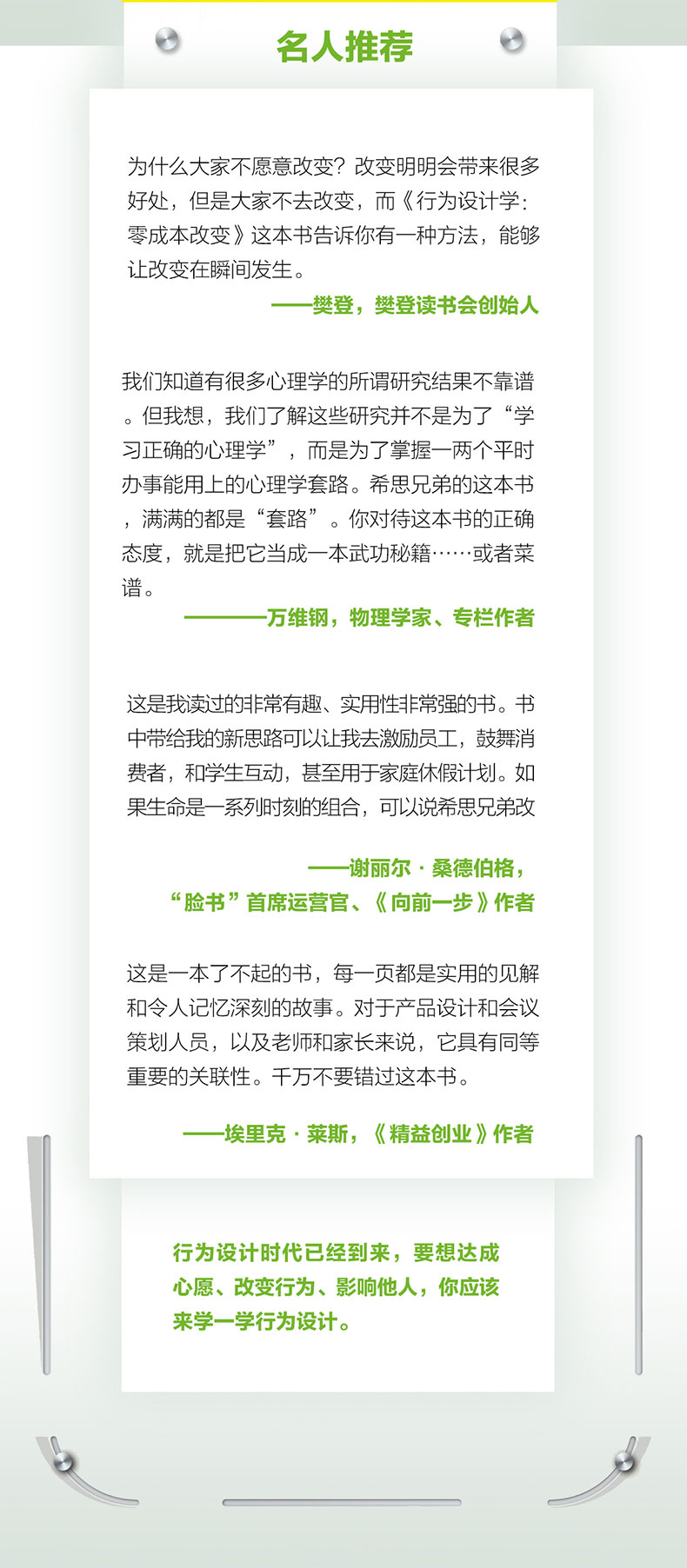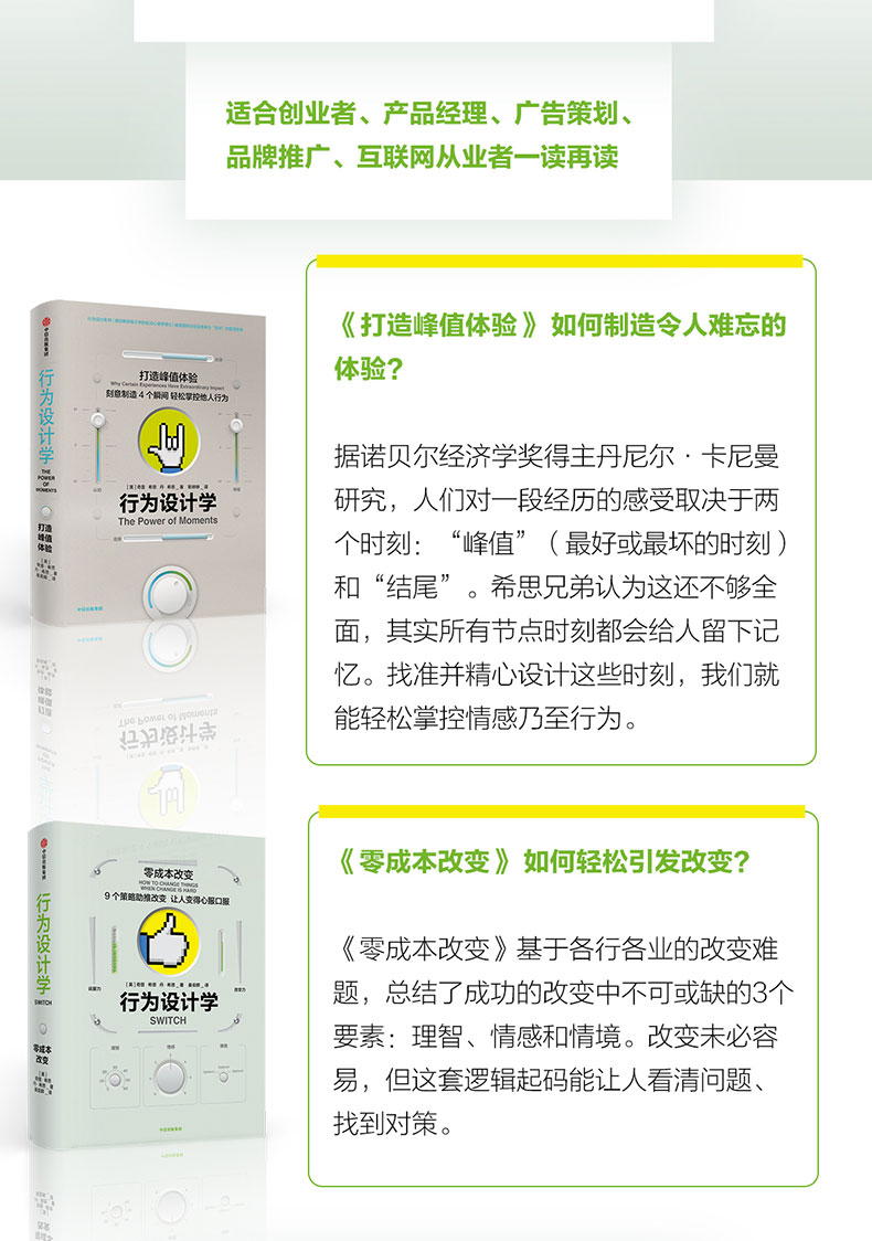 如果你曾经被《瞬变》和《让创意更有黏性》中简洁的方法震撼,就要读一下这本书。作者是非常少见的学术兄弟组合,他们擅长的事就是归纳和总结出有心理学依据的方法。对了,还有一本拥有同样风格的书叫作《疯传》,是这兄弟俩的学生写的。他们的方法,否则怎么每本书畅销?